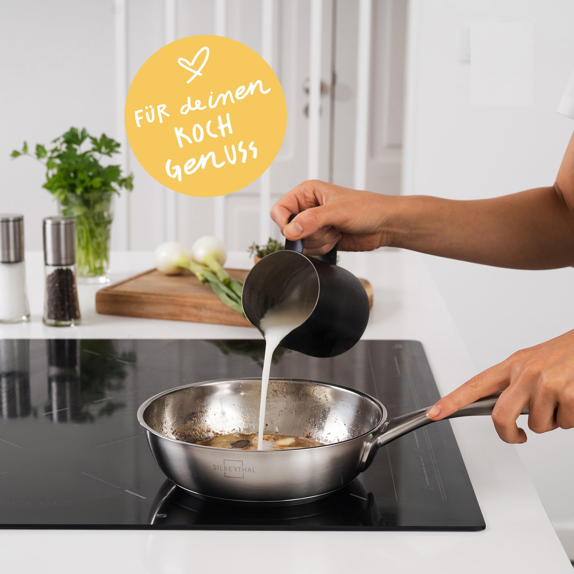 Kochen ist mehr als ein täglicher Routineakt – es ist Genuss, Kreativität und ein schönes Miteinander. Unsere unbeschichtete 28‑cm‑Pfanne verwandelt jede Brateinheit in ein genussvoll‑spielerisches Erlebnis. Dank des dreilagigen Bodens verteilst du Hitze schnell und gleichmässig – so entsteht die perfekte Kruste beim Anbraten. Geeignet für Induktion, Gas, Elektro und Ofen bis 400 °C – ohne Leistungsabfall. Der griffige, kühle Stiel und der Schüttrand machen Giessen präzise und sauber. Hochwertiger Edelstahl 18/10, BPA‑ und LFGB‑zertifiziert, keine Plastikverpackung – wir setzen auf Nachhaltigkeit und Wertigkeit. Für alle, die im Alltag Genuss mit qualitativer Küche verbinden wollen.