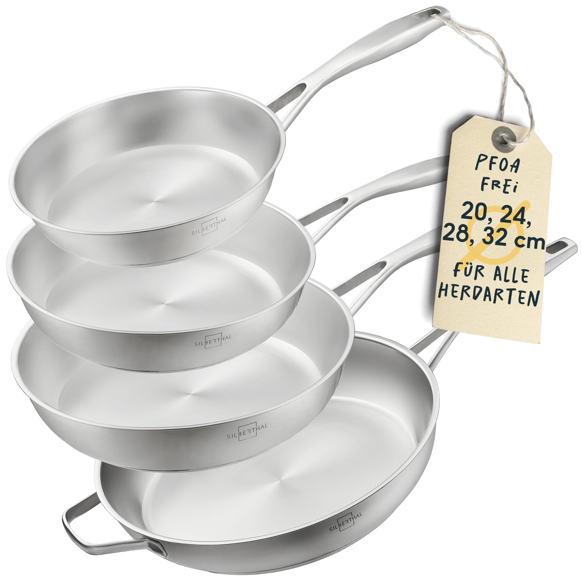SILBERTHAL Pfannen Set 4 teilig - Edelstahlpfanne Unbeschichtet - 20, 24, 28 & 32 cm - Induktionsgeeignet - Backofenfest bis 400° und spülmaschinengeeignet