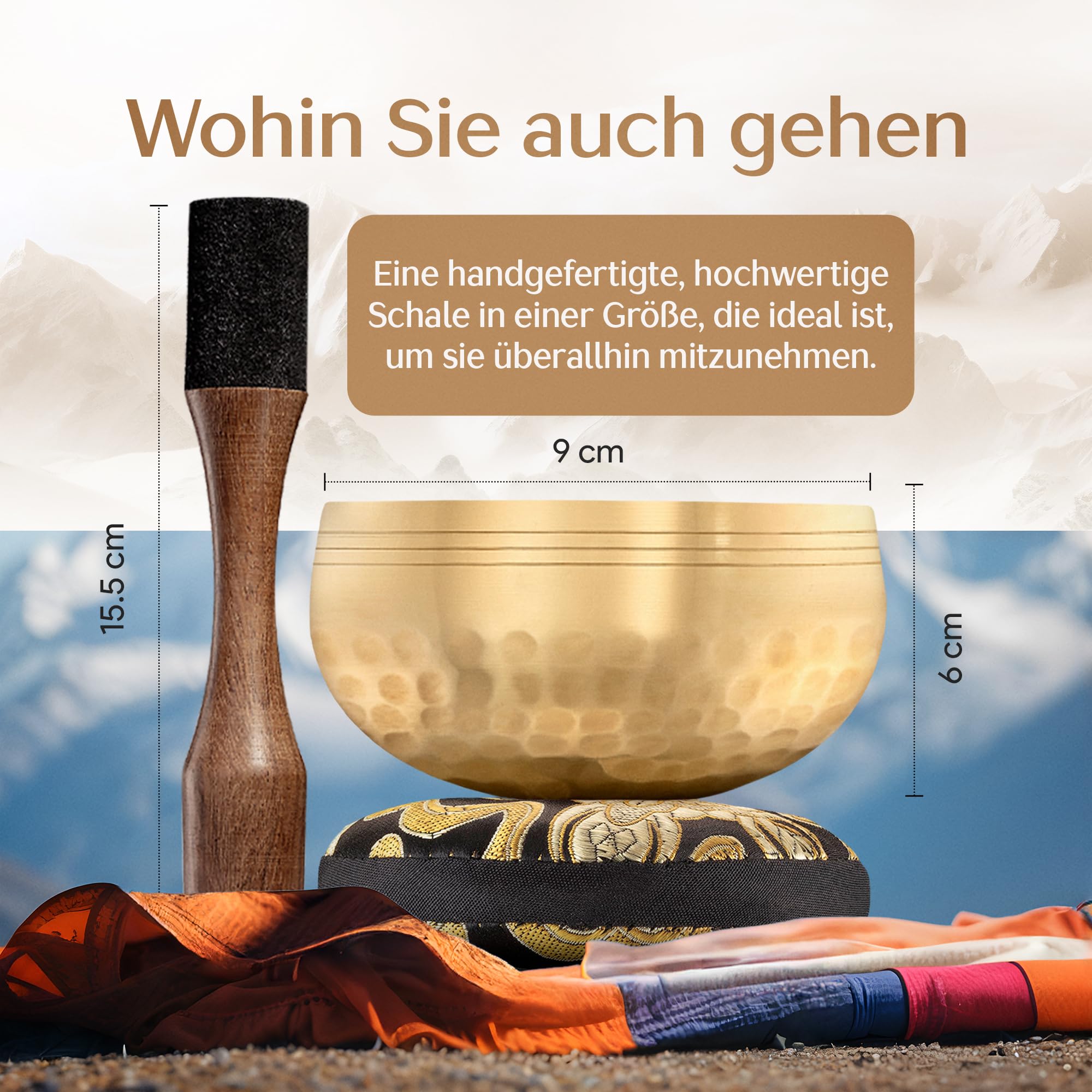 Silent Mind Klangschale Ø9 cm Bronze – Handgefertigtes Komplett-Set mit Kissen und Klöppel, für Anfänger geeignet, klarer stabiler Klang, ideal für Meditation und Achtsamkeit