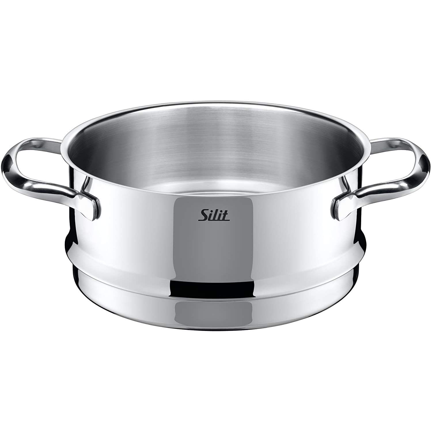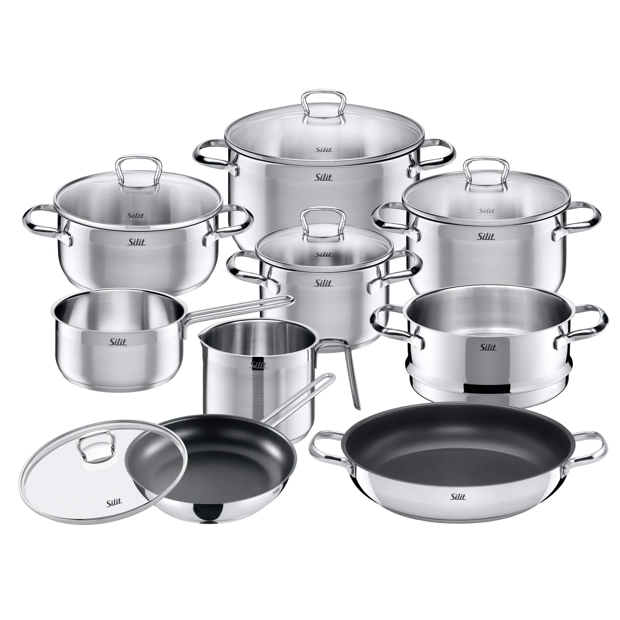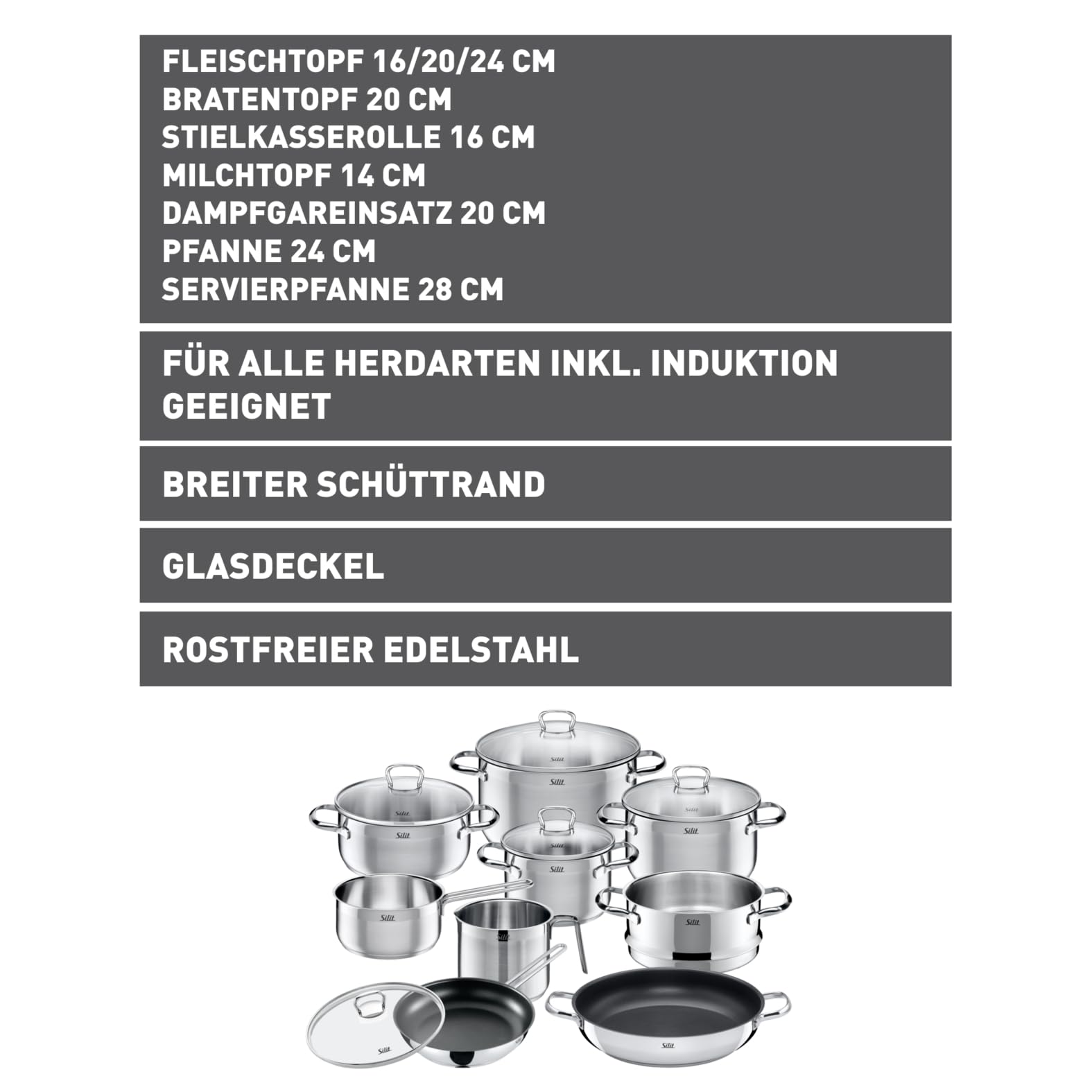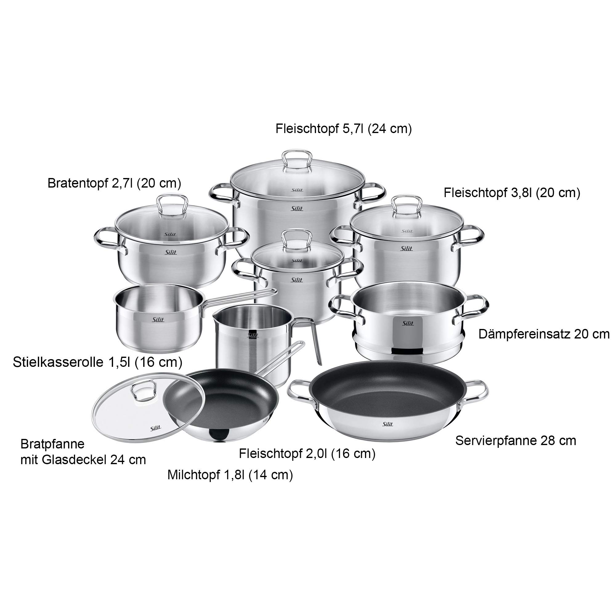 Silit Toskana Topfset induktionsgeeignet 10-teilig, Kochtopf Set mit Glasdeckel, Induktionskochtöpfe, Milchtopf, Dämpfer, Pfanne, Edelstahl teilmattiert, Induktions Töpfe Set unbeschichtet