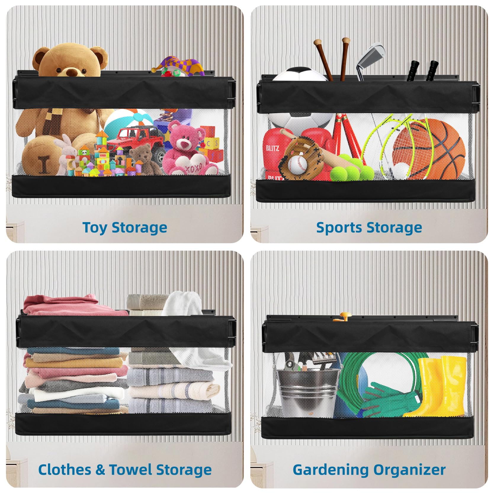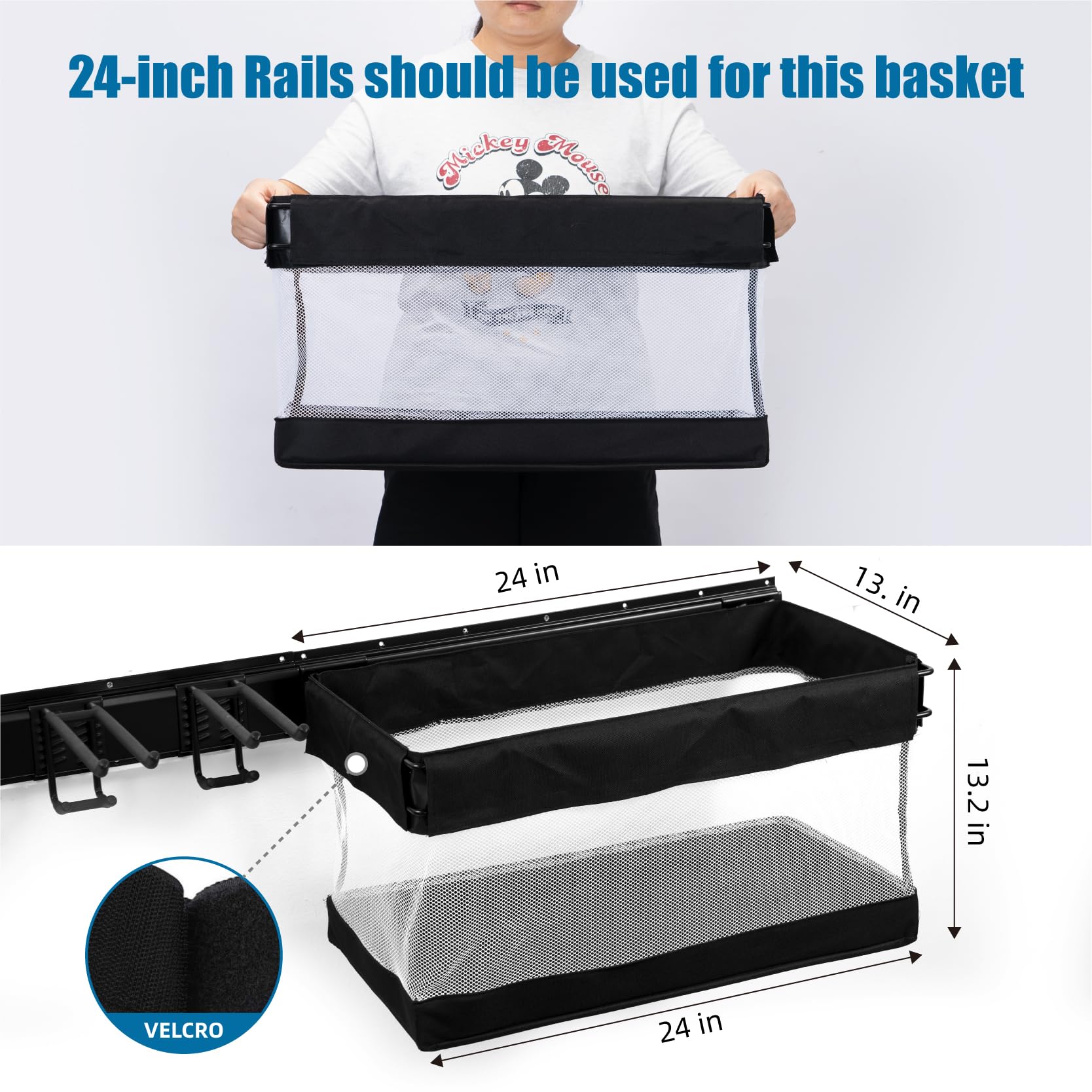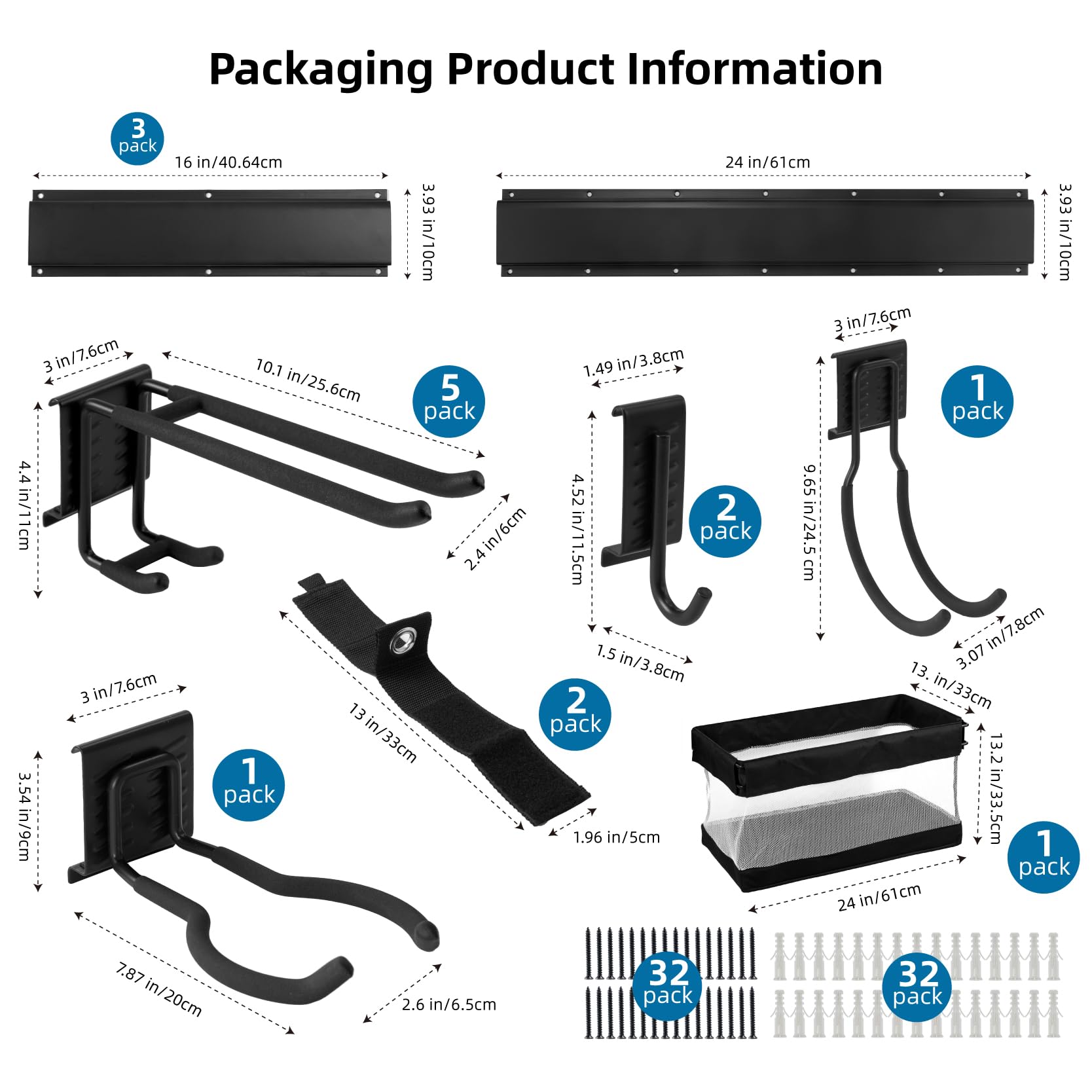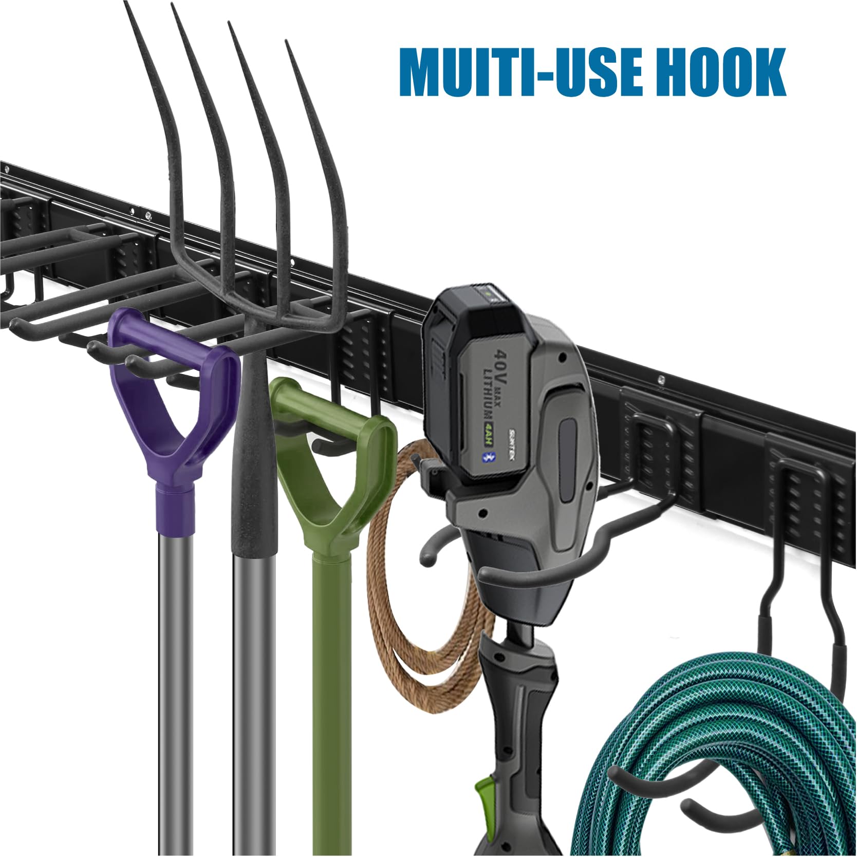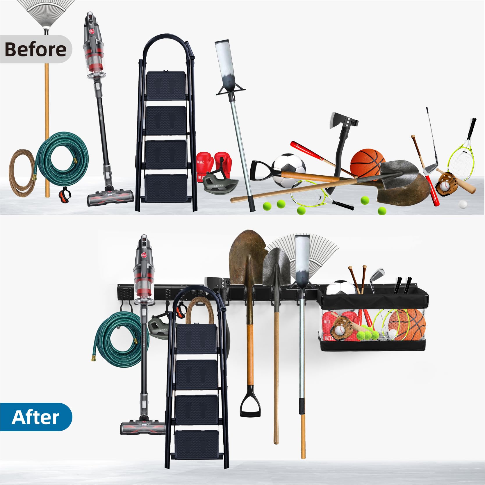 Sinoer Garage Werkzeugregal, Gartenwerkzeug Organizer Rack mit 9 Haken mit 2 Gurten und 1 Stück Stoffkorb, verstellbare Metallhaken, Yard Shed Organizer Rack, Werkzeughalter für Stühle, Besen, Harke