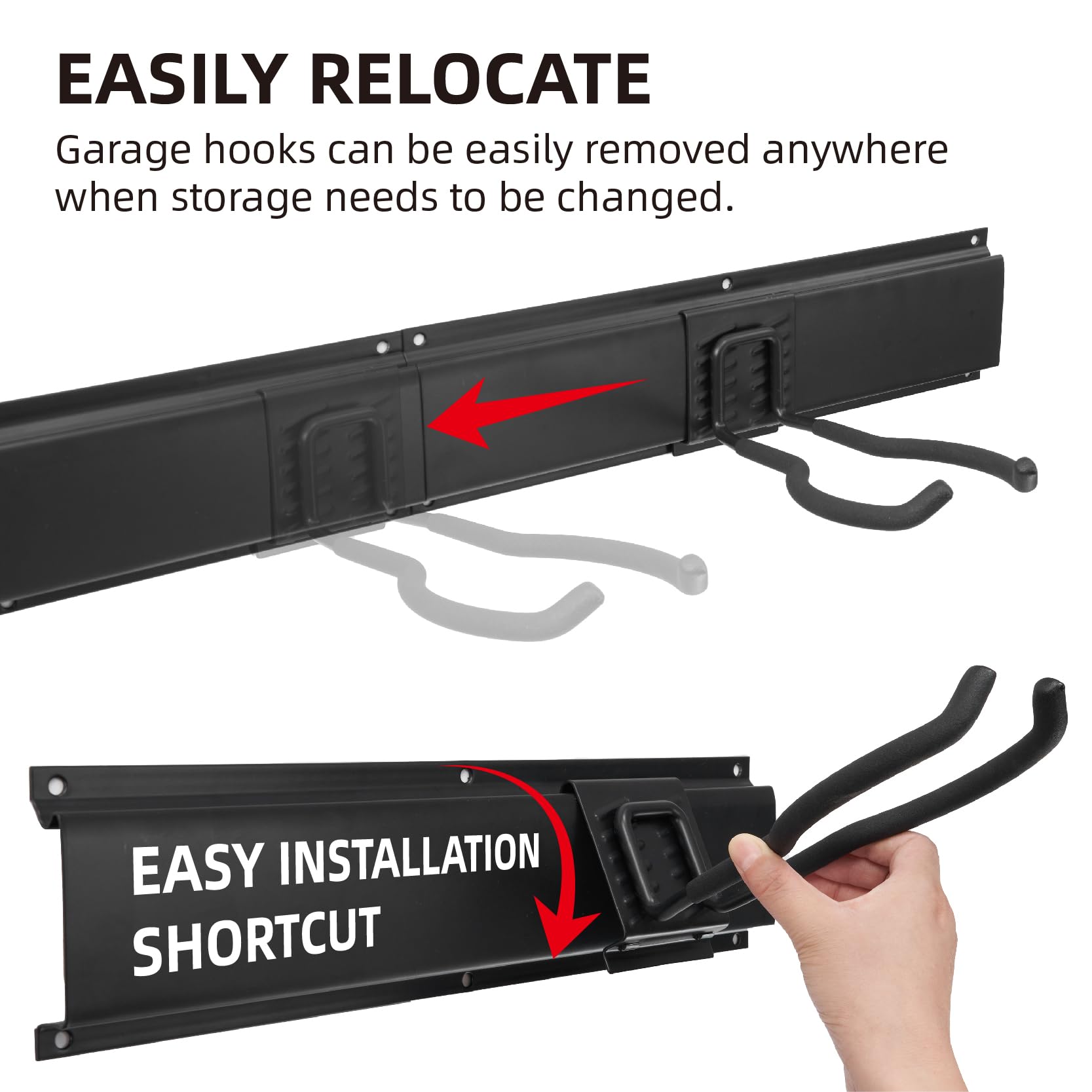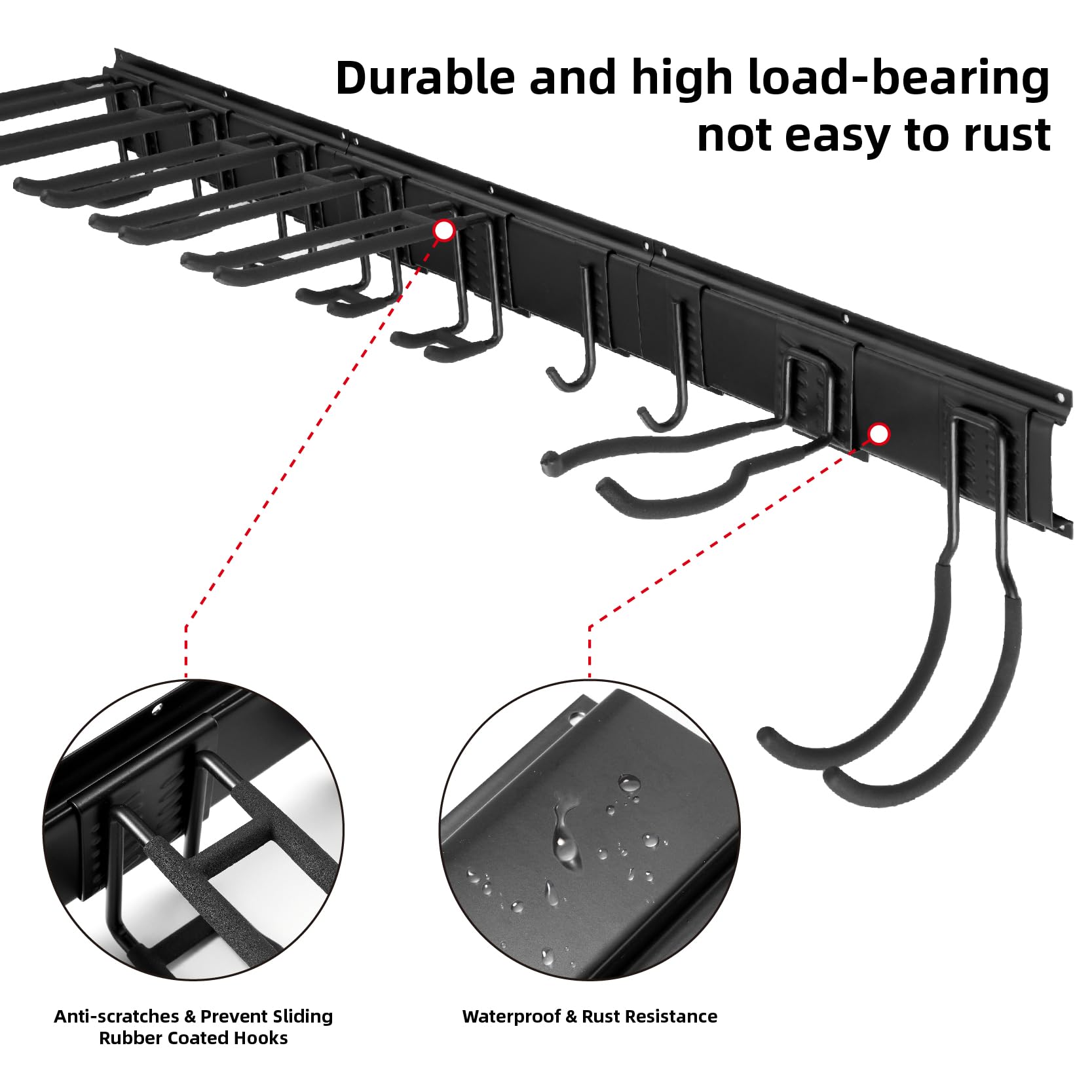 ??Dieser Werkzeugständer wird mit 3 pulverbeschichteten Schienen mit einer Gesamtlänge von 48 Zoll geliefert. Und 5 doppelte lange Haken, 2 kleine J-Haken, ein Elektrowerkzeughaken und lange halbrunde Haken (zum Halten von Wasserschläuchen, schweren Kabeln usw.) und 2 robuste Gurte. Die doppellagigen Stahlhaken sind jeweils 10 Zoll lang und die Lagerkapazität wird um 100 % erhöht. ??Der Werkzeughalter besteht aus hochfestem Stahl und alle Haken sind mit Gummi umwickelt, um ein Verrutschen und eine Beschädigung Ihrer Werkzeuge zu verhindern. Robust und langlebig mit einer Tragfähigkeit von bis zu 500 Pfund, sodass schwere Werkzeuge problemlos aufgehängt werden können. Oberflächen-Korrosionsschutzbehandlung im Innen- und Aussenbereich, kein Grund zur Sorge über Alterung durch Sonne und Regen. ??Dieser Garagenwand-Werkzeugständer bietet Platz für verschiedene Werkzeuge, wie Gartengeräte, Schaufeln, Rechen, Besen, Seile, Schläuche, Elektrowerkzeuge, Heckenscheren, Schneeschaufeln, Skiausrüstung usw. Alle verstellbaren Haken können mit den Schienen verbunden werden umgestellt, um Ihren tatsächlichen Bedürfnissen gerecht zu werden. ??Garagenlagerregale können auf fast jeder festen Oberfläche im Innen- und Aussenbereich montiert werden. Hängen Sie alle Ihre Werkzeuge daran auf und sorgen Sie ganz einfach für Ordnung in Ihrer Garage. Wenn Sie mit dem an der Wand montierten Werkzeug-Organizer nicht zufrieden sind, senden Sie uns einfach eine E-Mail und wir bieten Ihnen einen 100%igen an, ohne dass Fragen gestellt werden.