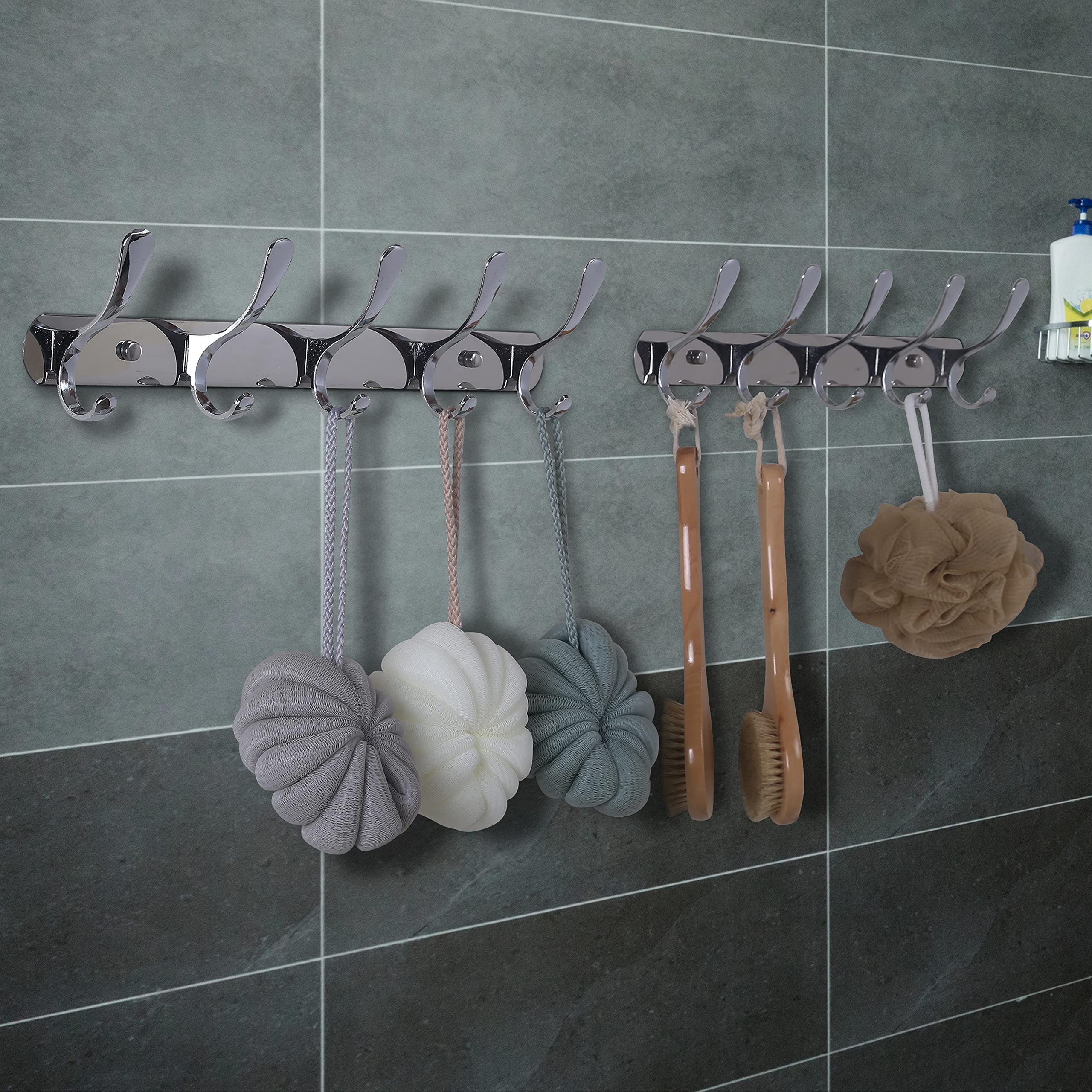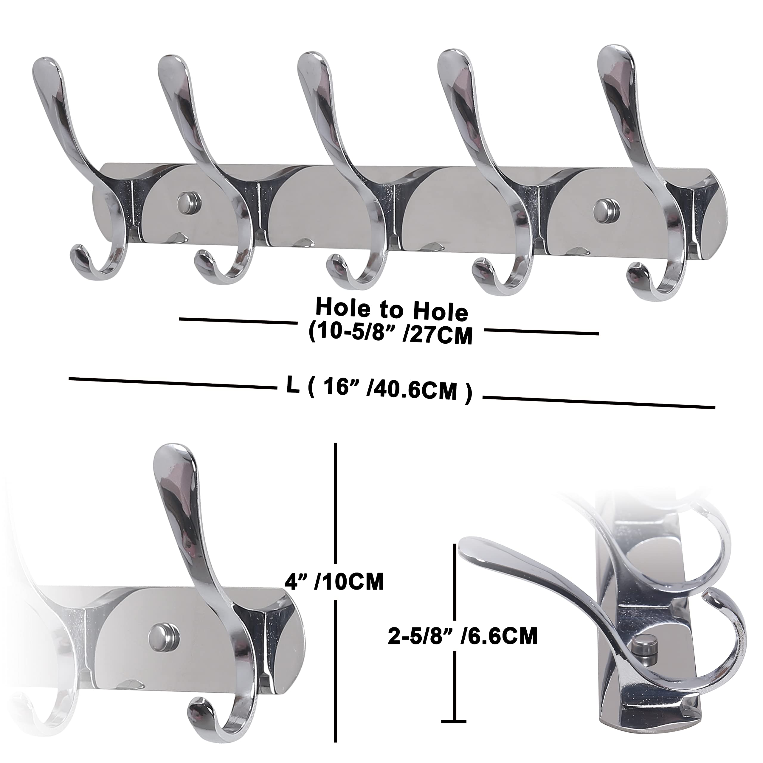 SKOLOO Garderobenleiste, Moderne, stabile Metall Kleiderhaken Wand mit 5 Haken, 2er-Pack, zum Aufhängen von Kleidung, Mantel, Hüten, Jacken, Rucksack, Hakenleiste Silber