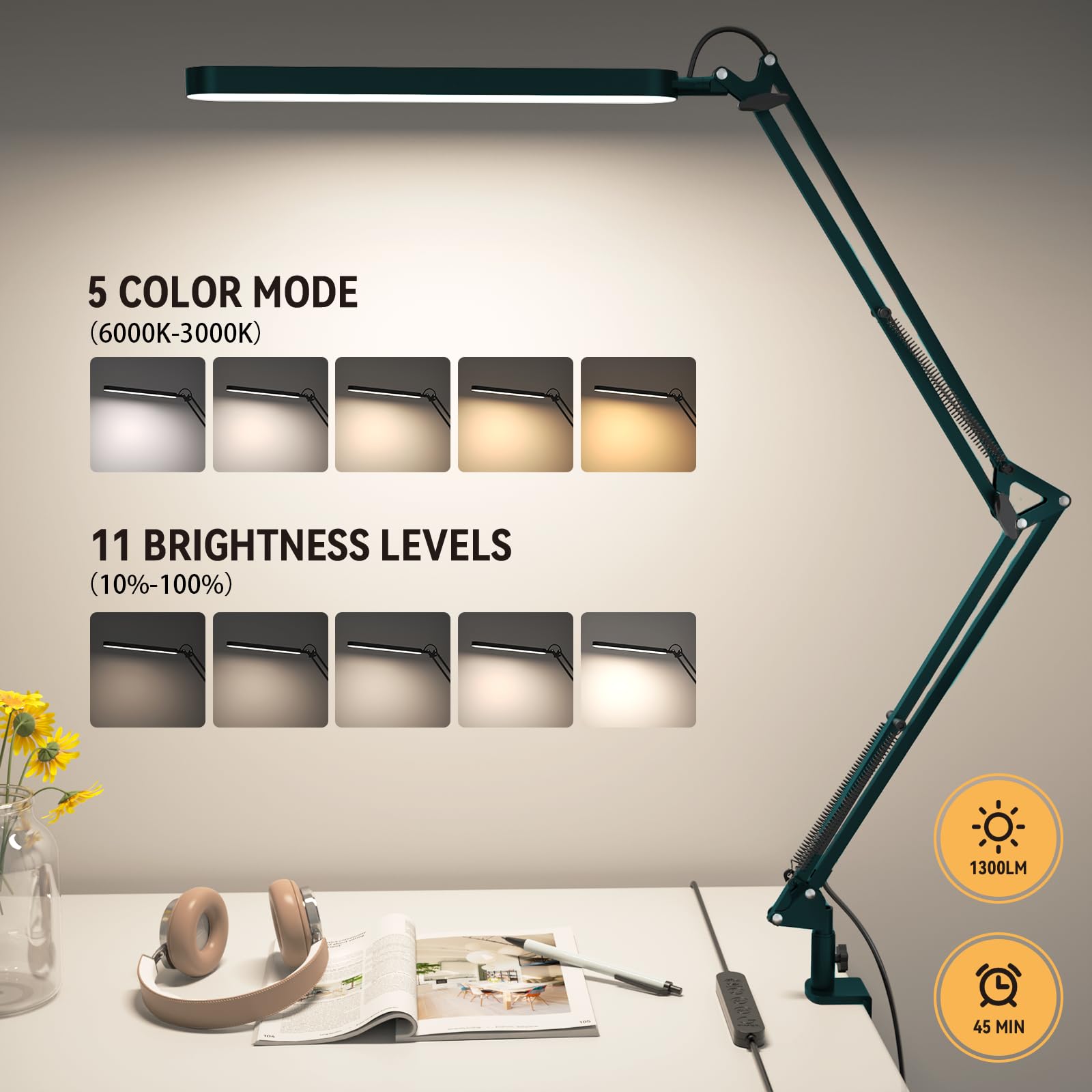 SKYLEO Schreibtischlampe LED – Schreibtisch Lampe – 5 Farbmodi x 11 Helligkeitsstufen – Verstellbarer Schwenkarm – Timmer und Speicherfunktion – 12W Desk Lamp – Grün