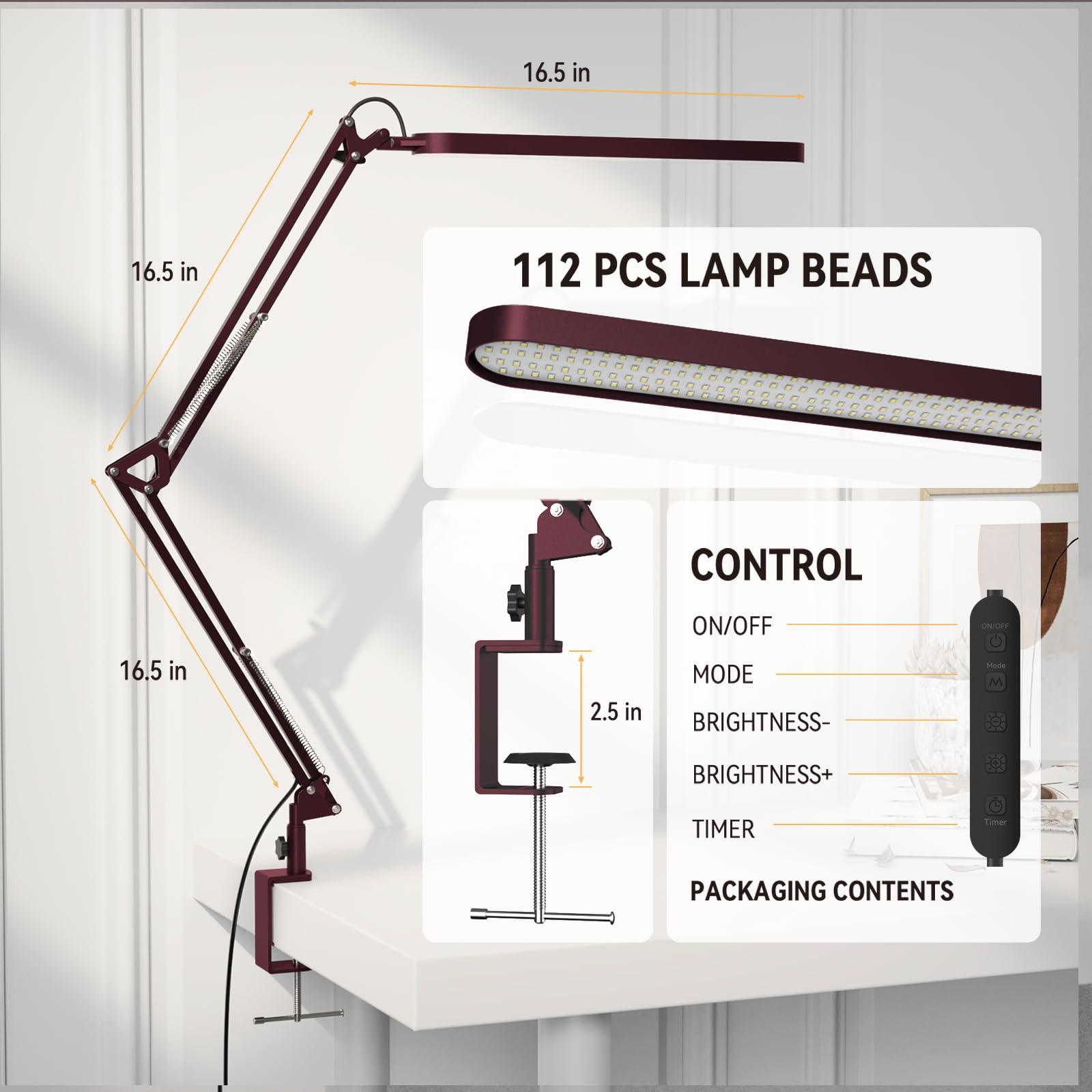 SKYLEO Schreibtischlampe LED – Schreibtisch Lampe – 5 Farbmodi x 11 Helligkeitsstufen – Verstellbarer Schwenkarm – Timmer und Speicherfunktion – 12W Desk Lamp – Rot