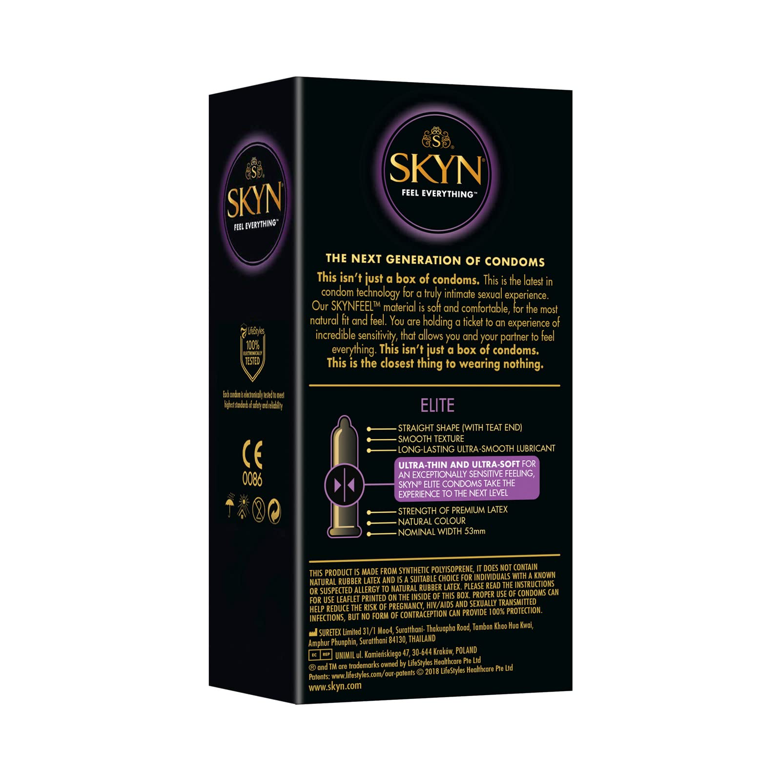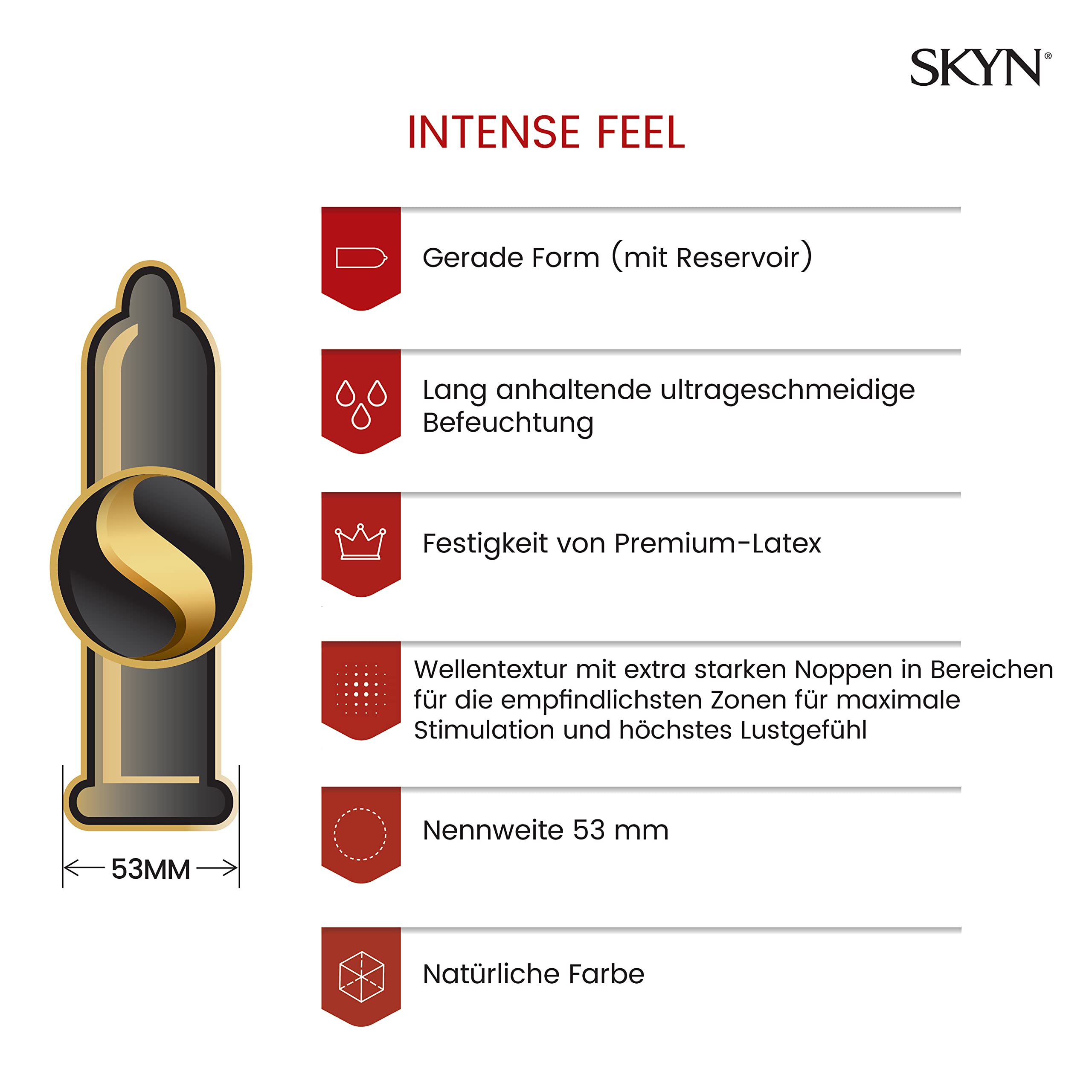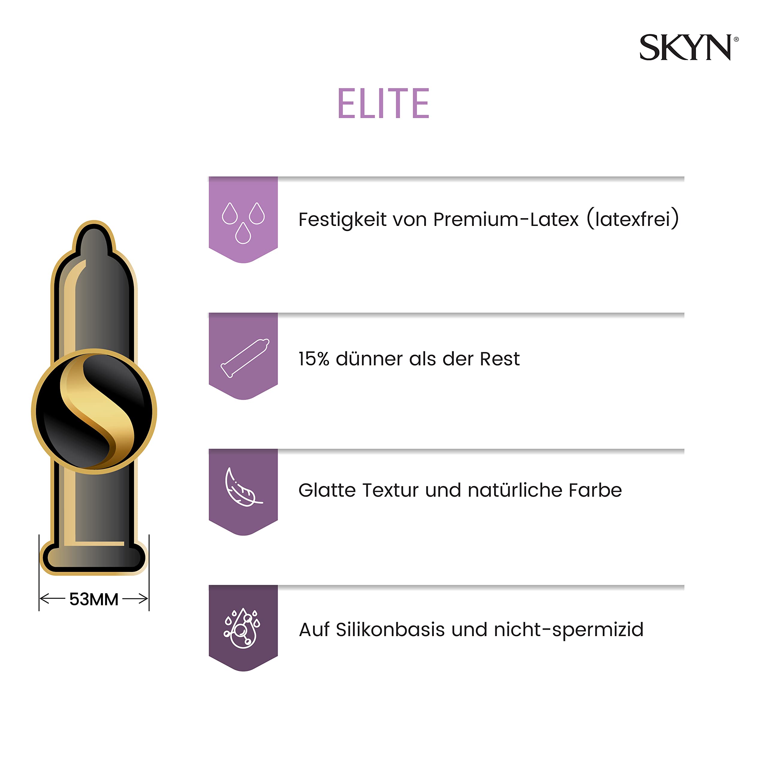 INTENSE FEEL: Deshalb werden Sie es lieben. SKYN Intense Feel latexfreie Kondome verfügen über eine wellenförmige Textur und extra starke Noppen für ein gesteigertes Empfinden und genussvolles Vergnügen. Diese neue Generation von Kondomen besteht aus SKYNFEEL, einem technologisch fortschrittlichen, latexfreien Material, das die Stimulation nachweislich verbessert. Es fühlt sich so weich und geschmeidig an, dass Sie kaum merken, dass Sie es tragen. So können Sie und Ihre Partnerin/Ihr Partner wirklich alles spüren. ELITE: Deshalb werden Sie es lieben. Ultraweiche und ultradünne Kondome für ein aussergewöhnlich hautnahes Gefühl: SKYN Elite Kondome steigern das intime Erlebnis auf höchste Lust. Das sind nicht einfach Kondome. SKYN Elite ist fast so, als würden Sie gar nichts tragen. SKYN Kondome bestehen aus synthetischem Polyisopren, enthalten kein Naturkautschuklatex und sind für Personen mit bekannter oder vermuteter Latexallergie geeignet. SKYN Premium gleitfähige Polyisopren-Kondome lassen sich leicht dehnen und passen sich Ihrer Form an, so dass sie bequem zu benutzen sind. Ausserdem sind sie frei von Allergenen, was sie zu einer sicheren Wahl macht. Diese latexfreien, gleitfähigen Kondome fühlen sich weich und natürlich an und sorgen für ein aussergewöhnliches Erlebnis. Um Kondome vor Beschädigung zu schützen, sollten sie nicht in der Brieftasche aufbewahrt werden. Unbenutzte Kondome sollten in ihrer Verpackung an einem kühlen, trockenen Ort aufbewahrt werden.