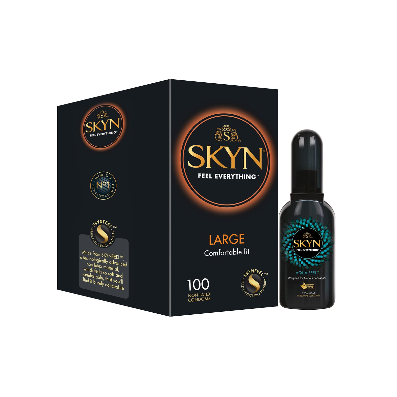 SKYN Large Kondome (100 Stück) & Aqua Feel Gleitgel (80ml) | Grosse Skynfeel Latexfreie Kondome für Männer, XXL Grösse Gemütlich Gefühlsecht Hauchzart, Wasserbasis Massageöl Sexöl, Stimulierend