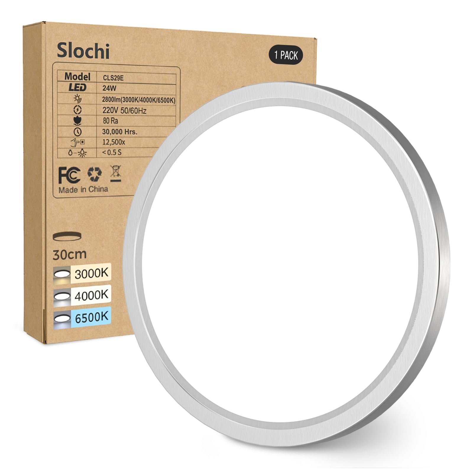 slochi LED Deckenleuchte Flach 24W 2800LM, 3Farben - 3000K/4000K/6500K, Ø30CM Deckenlampe IP54 Wasserfest Rund Badlampe, Modern LED Lampen für küche Badezimmer Schlafzimmer Wohnzimmer, Nickelfarbe