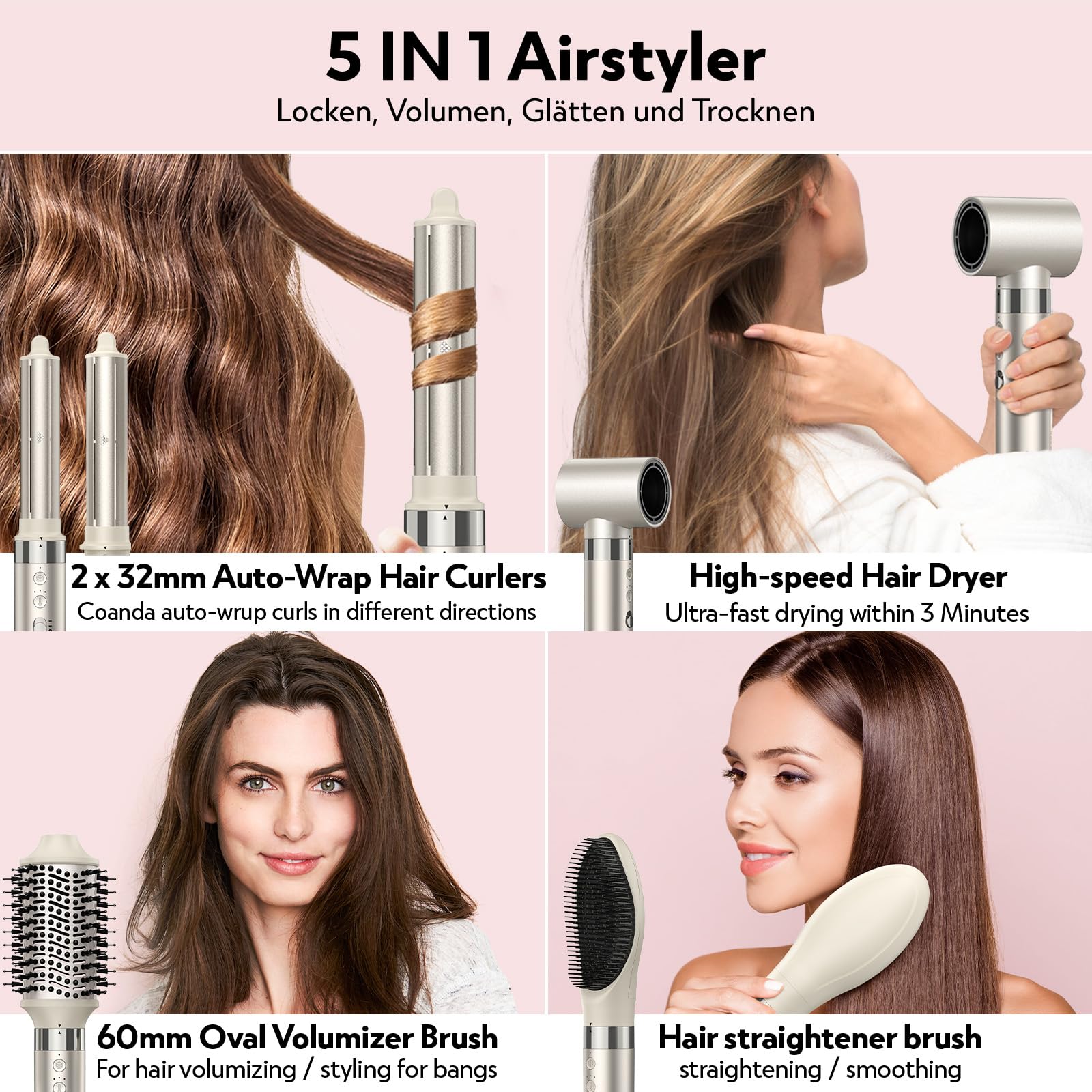 Slopehill Airstyler 5 IN 1, Ionen Föhn 110000 U/Min, Multifunktionaler Hairstyler, Lockenstab Automatisch, Warmluftbürste,Glätteisen, für Styling, Volumisieren, Locken und Glätte(Champagner Gold)