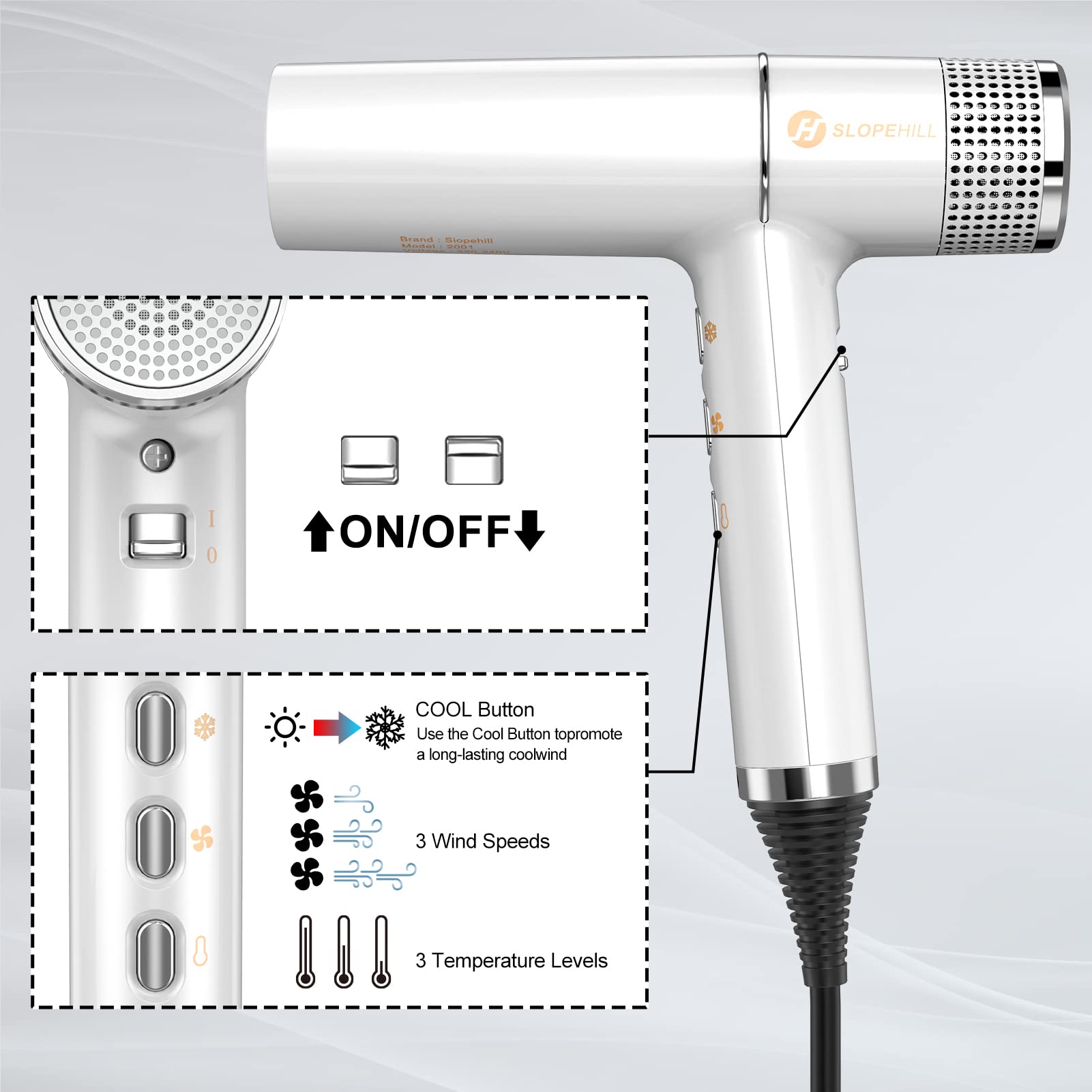 slopehill Haartrockner mit einzigartigem bürstenlosem Motor | Intelligente Fehlerdiagnose | Innovativer Mikrofilter | Oxy Active Technology | LED-Anzeige| 268g Superleicht, 2000W (Weiss)