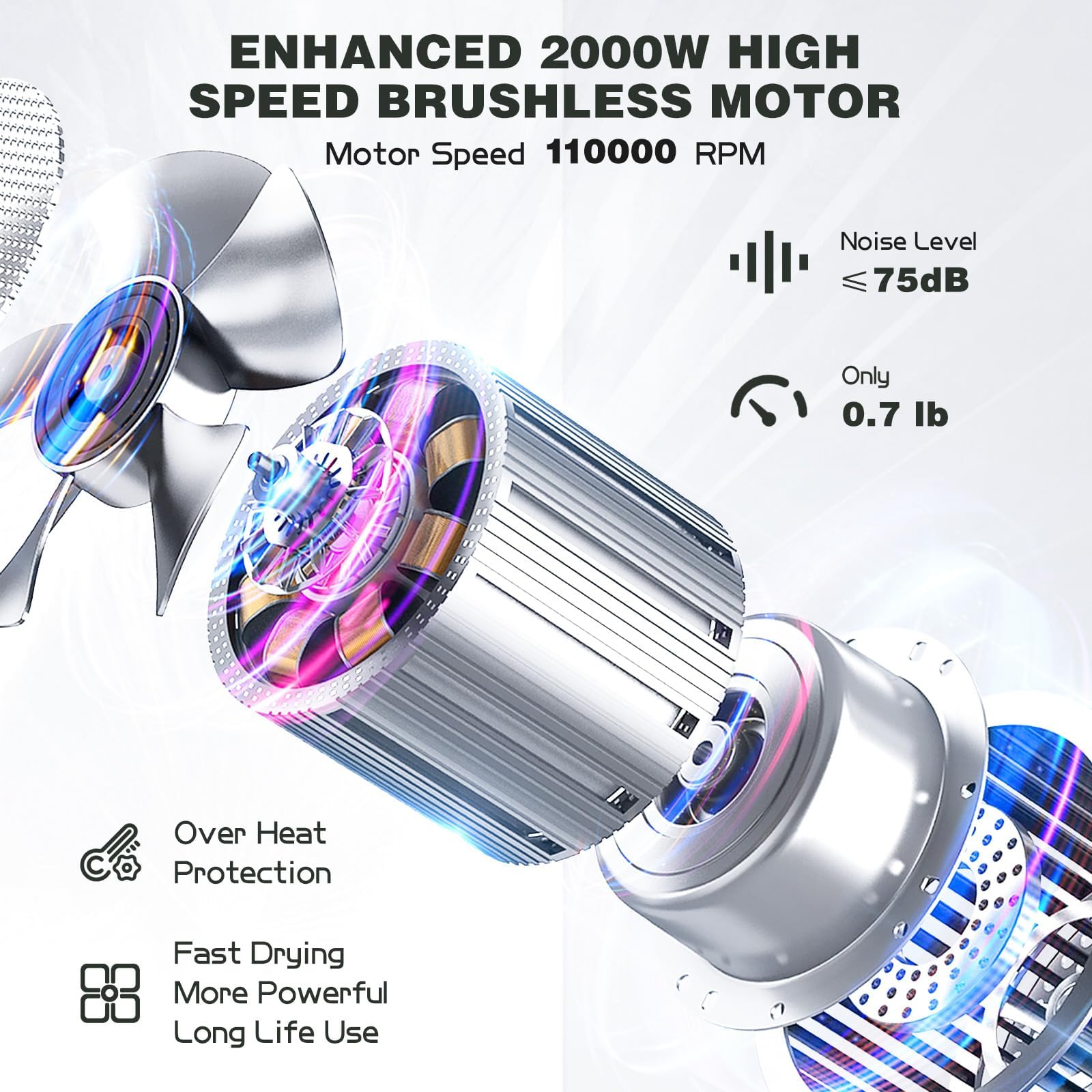 - 【Einzigartiger Superstarker Bürstenloser Motor + 2 Minuten Schnelles Trocknen】Slopehill Haartrockner ist mit einem selbst entwickelten einzigartigen 2000W High-Speed Brushless Motor ausgestattet, maximale Geschwindigkeit bis 110.000 Drehzahl. 10-mal schneller als herkömmlicher Motor und produzieren stabilen Luftstrom, erhöht die Leistung des Produkts, reduziert die Trocknungszeit und erhöht die Nutzungsdauer des Motors.
