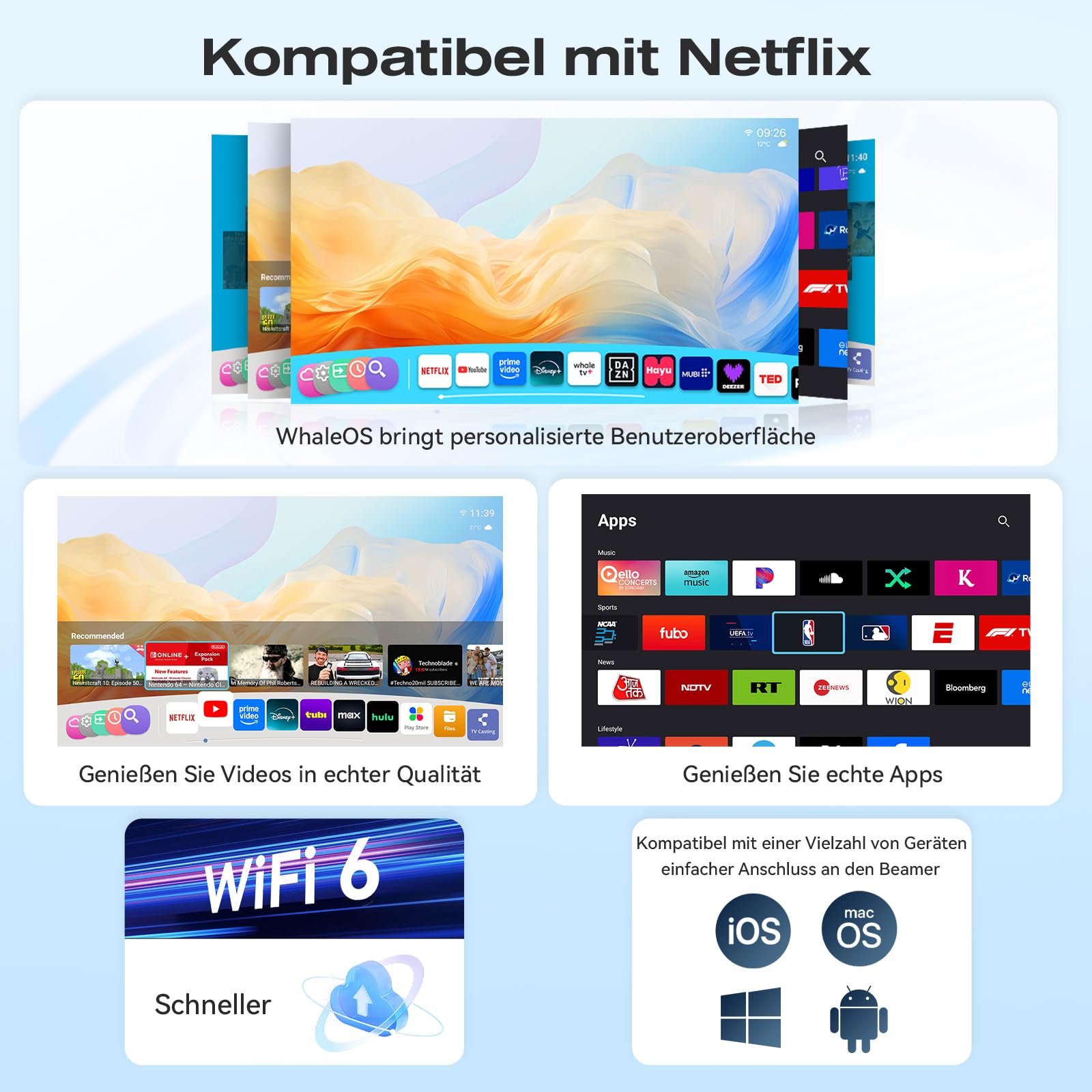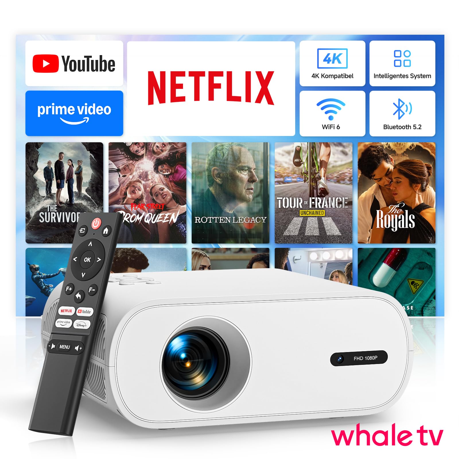 Smart Beamer【Whale TV】mit Elektrischer Fokus/Trapezkorrektur, 20000LM 1080P Full HD WiFi 6 Bluetooth 5.2 Mini Beamer Heimkino, Mini Projektor mit EIN-klick-Nutzung von Netflix/YouTube/D+