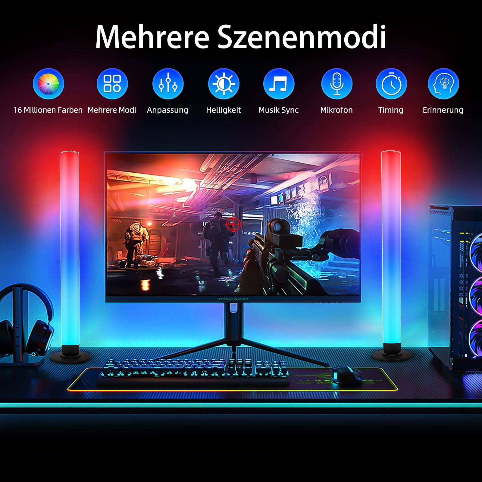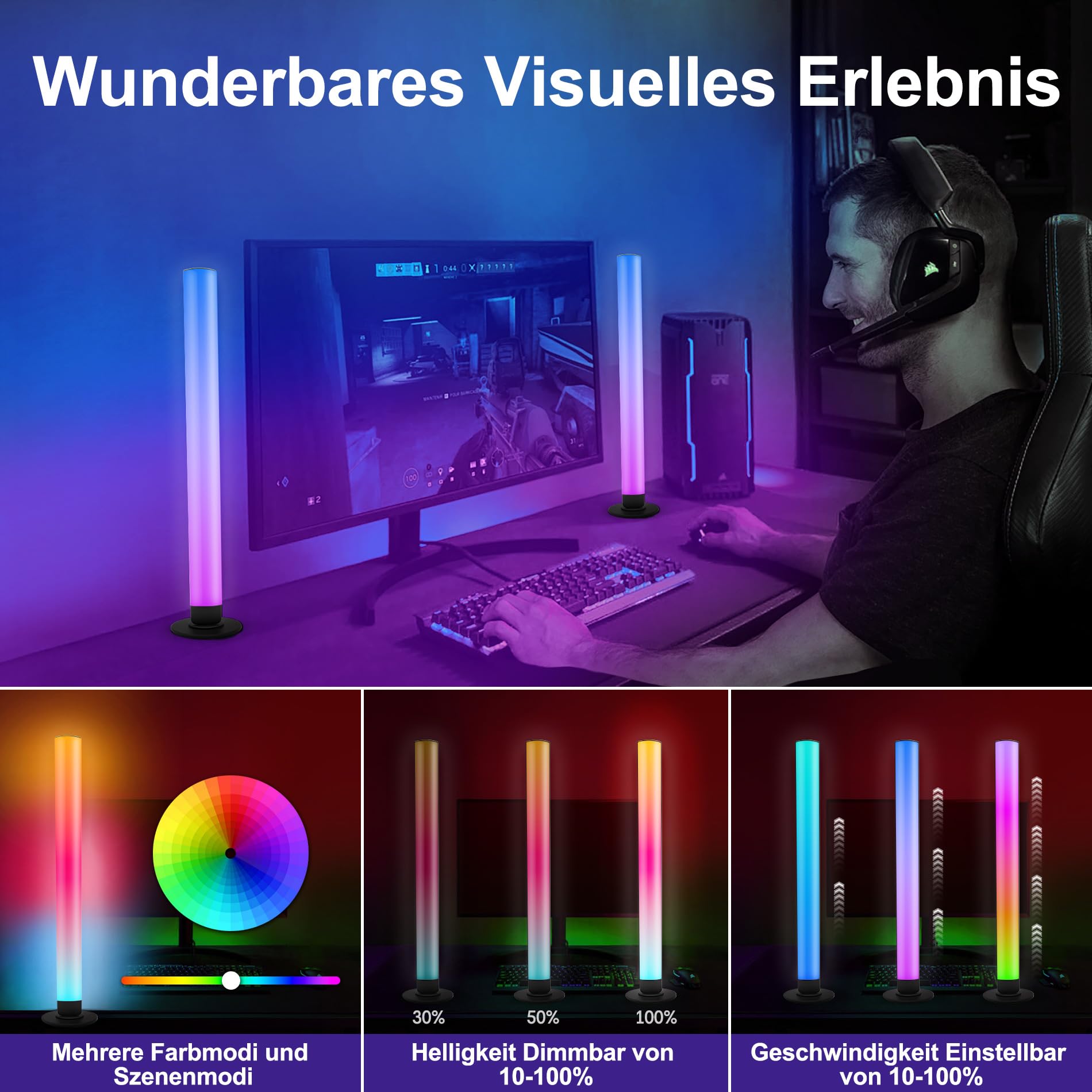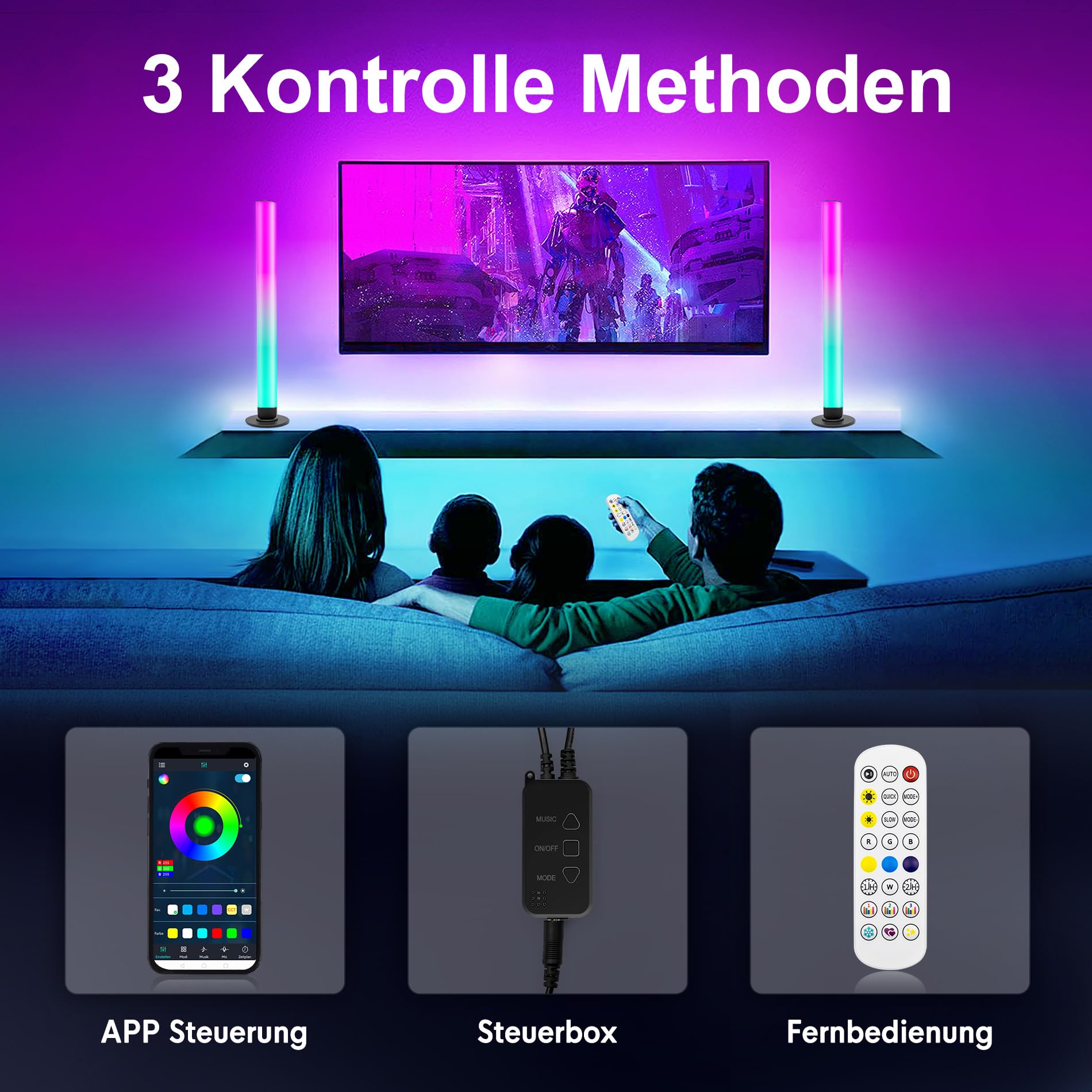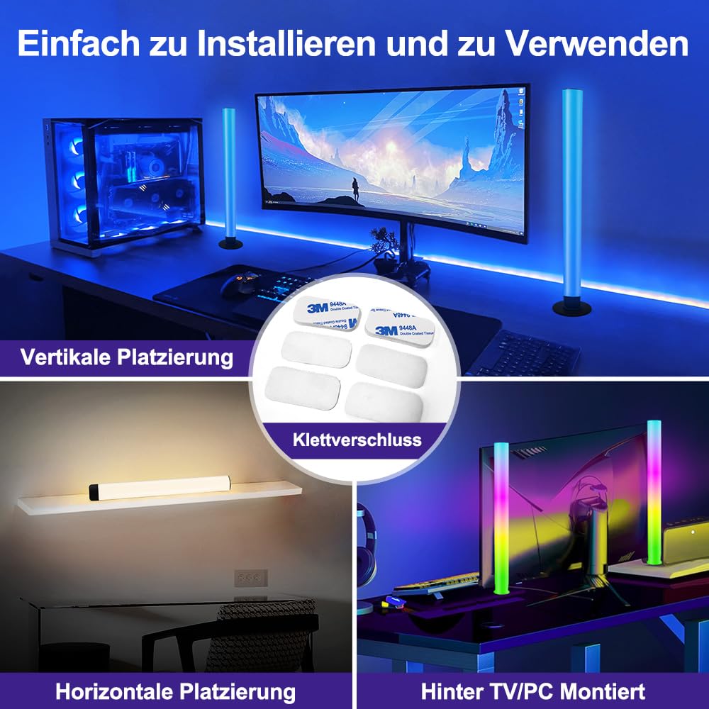 Smart LED Lightbar 2er Set, RGB Lampe TV Hintergrundbeleuchtung mit Multi-Modi und Dimmbare, Gaming LED Beleuchtung Sync mit Musik, APP und Fernbedienung für Gaming, Filme, PC, TV, Raumdekoration