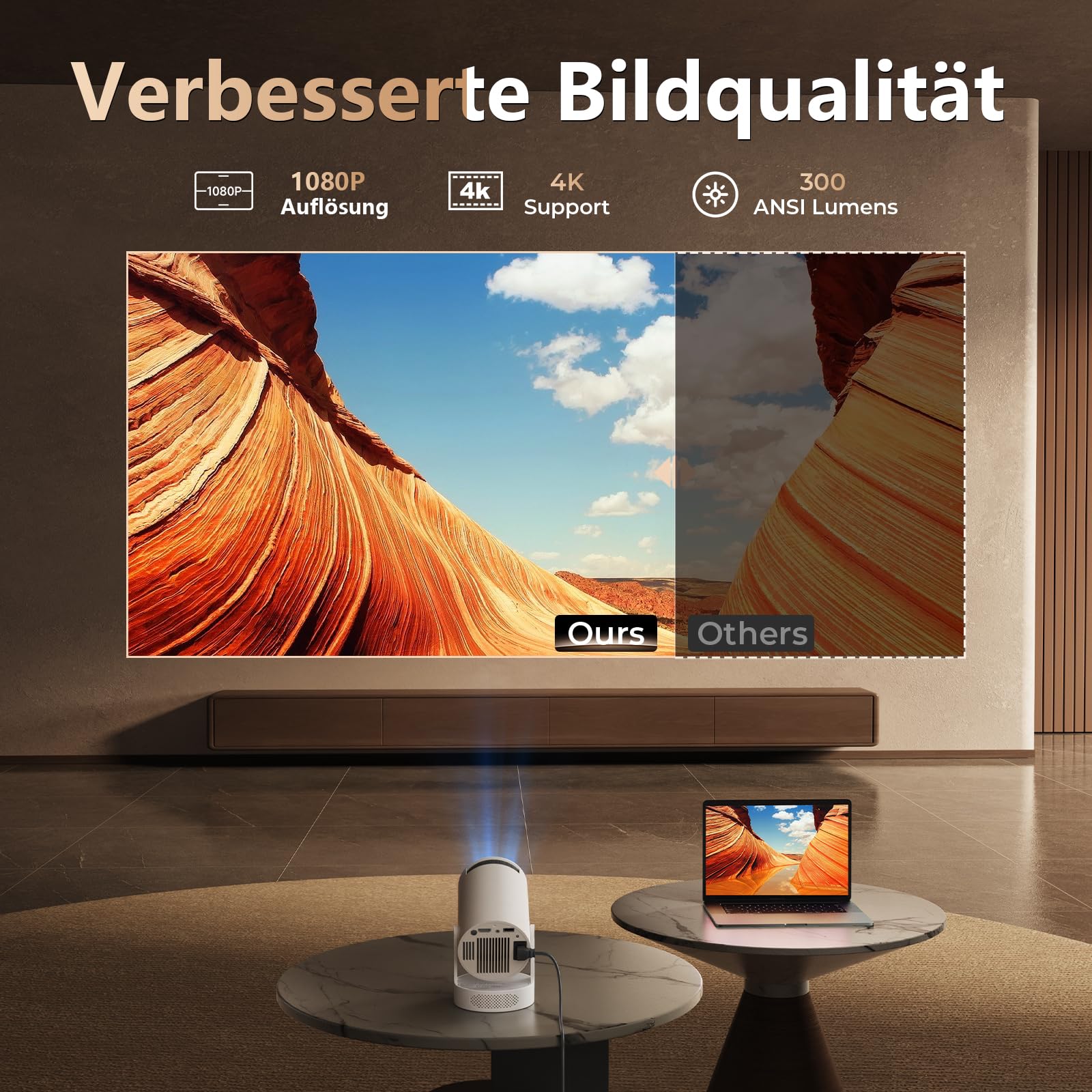 Smart Mini Beamer, Upgraded Hi-Fi Mini-Projektor mit 4K-1080P-Unterstützung, 300 ANSI-Lumen, WIFI6 & Bluetooth & Auto-Keystone Video Projektor für Schlafzimmer Heimkino