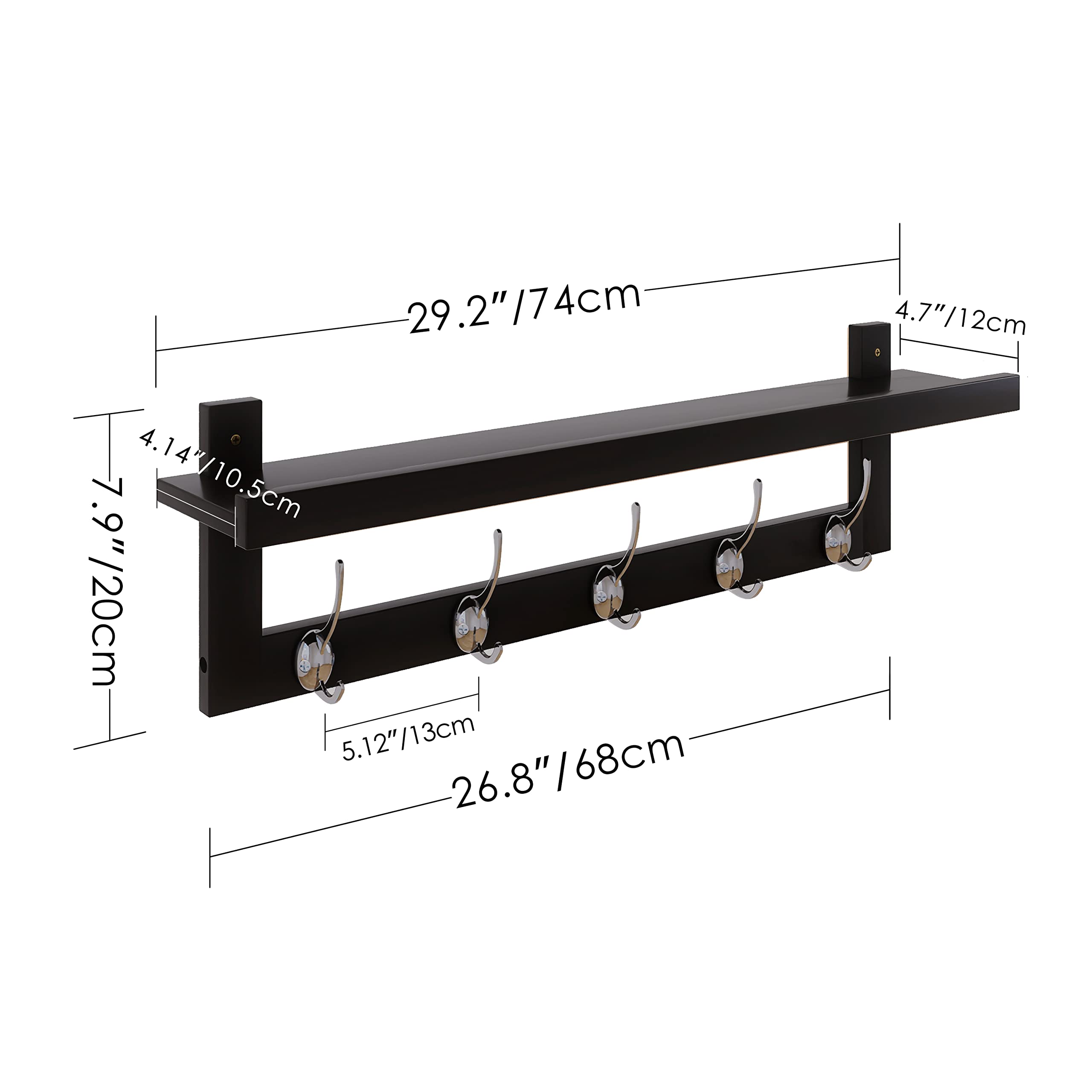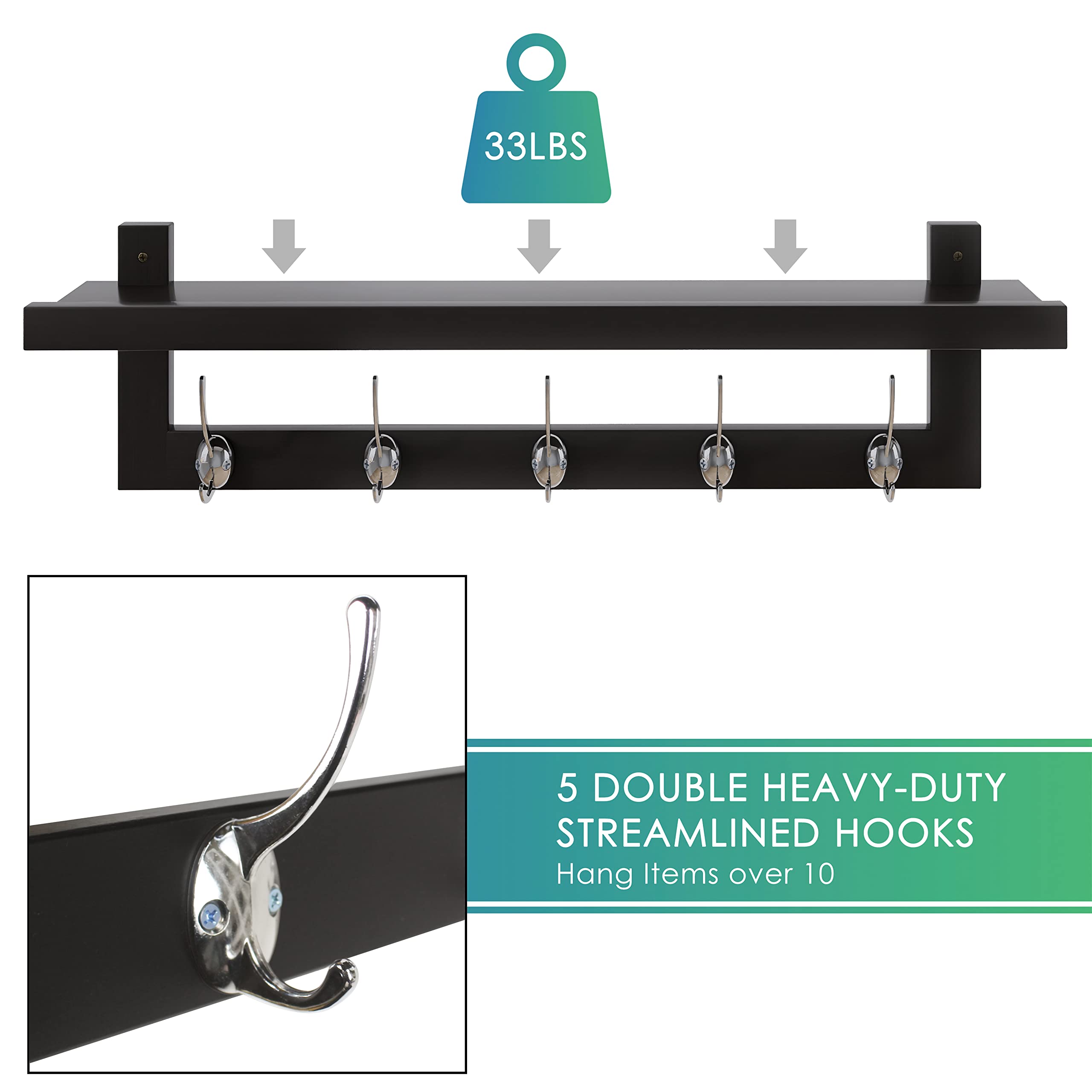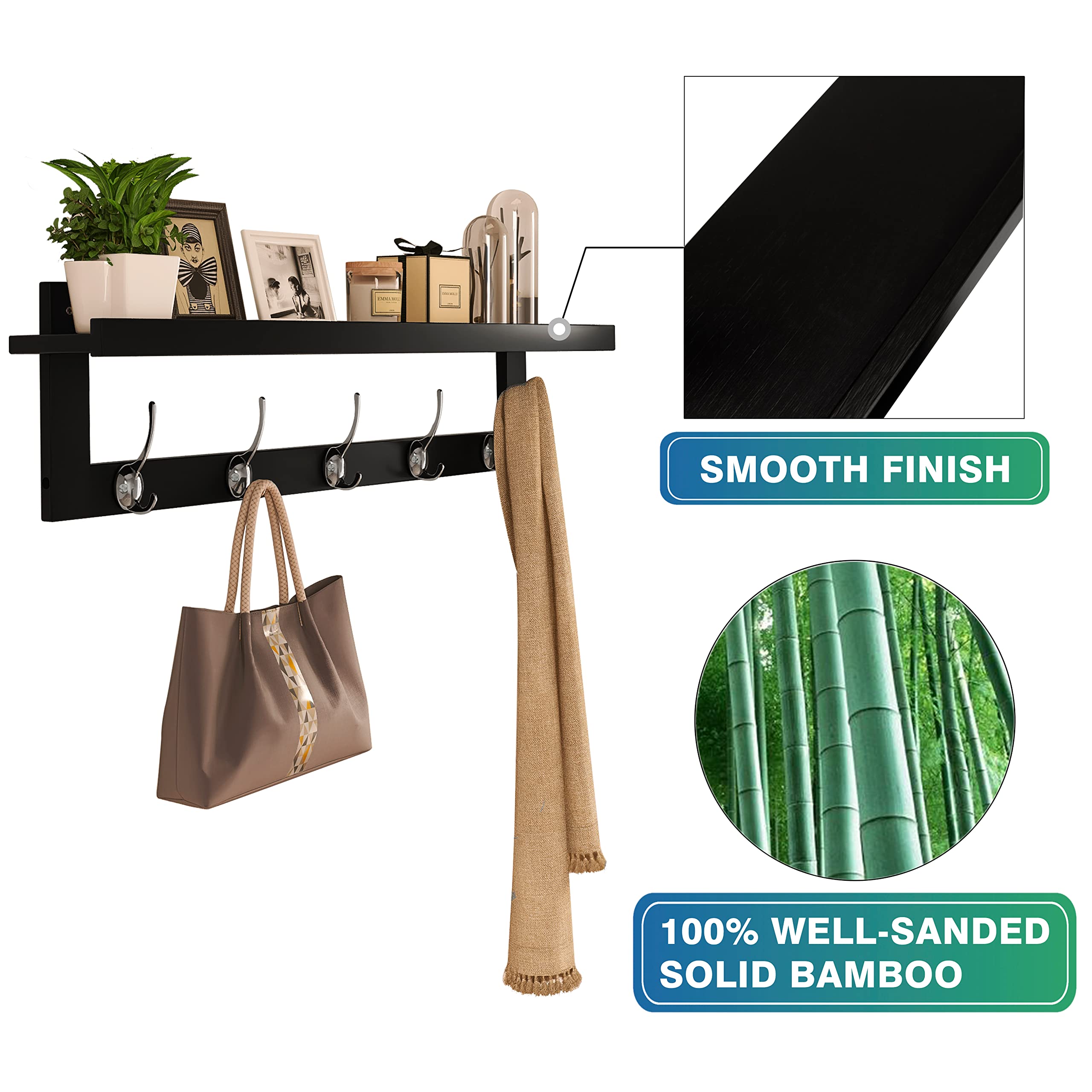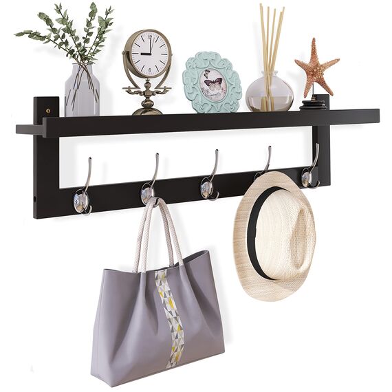 SMIBUY Kleiderhaken mit Regal Wandmontage, 74 cm Eingangsbereich Garderobe für Wand, Bambus-Hängeregal mit 5 Doppel-Metallhaken für Badezimmer, Schlafzimmer, Küche, Wohnzimmer (Schwarz+Silbrig)