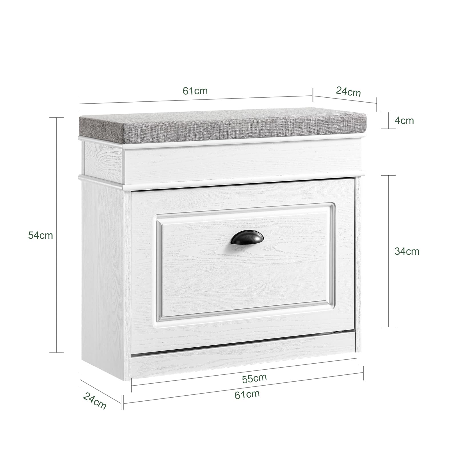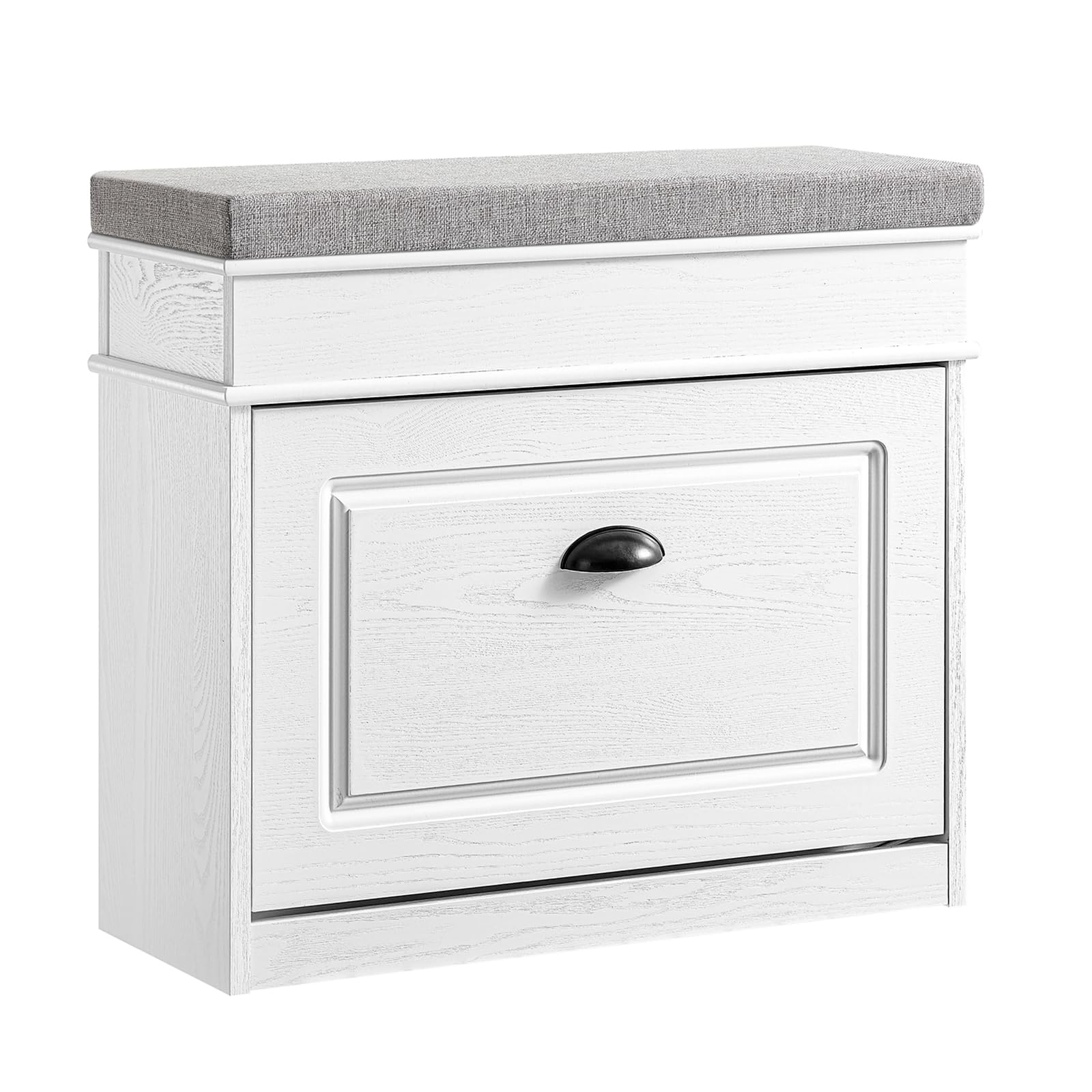 SoBuy Schuhbank mit Sitzkissen Stauraum Schuhschrank Schuhregal schmal platzsparende Sitzbank mit Stauraum für Flur, Wohnzimmer, Schlafzimmer, Weiss Vintage Holzmaserungseffekt 61x54x24cm FSR82-K-WG