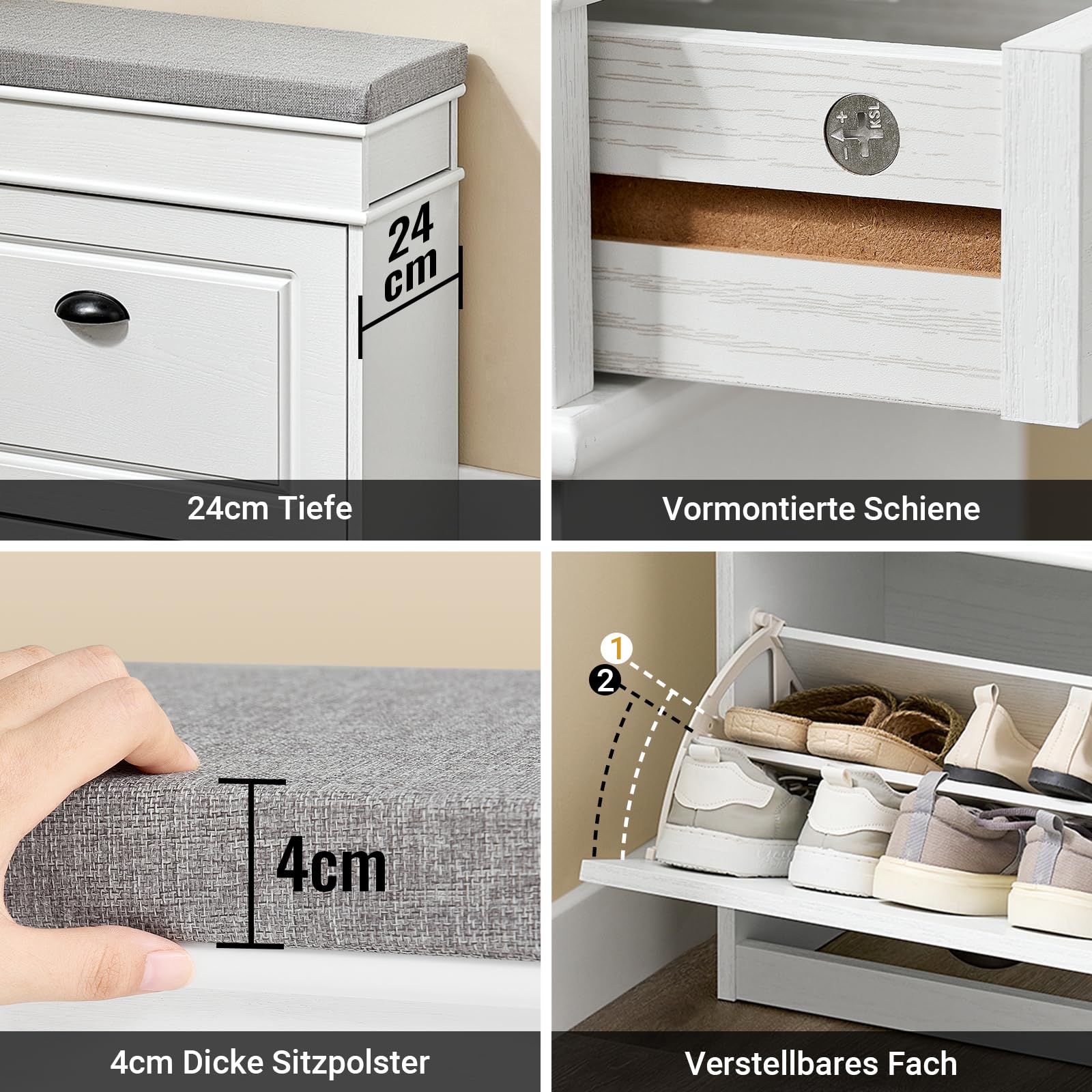[PLATZSPARENDES DESIGN MIT STARKER BELASTBARKEIT] Mit kompakten Massen von 61x54x24cm, ideal für schmale Flure oder Wohnungen. Hergestellt aus robustem MDF(E1) + PD(E1), bietet diese Schuhbank eine Belastbarkeit von bis zu 113 kg – mehr als viele herkömmliche Sitzbänke [MULTIFUNKTIONALE 2-IN-1 SCHUHBANK MIT KLAPPE] Diese Sitzbank mit Stauraum kombiniert ein praktisches Schuhregal mit einem bequemen Sitzkissen, ideal zum Anziehen der Schuhe. Integrierte Schublade für Schuhcreme, Schlüssel. Die integrierte Klappe ermöglicht eine versteckte und ordentliche Schuhaufbewahrung [PFLEGELEICHTES SITZKISSEN FÜR MEHR KOMFORT] Das Sitzkissen bietet angenehmen Komfort beim Sitzen. Der Bezug ist strapazierfähig und einfach zu reinigen – ideal für den Eingangsbereich, in dem Sauberkeit und Funktionalität gefragt sind [SCHLICHTES UND ZEITLOSES DESIGN FÜR VIELSEITIGE RÄUME] Das klare, reduzierte Erscheinungsbild dieser Schuhbank passt perfekt in verschiedene Wohnbereiche wie Flur, Wohnzimmer oder Schlafzimmer. Die minimalistische Form fügt sich harmonisch in moderne Möbelkonzepte ein und sorgt für aufgeräumte Eleganz [NACHHALTIG VERPACKT & KOMBINIERBAR MIT WEITEREN MODULEN] Dieses Schuhregal wird in einer 100% recycelbaren Verpackung geliefert. Es lässt sich ideal mit anderen SoBuy-Modellen wie FSR64, FSR78, FSR79 und FSR94 kombinieren – für eine individuell erweiterbare Schuhschrank-Lösung