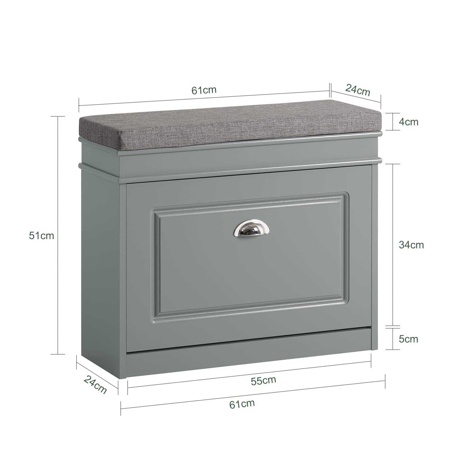 Mit diesem Schuhkipper erklären Sie dem Schuhchaos in Ihrem Flur den Krieg! Der geschlossene Schuhschrank schützt Ihre Sandalen, High Heels und Turnschuhe gegen Staub, Ausbleichen und sorgt für einen ordentlichen Flur. Durch die Klappe mit 2 Ablageflächen im Inneren, können Sie Ihre Schuhe ordentlich verstauen. Die Höhe der Schuhfächer können durch herausnehmbare Böden verstellt werden, somit haben auch höhere Schuhe hier Platz. Dank der vielseitigen Schuhbank ist das schnelle An- und Ausziehen von Schuhen im Flur ein wahres Vergnügen. Anstatt im Stehen zu kämpfen, setzen Sie sich einfach auf die bequeme Polsterung des Sitzes. Gut entworfene Struktur und hochwertiges MDF(E1), machen diese Schuhschrank robust und langlebig. Die Oberfläche ist kratzfest und leicht zu reinigen. Verwenden Sie einfach ein feuchtes Tuch. Wenn Sie diesen Schrank hin und her schieben/tragen, ist der Boden mit den Filzgleitern vor Kratzer geschützt. Zur kühlen Eleganz des modernen Wohnstils passt ein unser Schuhkipper in eleganter Farbe. Die Metallgriffe betonen das cleane Design und machen den Schrank einfach und stilvoll. Montage: - Lieferzustand: zerlegt und praktisch verpackt -Leicht verständliche Montageanleitung inklusive