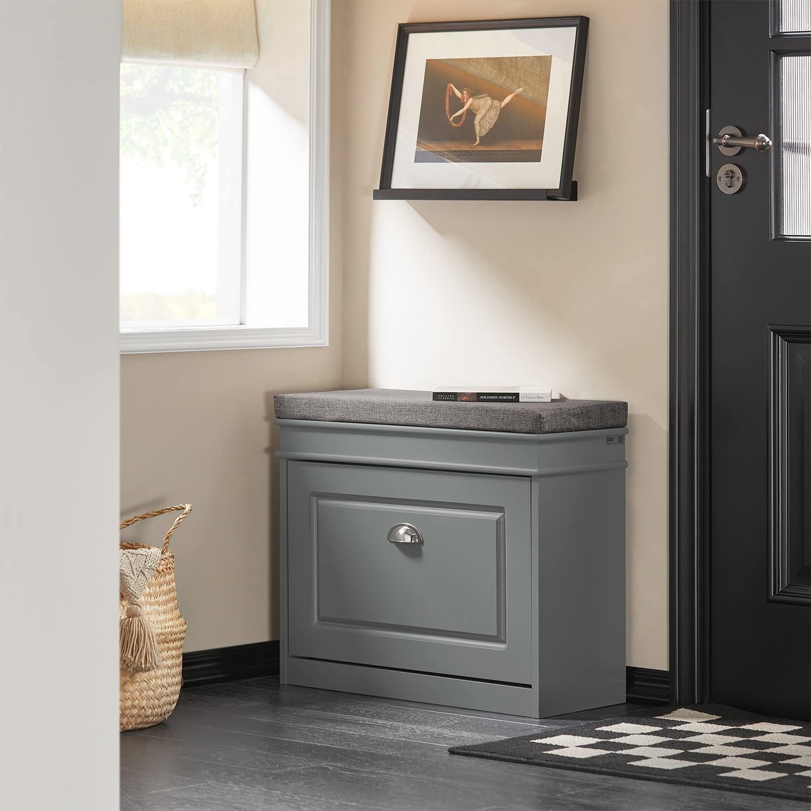 SoBuy Schuhbank mit Sitzkissen und Stauraum Schuhschrank mit Klappe, Schuhregal schmal platzsparende Sitzbank mit Stauraum für Flur, Wohnzimmer, Schlafzimmer, bis 150 kg Hellgrau 60x51x24cm FSR82-K-HG
