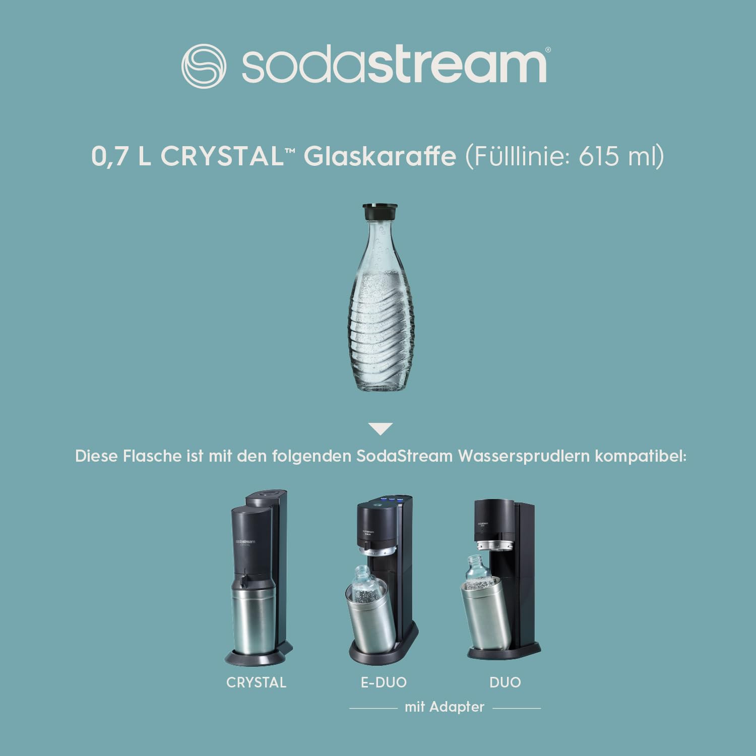 Die formschöne Glaskaraffe mit einem Füllvolumen von 615 ml bis zur Fülllinie garantiert einzigartige Frische und pure Qualität deiner Getränke. Freue dich über stilvolle Individualität und Genuss in seiner besten Form. ANWENDUNG: - Fülle die Glaskaraffe vor der Verwendung des Wassersprudlers bis zur Fülllinie mit Wasser auf - Setzte die Glaskaraffe in deinen Wassersprudler ein - Drücke den Sprudlerkopf 3-5 mal für deine individuelle Sprudelstärke - Geniesse dein frisch gesprudeltes Erfrischungsgetränk! Kennst du schon unsere Sirupe? Einfach in der Flasche mischen für ein individuelles Geschmackserlebnis! PRODUKTSPEZIFIKATIONEN: - Flaschenkapazität : 780ml - Fülllinie: 615ml - Kompatibel mit SodaStream CRYSTAL und PENGUIN WARNHINWEISE: Um Verletzungen zu vermeiden: Die Glaskaraffe NIE einfrieren. Die Glaskaraffe NIE während des Sprudelns entnehmen. NIE Kohlendioxid der leeren Glaskaraffe zusetzen. NIE Glaskaraffen mit Beschädigungen, Rissen oder abgeplatzten Rändern benutzen. Vor dem Gebrauch dieser Glaskaraffe bitte die detaillierte Gebrauchsanweisung, die Du beim Kauf deines SodaStream CRYSTAL/ PiNGUIN Wassersprudlers erhalten haben, lesen. Überprüfe die Glaskaraffe vor jedem Gebrauch auf Risse, Absplitterungen oder andere Schäden. WARNUNG: Falls die Glaskaraffe während des Sprudelvorgangs bersten sollte, öffne den SodaStream CRYSTAL/ PENGUIN Wassersprudler NICHT. Wende dich bitte an den Kundenservice von SodaStream. UMWELT: Du leistest einen aktiven Beitrag zum Umweltschutz, da Du tausende Flaschen einsparst - das Sprudelwasser kann auch mit Sirup geschmacklich verfeinert werden.