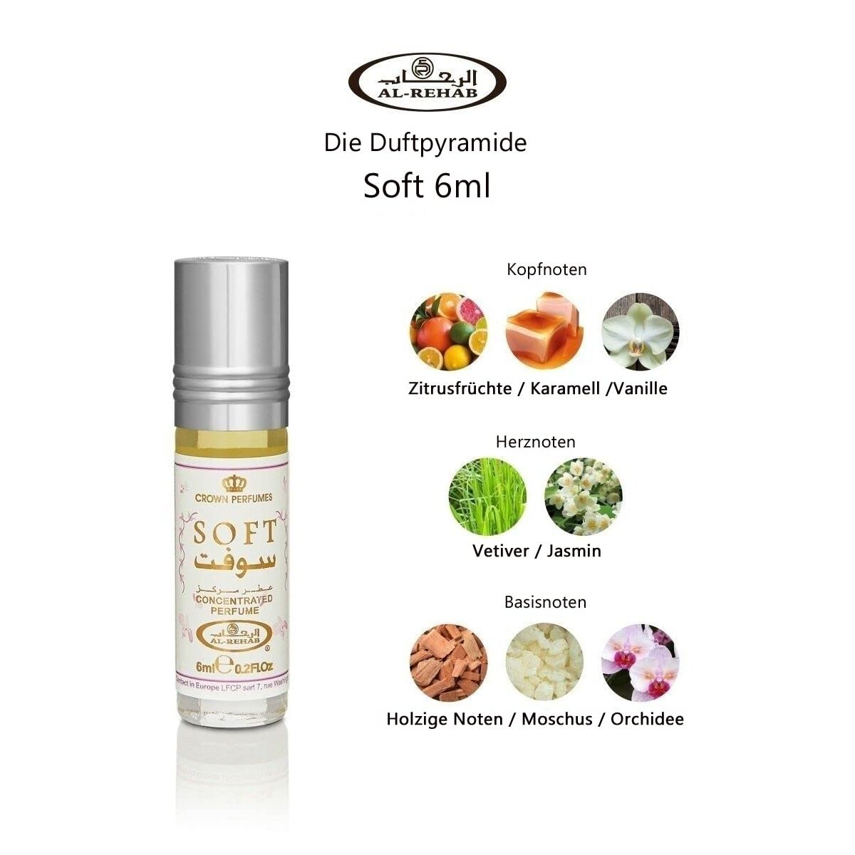 ➤ Soft von Al-Rehab ist ein Duft, der die Sinne betört und die Vorstellungskraft anregt. Die Kopfnote vereint erfrischende Zitrusfrüchte mit süssem Karamell und verführerischer Vanille, um ein angenehmes und süchtig machendes Aroma zu schaffen.