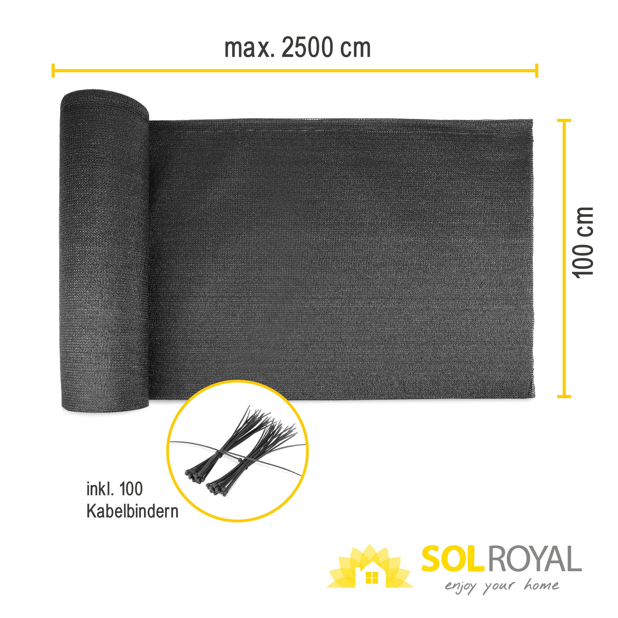 Sol Royal Schattennetz 25m x 1m Schattiergewebe 165g/m² – Blickdichter Sonnenschutz mit UV-Schutz & Kabelbinder für einfache Befestigung – HDPE Sichtschutz Garten Anthrazit für Gewächshaus & Zaun SG80