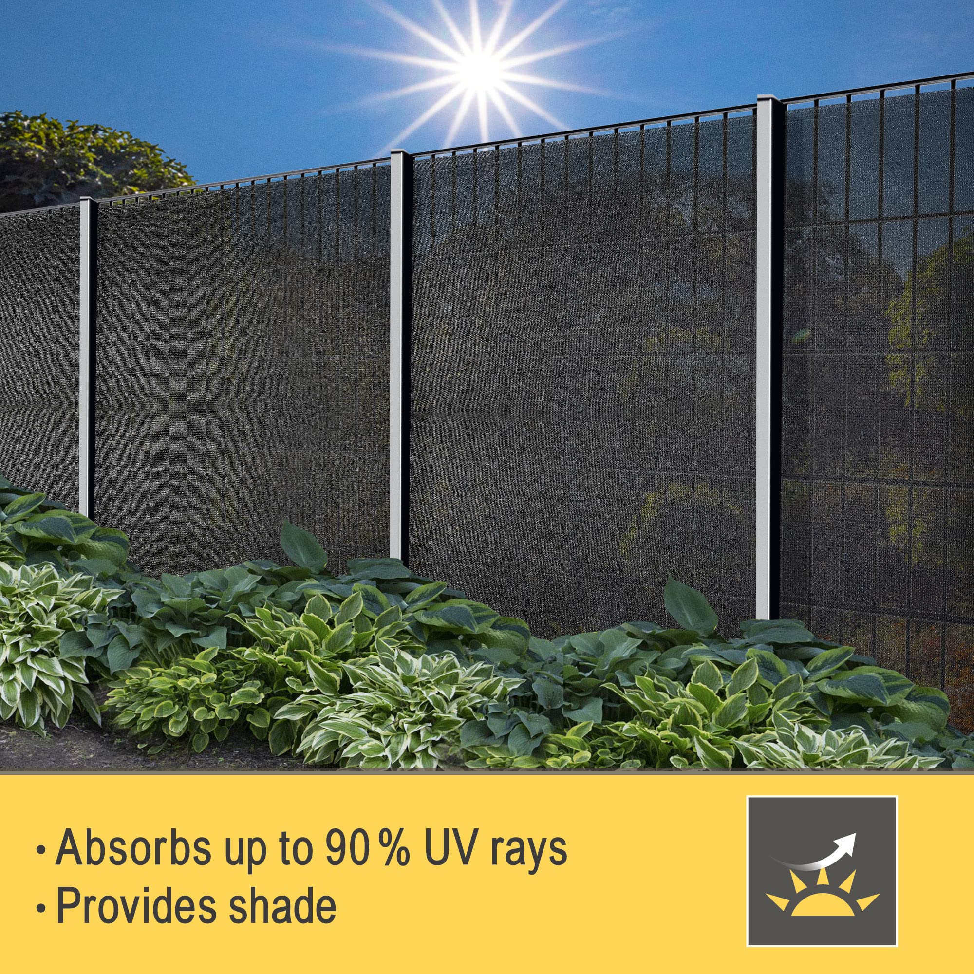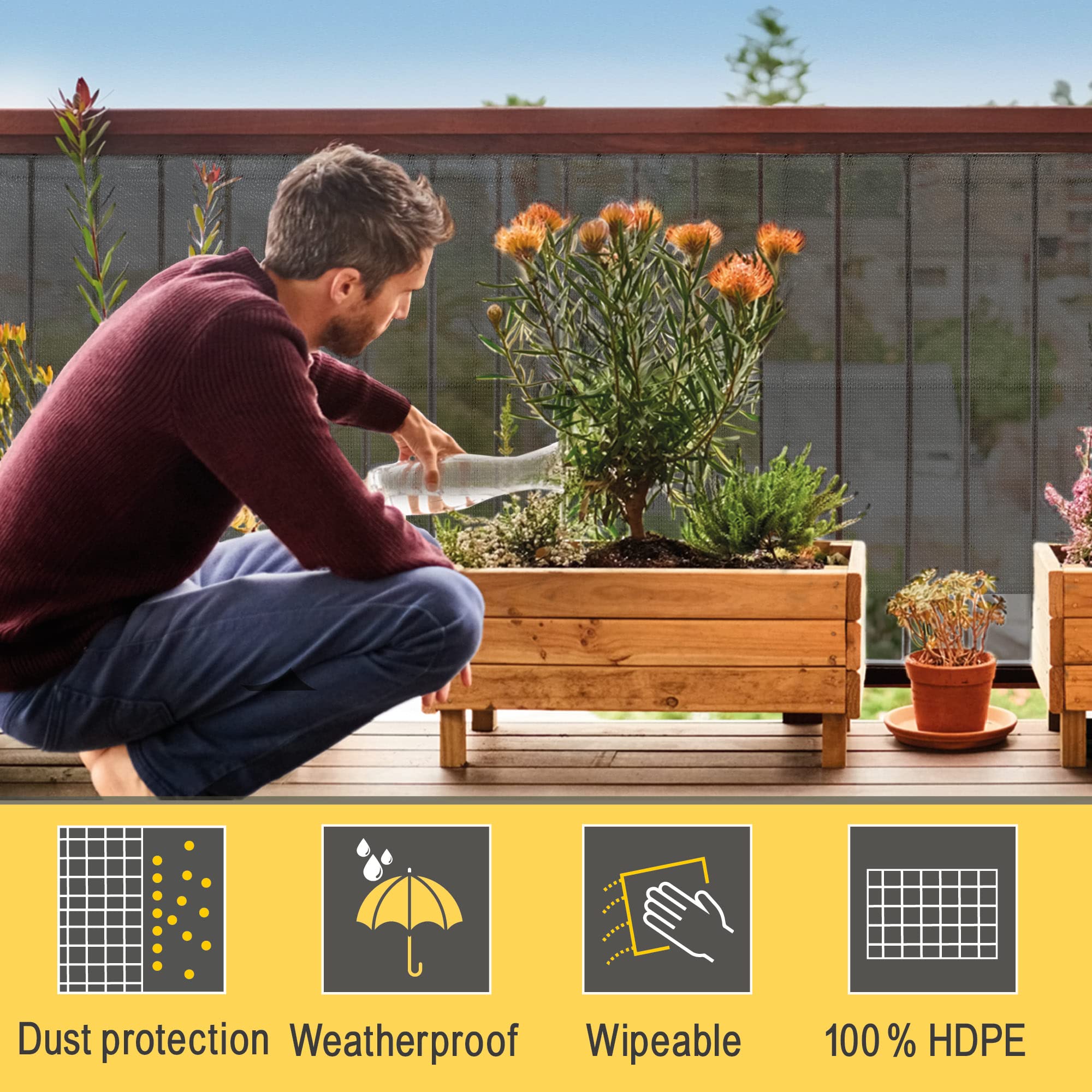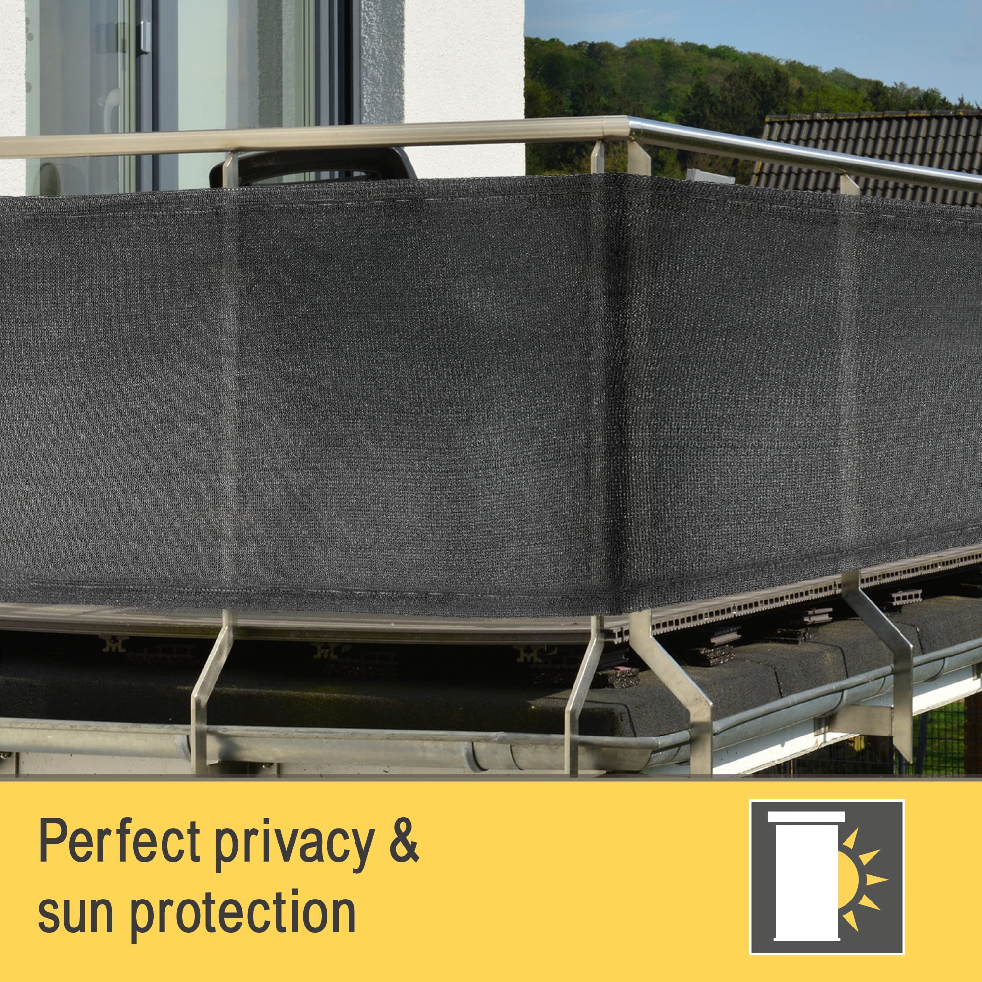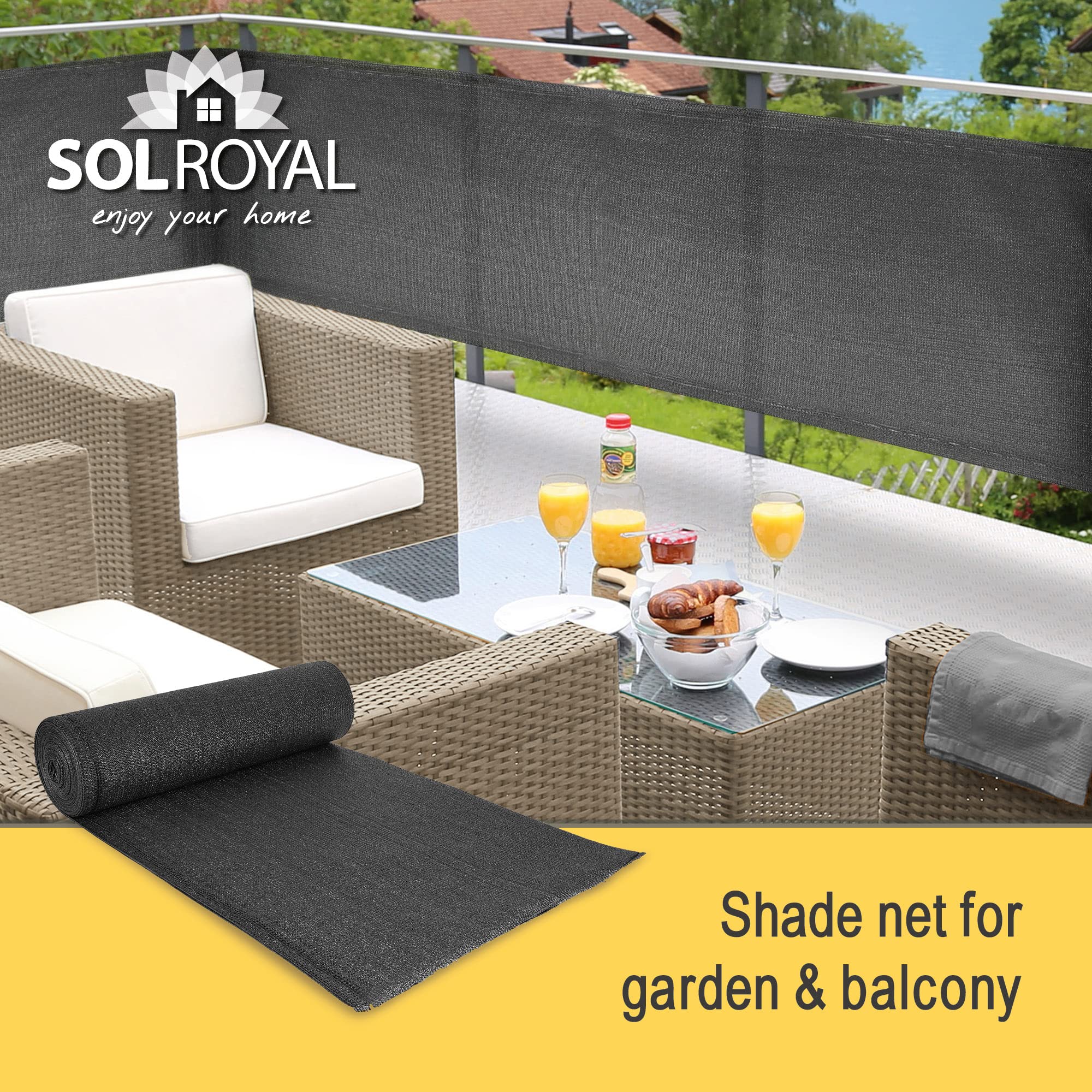 Sol Royal Sichtschutz SG 80 HDPE Der Sichtschutz SG 80 HDPE von Sol Royal schützt Sie vor neugierigen Blicken und bietet einen privaten Raum. Mit den im Lieferumfang enthaltenen Kabelbindern und den im Polyester integrierten Löchern im Abstand von 2 cm können Sie diese Sonnenblende einfach an Ihrer Terrasse, Veranda oder Ihrem Balkon befestigen. Mit der Grammatur von 165 g/m² ist dieser blickdichte Sichtschutz aus HDPE besonders widerstandsfähig gegen Wind und unangenehmes Wetter. Der Stoff ist atmungsaktiv: Luft und Feuchtigkeit können durchströmen, damit der Schimmel im Voraus besiegt wird. Darüber hinaus bietet Ihnen dieser Sichtschutz einen hervorragenden UV-Schutz von 90 %. Die schädliche UV-Strahlung wird blockiert und so Ihr Garten und Ihre Beete werden geschützt. Sie können zwischen den Farben Anthrazit oder Grün und den Höhen von 100, 150 oder 200 cm wählen. Bei der Breite haben Sie die Wahl zwischen 1000cm, 2500cm und 5000cm. Anzahl der Kabelbinder: 50 Stück für 1000 cm, 100 Stück für 2500 cm, 200 Stück für 5000 cm. Das Produkt wird gefaltet in der Verpackung geliefert und sieht dadurch kleiner aus.