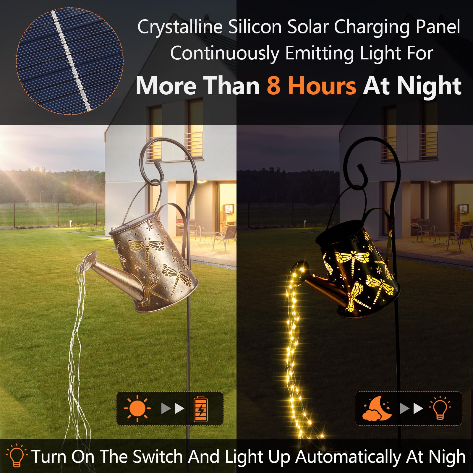 2) Nachts schaltet sich die Solar-Giesskannenleuchte automatisch ein und beleuchtet Ihren Hof, wie eine Gruppe von funkelnden Elfen, die über Ihre Pflanzen und Ihren Garten springen.