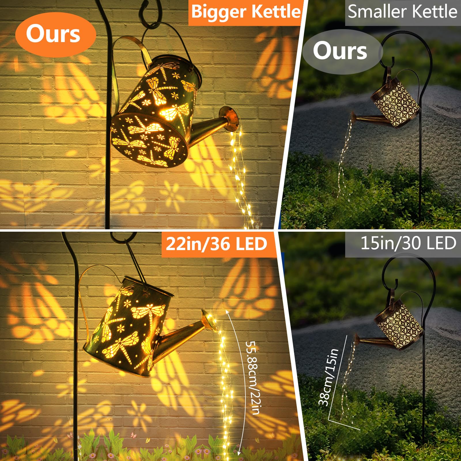 4) Obwohl unsere 2 in 1 Giesskanne mit Lichtern und hängende Solarlaterne mit einem Schafshaken ausgestattet ist, können Sie sie auch an den Baum hängen, um Ihren Weg und Ihre Bäume zu beleuchten.
