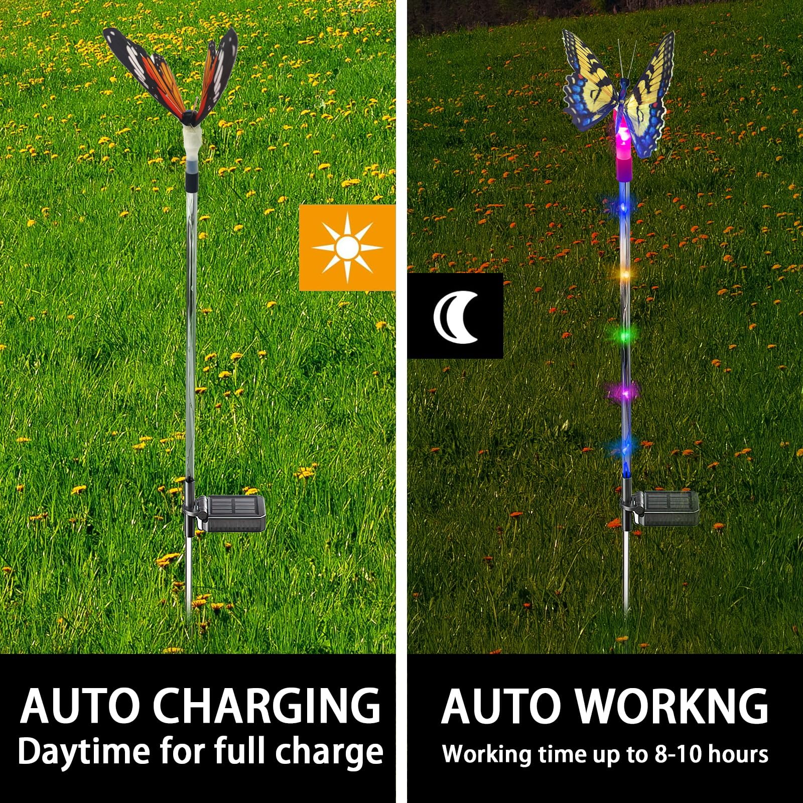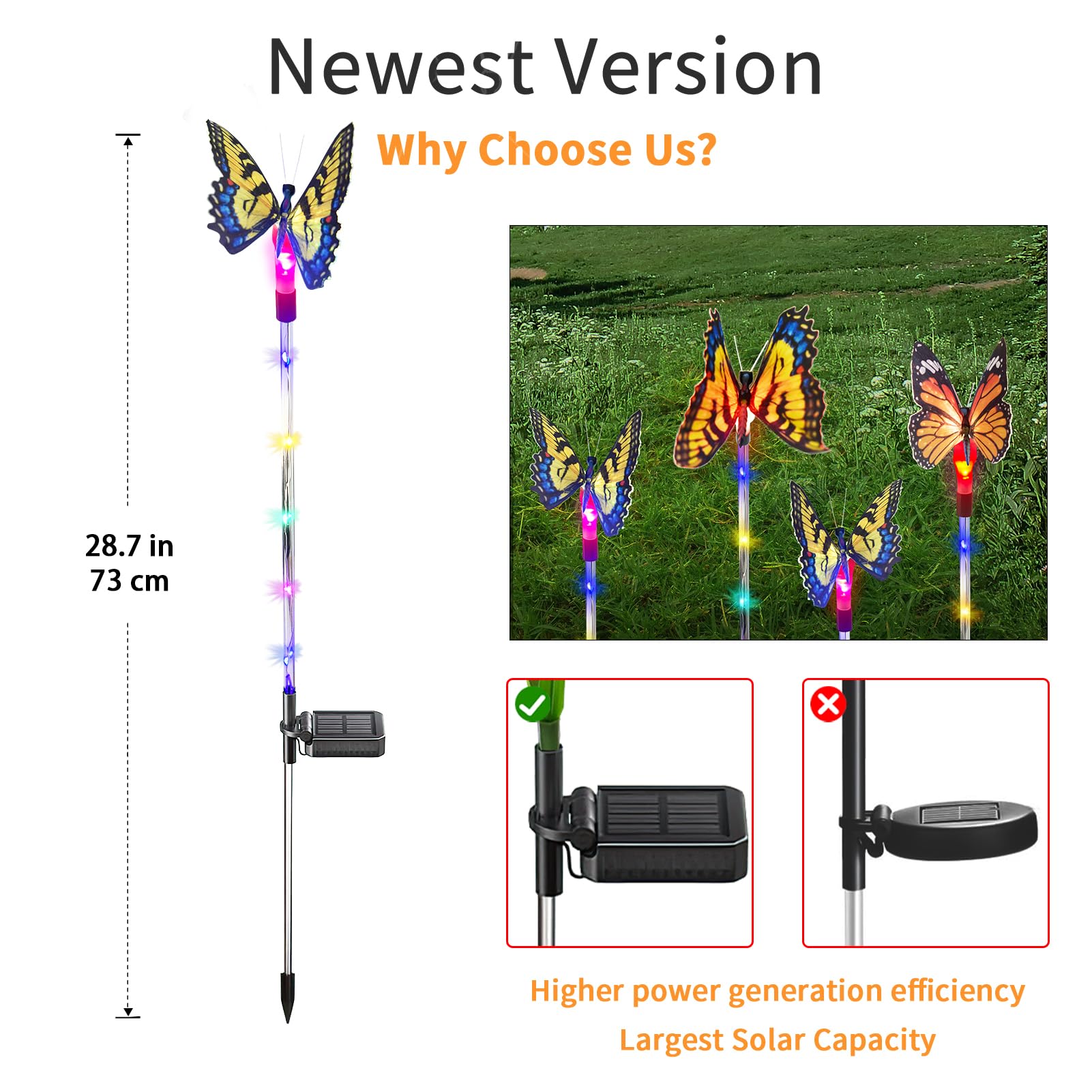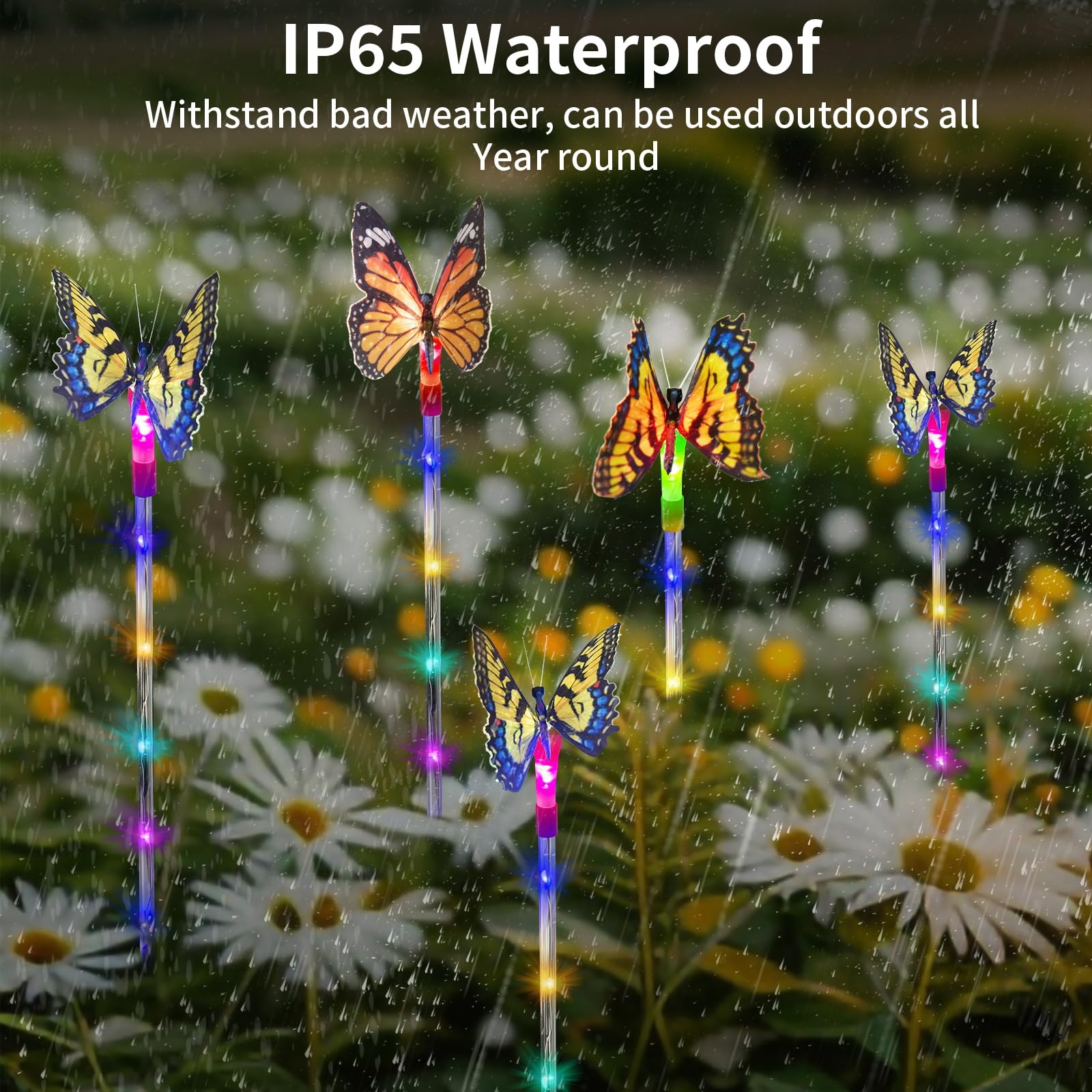 4er-Set Schmetterlings-Solarlampen - Mit 7 farbwechselnden LED-Schmetterlingen und 5 violetten LEDs. Verbessertes Solarpanel für effiziente Energieaufnahme (8h Betrieb). IP65 wasserdicht und hitzebeständig (-20°C bis 50°C). Einfache Installation ohne Kabel - einfach in die Erde stecken. Automatisches Ein-/Ausschalten bei Dämmerung. Ideal für Garten, Terrasse, Blumenbeete und Wege. Schafft romantische Atmosphäre durch sanftes Farbspiel.