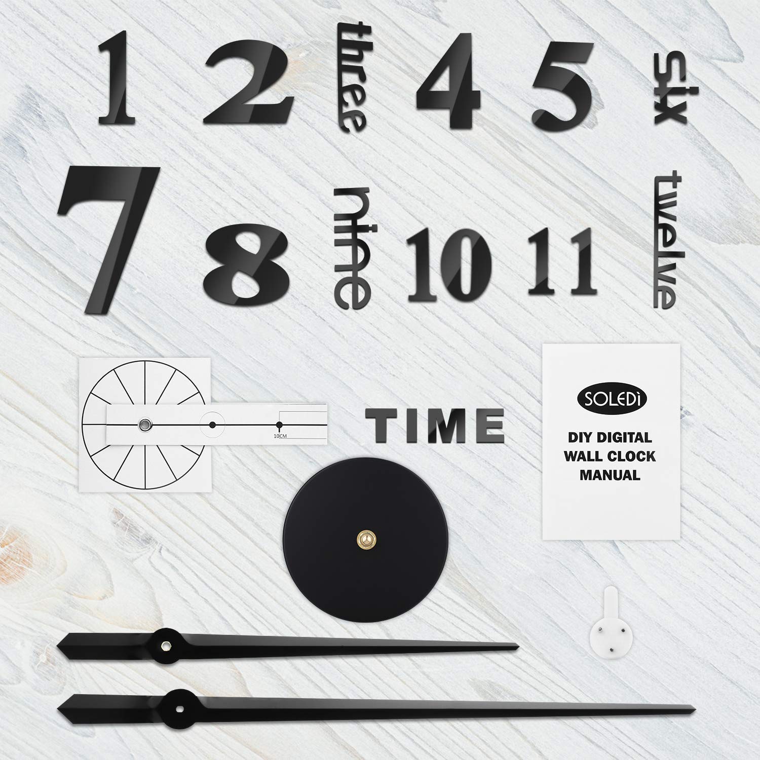 ▶ Packliste:1 * Uhr Zifferblatt2 * Zeiger1 * EVA-Wandaufkleber1 * Hilfsmessstab1 * Acrylspiegel1 * spurloser Nagel1 * Anweisung