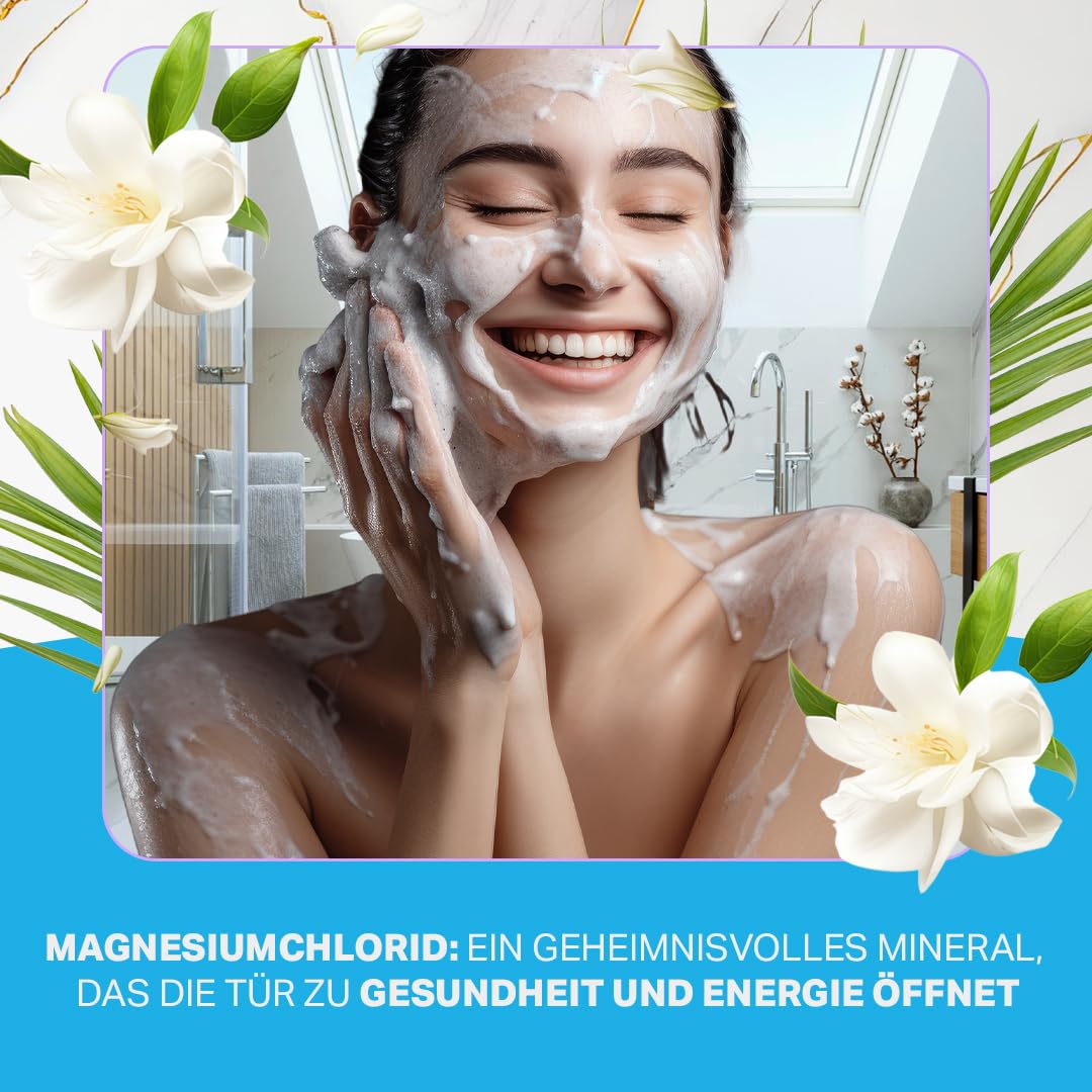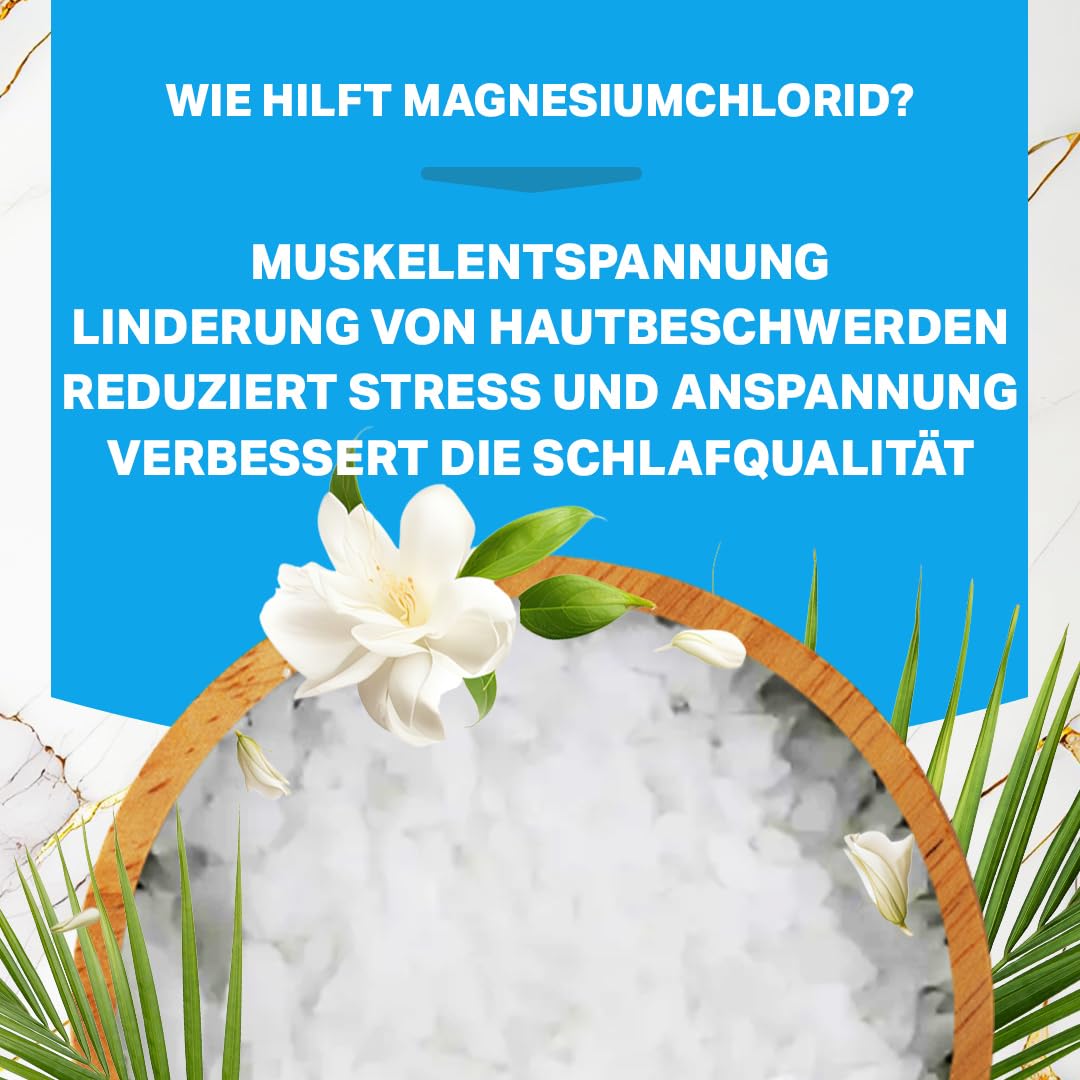 • ✅ Frei von Zusatzstoffen, Duftstoffen oder Farbstoffen – unser Bath Salt enthält ausschliesslich reines Magnesiumchlorid für ein natürliches Badeerlebnis ohne unerwünschte Zusätze.