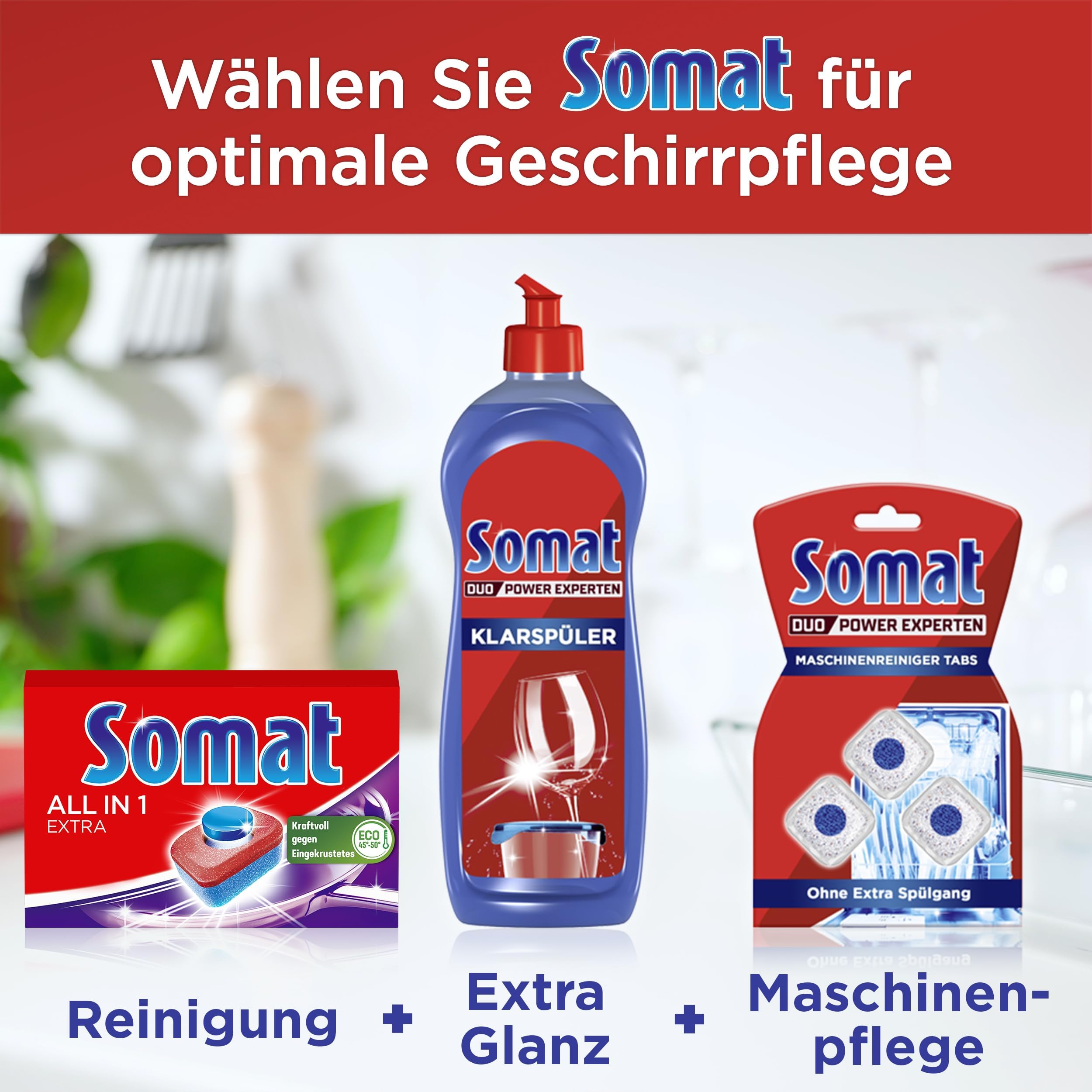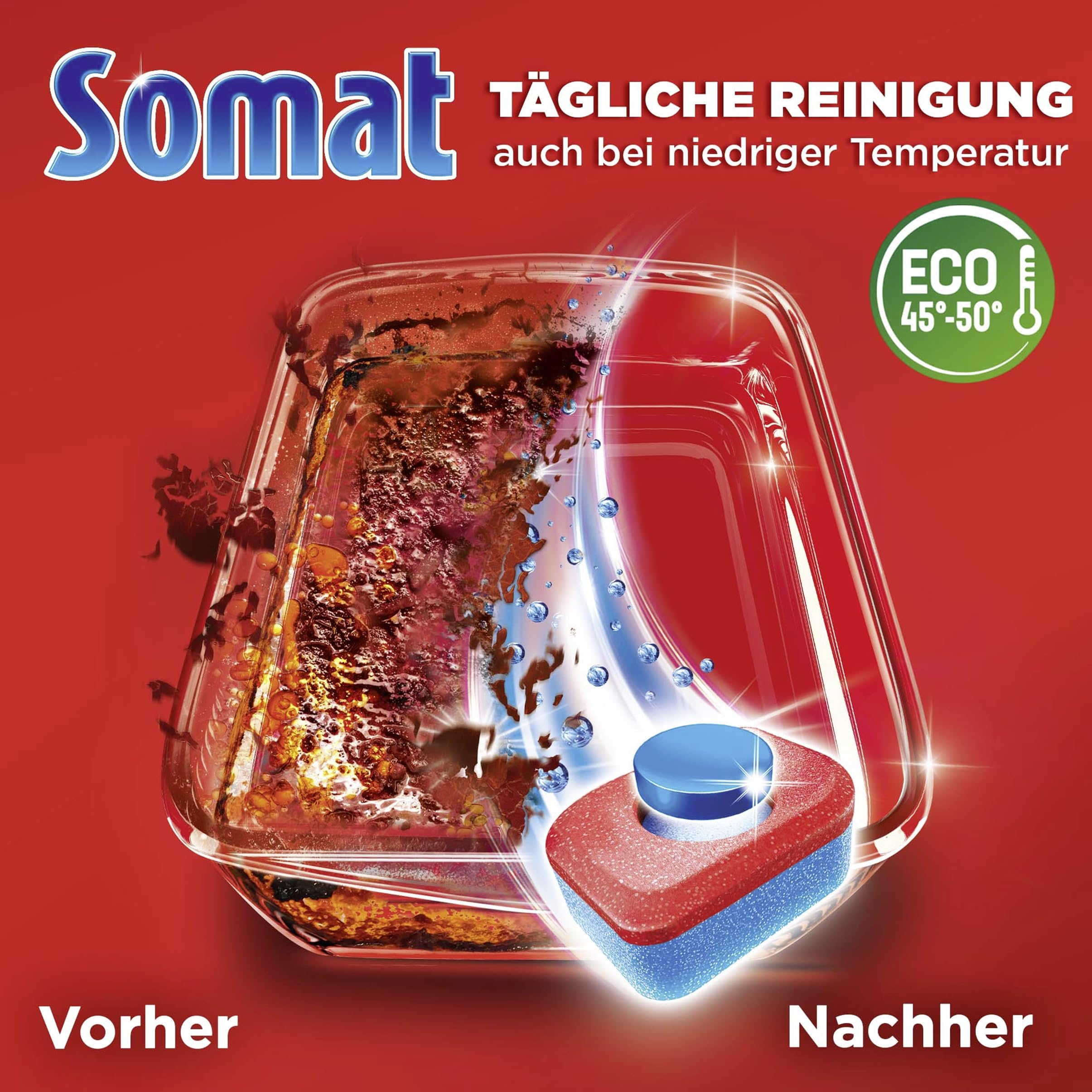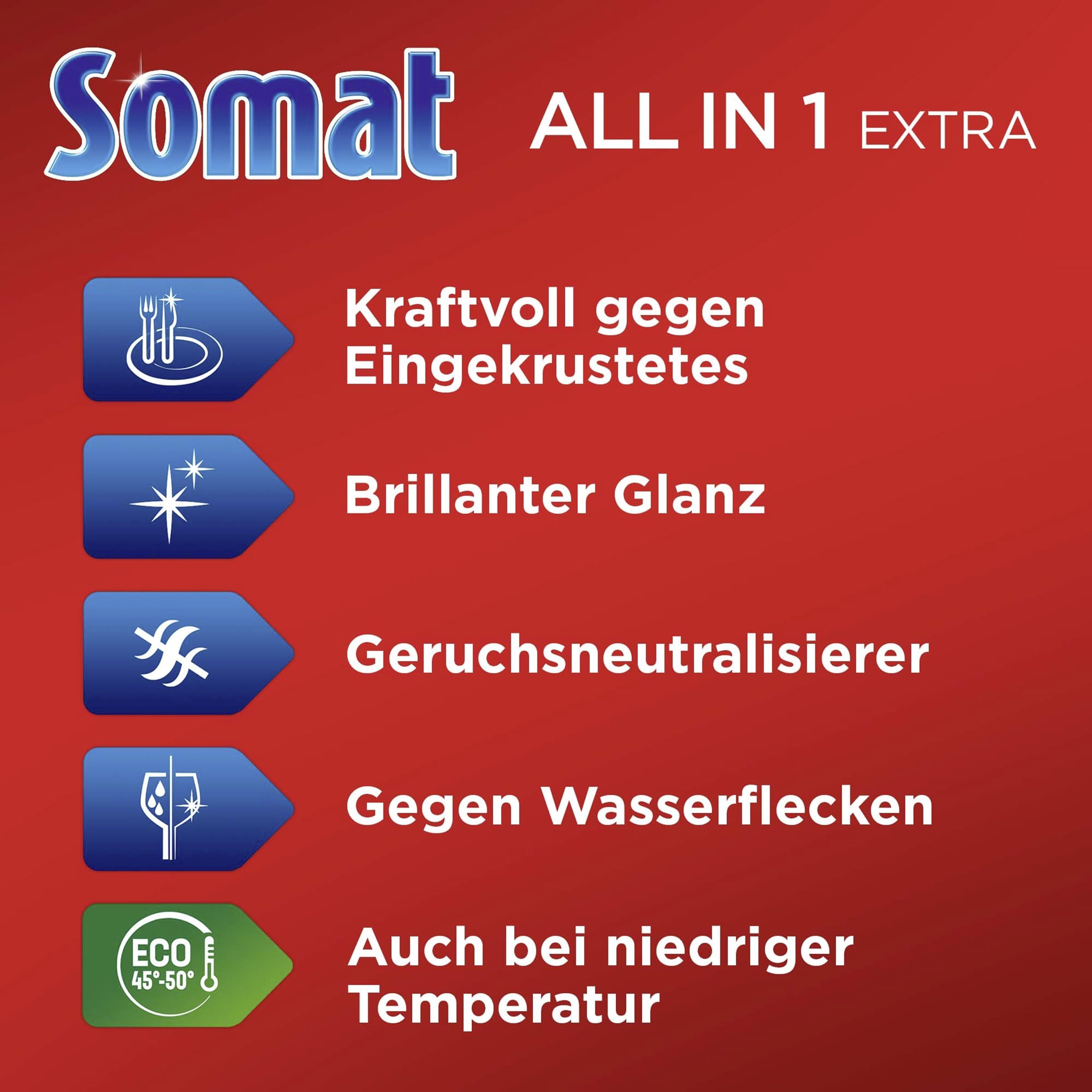 Somat All in 1 ExtraSpül Tabs für strahlende Sauberkeit auch bei niedrigen Temperaturen und im Eco-ProgrammErleben Sie eine starke und effektive Reinigungskraft mit den Somat All-in-1 Extra Geschirrspülmittel-Tabs. Mit ihrer kraftvollen und schnell wirkenden All-in-1 Extra-Formel wirken die Somat Spültabs aktiv gegen Tee- und Kaffeeflecken und entfernen sogar eingetrocknete Speisereste. Die Formel ist schnell auflösend und wirkt so schnell gegen Flecken und Speisereste, selbst bei niedrigen Temperaturen. Mit ihrer Geruchsneutralisierer-Formel bekämpft sie unangenehme Gerüche und sorgt für noch mehr Sauberkeit und Frische. Die All-in-1 Extra Geschirrspültabs eignen sich für alle spülmaschinenfesten Teller, Gläser, Tassen, Flaschen, Töpfe, Pfannen, sowie Silberbesteck. Mit den Somat-Tabs sind Geschirr und Gläser nach jedem Spülgang strahlend sauber, selbst bei niedrigen Temperaturen im Eco-Programm.Somat setzt sich zudem für eine saubere Welt ein: Der Tab hat einen biologisch abbaubaren und wasserlöslichen Film und die Faltschachtel besteht zu 80 % aus recyceltem Karton. Darüber hinaus wird unser Werk mit 100 % erneuerbarem Strom betrieben, und unsere Produktion verursacht keinerlei Abfall auf der Mülldeponie. Die Somat All in 1 Extra Spülmaschinentabs sind speziell für kurze Spülgänge und Eco-Programme bei niedrigen Temperaturen entwickelt. Wechseln Sie den Zyklus und sparen Sie Wasser und bis zu 20 % Energie* mit Somat!Die Produktvorteile im Detail:Tiefenreinigung auch im Eco-Programm & niedrigen TemperaturenPerfekt sauberes GeschirrStrahlender GlanzGeruchsneutralisierer-FormelSchutz vor GlaskorrosionMaschinenpflege-FunktionKeine Wasserflecken oder RückständeAnwendung:Folie entlang der Pfeile aufreissen.Tab direkt in die Dosierkammer der Maschine legen.Tab nicht in den Besteckkorb legen und nicht in das Vorratsgefäss für Salz füllen.* Wie können Sie mit Somat Wasser und Energie sparen?Für leicht verschmutztes Geschirr wählen Sie bitte das Niedrigtemperatur-Kurz-Programm. Für normal verschmutztes Geschirr wählen Sie bitte das Niedrigtemperatur-Eco-Programm. Vermeiden Sie Programme wie „Intensiv“, „Extra-Trocken“ oder besondere Zusatzoptionen zur Verkürzung des Spülprogramms, da diese zu höherem Wasser- und/oder Energieverbrauch führen. Wenn Sie zu einem Niedrigtemperatur Eco- oder Kurz-Programm wechseln, können Sie Wasser und bis zu 20 % Energie sparen und erhalten mit Somat gleichzeitig strahlend sauberes Geschirr. Weitere Tipps unter cleanright.euDie Marke SomatSeit über 50 Jahren steht Somat für innovative Produkte rund um Ihre Geschirrspülmaschine. Seit Einführung des ersten Reinigers für automatische Geschirrspülmaschinen im Jahre 1962 in Deutschland haben wir unsere Produkte ständig weiterentwickelt und neue Standards gesetzt. Deshalb können Sie heute und in Zukunft sicher sein, dass Ihr Geschirr stets strahlend sauber und glänzend wird. Somat, seit über vier Jahrzehnten Sauberkeit mit Glanzgarantie.