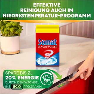 • Das Somat Classic Spülmaschinen-Pulver ist äusserst schonend für die Umwelt: Es ist phosphatfrei und erzielt ein brillantes Reinigungsergebnis schon ab einer Temperatur von 40°C