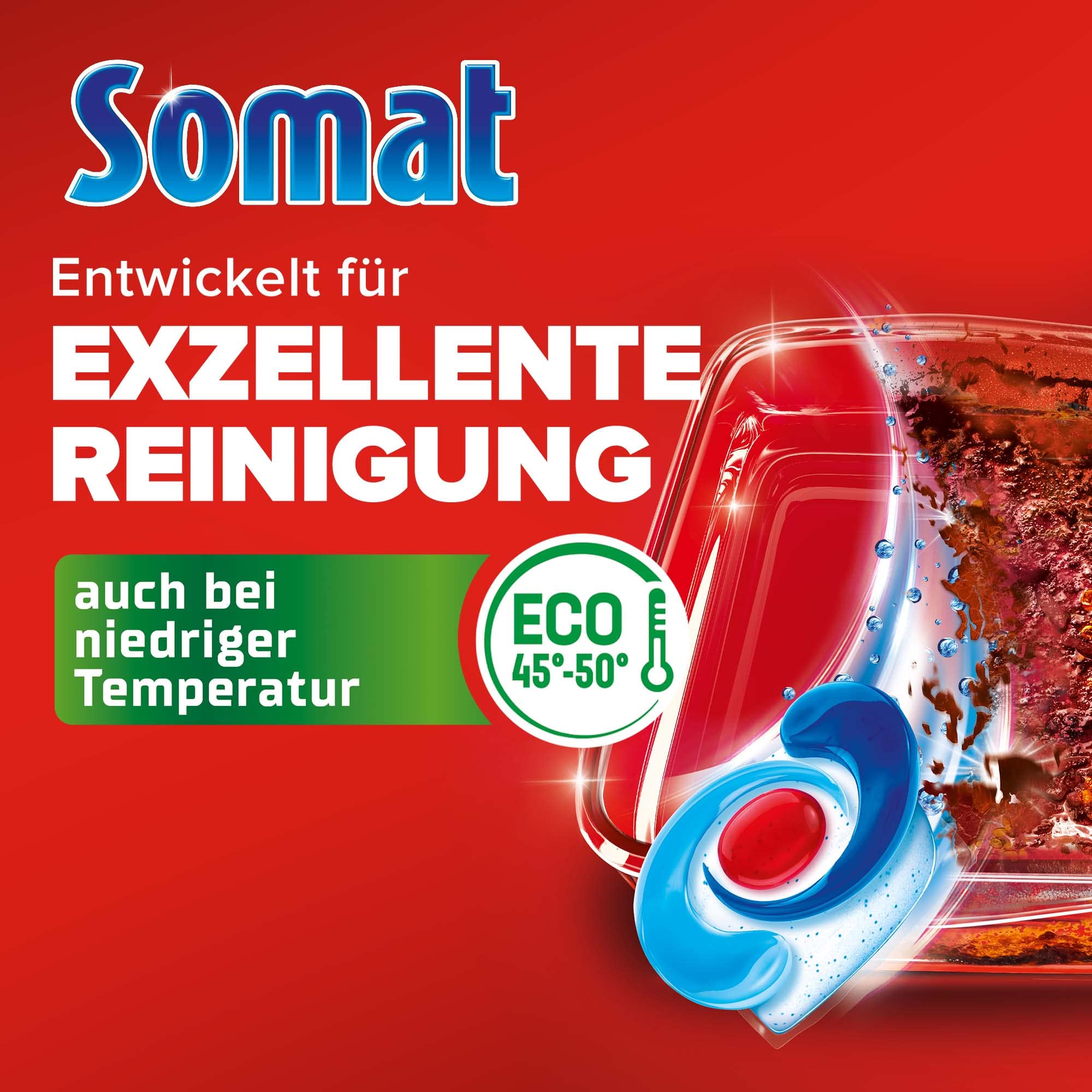 Somat Exellence 4in1 Caps – für exzellente Reinigung, Glanz und Pflege für Geschirr und Maschine Die 4in1 Caps kombinieren gleich 4 Kräfte: Tiefenreinigung gegen eingebrannte Speisereste und Fettablagerungen, Anti-Wasserflecken für makellosen Glanz, Schutz vor Korrosion für empfindliches Geschirr und Pflege für die Spülmaschine. In einer biologisch abbaubaren und 100 % wasserlöslichen Hülle kombinieren die schnellauflösenden Spülmaschinen Caps Pulver und 3 feste Gelkammern. Mit ihrer kraftvollen Enzymformel lösen die Excellence 4in1 Caps selbst eingebrannte Speisereste, Fettablagerungen und hartnäckige Flecken, sogar bei niedrigen Temperaturen und im Eco-Programm. Die Somat Caps eignen sich für alle spülmaschinenfesten Teller, Gläser, Tassen, Flaschen, Töpfe, Plastik und Pfannen. Eine Nachbehandlung oder Polieren sind nicht nötig! Für strahlend sauberes Geschirr nach jedem Spülzyklus! Somat setzt sich zudem für eine saubere Welt ein: Der Cap hat einen biologisch abbaubaren und wasserlöslichen Film. Darüber hinaus wird unser Werk mit 100 % erneuerbarem Strom betrieben, und unsere Produktion verursacht keinerlei Abfall auf der Mülldeponie. Die Somat Spülmaschinencaps sind speziell für kurze Spülgänge und Eco-Programme bei niedrigen Temperaturen entwickelt. Wechseln Sie den Zyklus und sparen Sie Wasser und bis zu 20 % Energie* mit Somat! Hinweise: Nicht geeignet für Silberbesteck Die Produktvorteile im Detail: Tiefenreinigung selbst im Eco-Programm & bei niedrigen Temperaturen Bekämpft eingebrannte Speisereste und Fettablagerungen Verleiht makellos sauberes Geschirr und einen fleckenfreien Glanz Geruchsneutralisierer-Formel Schutz vor Glaskorrosion Maschinenpflege-Funktion Recycelbare Verpackung: Biologisch abbaubare und 100 % wasserlösliche Hülle Recycelbare Verpackung Dosierung: 1 Cap pro Spülzyklus Anwendung: 1. Einfach und sauber: Wasserlösliche Hülle muss nicht entfernt werden. 2. Cap direkt in die Dosierkammer der Maschine geben. 3. Cap nicht in den Besteckkorb legen. Cap nicht in das Vorratsgefäss für Salz geben. *Wie können Sie mit Somat Wasser und Energie sparen? Für leicht verschmutztes Geschirr wählen Sie bitte das Niedrigtemperatur-Kurz-Programm. Für normal verschmutztes Geschirr wählen Sie bitte das Niedrigtemperatur-Eco-Programm. Vermeiden Sie Programme wie „Intensiv“, „Extra-Trocken“ oder besondere Zusatzoptionen zur Verkürzung des Spülprogramms, da diese zu höherem Wasser- und/oder Energieverbrauch führen. Wenn Sie zu einem Niedrigtemperatur Eco- oder Kurz-Programm wechseln, können Sie Wasser und bis zu 20 % Energie sparen und erhalten mit Somat gleichzeitig strahlend sauberes Geschirr. Weitere Tipps unter cleanright.eu Die Marke Somat Seit über 50 Jahren steht Somat für innovative Produkte rund um Ihre Geschirrspülmaschine. Seit Einführung des ersten Reinigers für automatische Geschirrspülmaschinen im Jahre 1962 in Deutschland haben wir unsere Produkte ständig weiterentwickelt und neue Standards gesetzt. Deshalb können Sie heute und in Zukunft sicher sein, dass Ihr Geschirr stets strahlend sauber und glänzend wird. Somat – seit über vier Jahrzehnten Sauberkeit mit Glanzgarantie.