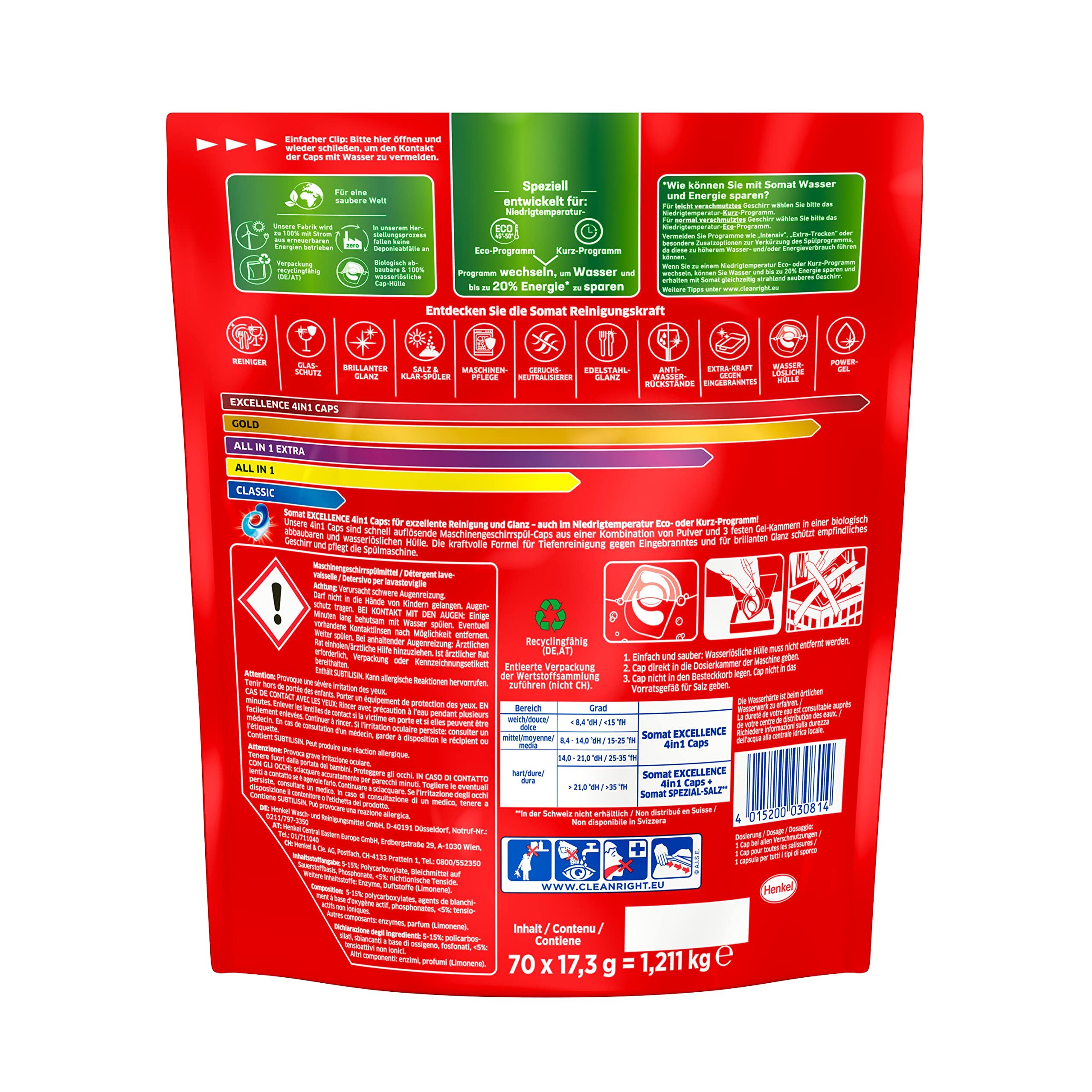 Somat Exellence 4in1 Caps – für exzellente Reinigung, Glanz und Pflege für Geschirr und Maschine Die 4in1 Caps kombinieren gleich 4 Kräfte: Tiefenreinigung gegen eingebrannte Speisereste und Fettablagerungen, Anti-Wasserflecken für makellosen Glanz, Schutz vor Korrosion für empfindliches Geschirr und Pflege für die Spülmaschine. In einer biologisch abbaubaren und 100 % wasserlöslichen Hülle kombinieren die schnellauflösenden Spülmaschinen Caps Pulver und 3 feste Gelkammern. Mit ihrer kraftvollen Enzymformel lösen die Excellence 4in1 Caps selbst eingebrannte Speisereste, Fettablagerungen und hartnäckige Flecken, sogar bei niedrigen Temperaturen und im Eco-Programm. Die Somat Caps eignen sich für alle spülmaschinenfesten Teller, Gläser, Tassen, Flaschen, Töpfe, Plastik und Pfannen. Eine Nachbehandlung oder Polieren sind nicht nötig! Für strahlend sauberes Geschirr nach jedem Spülzyklus! Somat setzt sich zudem für eine saubere Welt ein: Der Cap hat einen biologisch abbaubaren und wasserlöslichen Film. Darüber hinaus wird unser Werk mit 100 % erneuerbarem Strom betrieben, und unsere Produktion verursacht keinerlei Abfall auf der Mülldeponie. Die Somat Spülmaschinencaps sind speziell für kurze Spülgänge und Eco-Programme bei niedrigen Temperaturen entwickelt. Wechseln Sie den Zyklus und sparen Sie Wasser und bis zu 20 % Energie* mit Somat! Hinweise: Nicht geeignet für Silberbesteck Die Produktvorteile im Detail: Tiefenreinigung selbst im Eco-Programm & bei niedrigen Temperaturen Bekämpft eingebrannte Speisereste und Fettablagerungen Verleiht makellos sauberes Geschirr und einen fleckenfreien Glanz Geruchsneutralisierer-Formel Schutz vor Glaskorrosion Maschinenpflege-Funktion Recycelbare Verpackung: Biologisch abbaubare und 100 % wasserlösliche Hülle Recycelbare Verpackung Dosierung: 1 Cap pro Spülzyklus Anwendung: 1. Einfach und sauber: Wasserlösliche Hülle muss nicht entfernt werden. 2. Cap direkt in die Dosierkammer der Maschine geben. 3. Cap nicht in den Besteckkorb legen. Cap nicht in das Vorratsgefäss für Salz geben. *Wie können Sie mit Somat Wasser und Energie sparen? Für leicht verschmutztes Geschirr wählen Sie bitte das Niedrigtemperatur-Kurz-Programm. Für normal verschmutztes Geschirr wählen Sie bitte das Niedrigtemperatur-Eco-Programm. Vermeiden Sie Programme wie „Intensiv“, „Extra-Trocken“ oder besondere Zusatzoptionen zur Verkürzung des Spülprogramms, da diese zu höherem Wasser- und/oder Energieverbrauch führen. Wenn Sie zu einem Niedrigtemperatur Eco- oder Kurz-Programm wechseln, können Sie Wasser und bis zu 20 % Energie sparen und erhalten mit Somat gleichzeitig strahlend sauberes Geschirr. Weitere Tipps unter cleanright.eu Die Marke Somat Seit über 50 Jahren steht Somat für innovative Produkte rund um Ihre Geschirrspülmaschine. Seit Einführung des ersten Reinigers für automatische Geschirrspülmaschinen im Jahre 1962 in Deutschland haben wir unsere Produkte ständig weiterentwickelt und neue Standards gesetzt. Deshalb können Sie heute und in Zukunft sicher sein, dass Ihr Geschirr stets strahlend sauber und glänzend wird. Somat – seit über vier Jahrzehnten Sauberkeit mit Glanzgarantie.