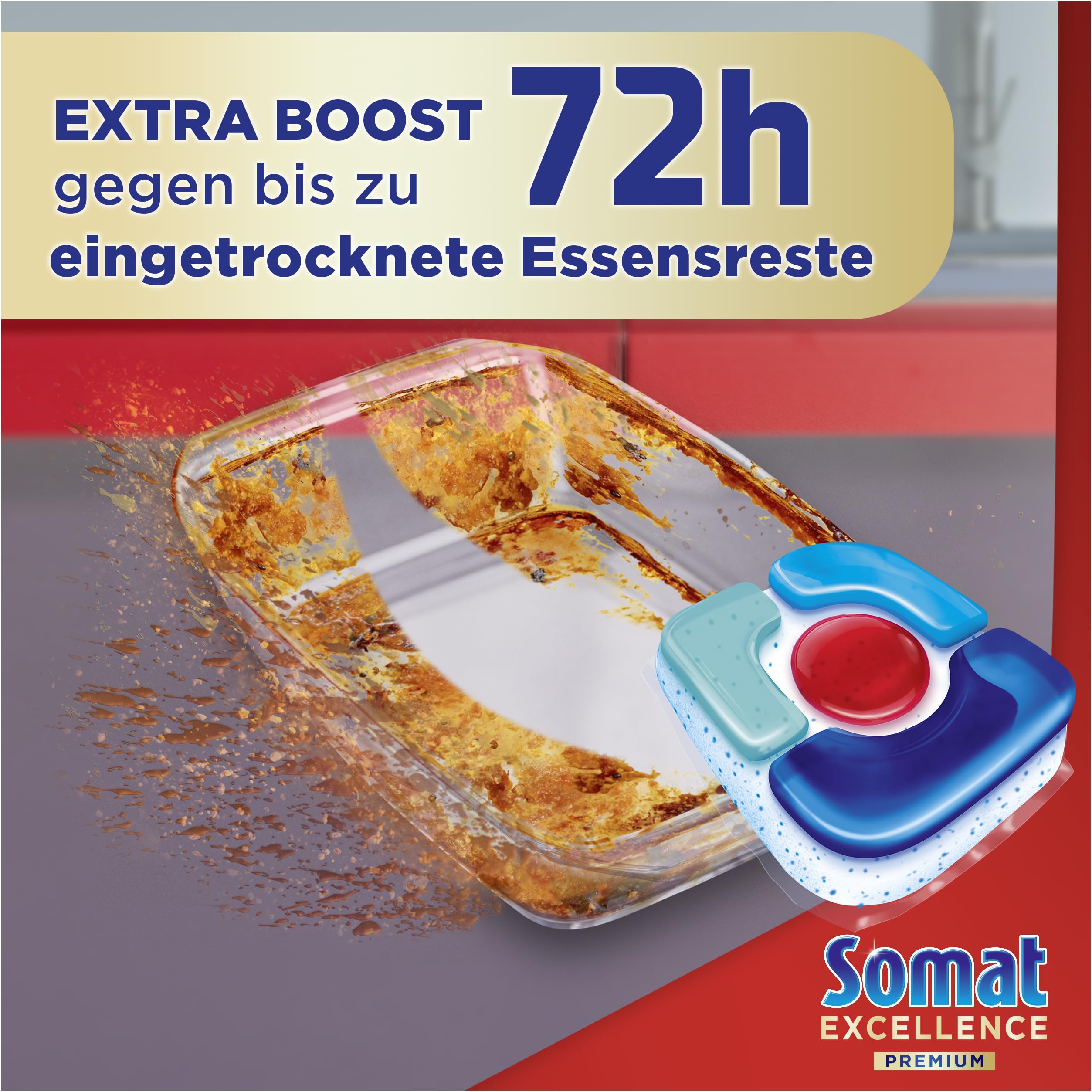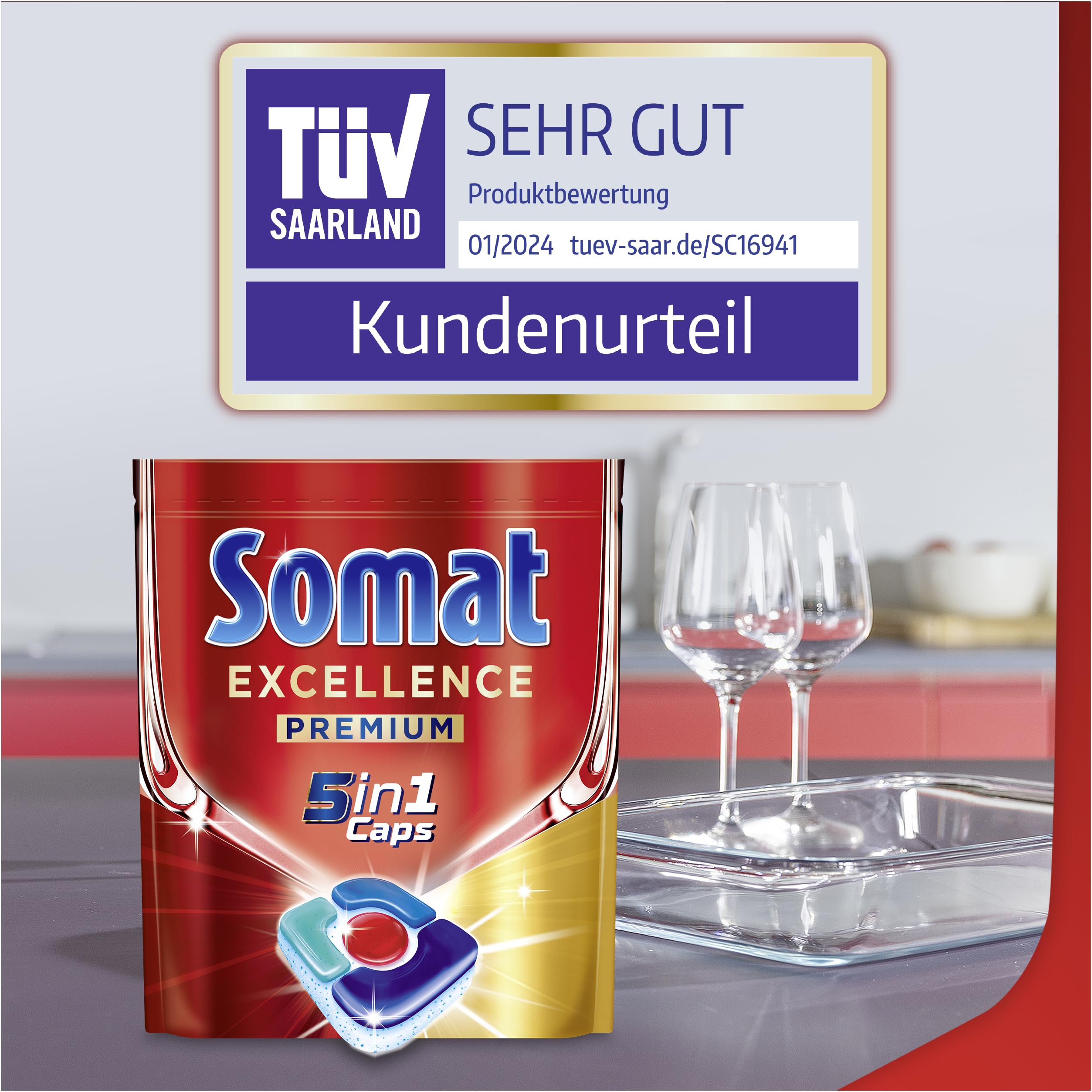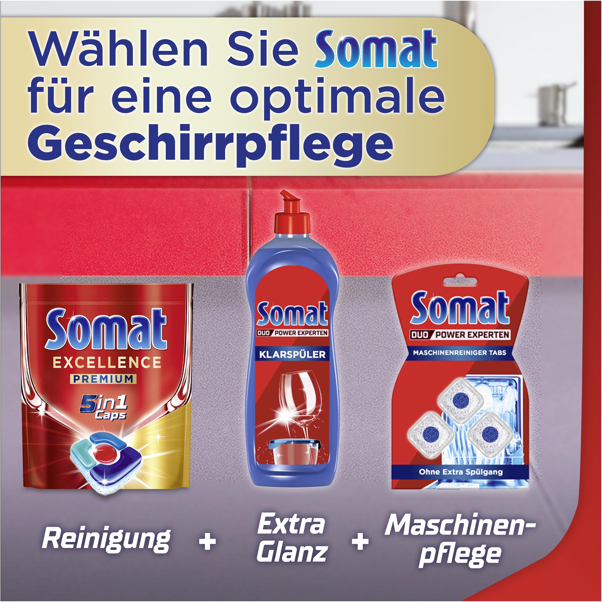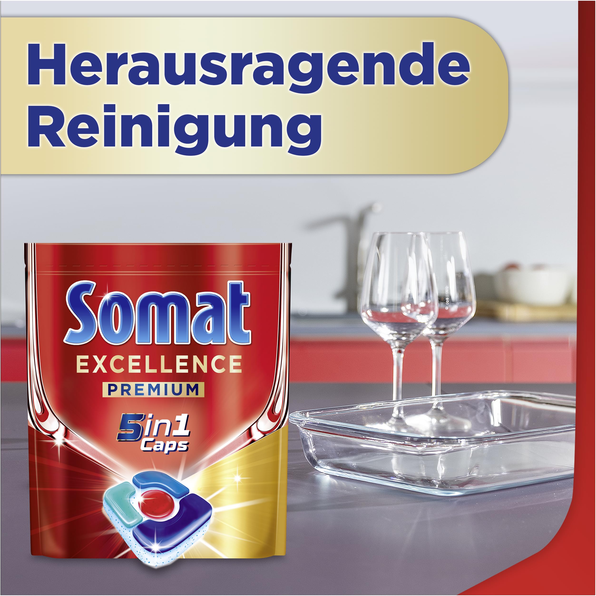 Somat Exellence Premium 5in1 CapsExzellente Reinigung & Extra-Boost gegen bis zu 72 h eingetrocknete, hartnäckige EssensresteDie Premium 5in1 Spülmaschinen Caps kombinieren gleich 5 Kräfte: Tiefenreinigung gegen eingetrocknete, hartnäckige Essensreste und Fettablagerungen, Anti-Wasserflecken für makellosen Glanz, Schutz vor Korrosion für empfindliches Geschirr und Pflege für die Spülmaschine – plus Extra-Boost gegen bis zu 72 h Eingetrocknetes. In einer biologisch abbaubaren und 100 % wasserlöslichen Hülle kombinieren die schnellauflösenden Spülmaschinen Tabs Pulver und 4 feste Gelkammern. Mit ihrer kraftvollen Enzymformel lösen die Excellence Premium 5in1 Caps selbst eingetrocknete Essensreste und Fettablagerungen, sogar bei niedrigen Temperaturen und im Eco-Programm. Die Somat Tabs eignen sich für alle spülmaschinenfesten Teller, Gläser, Tassen, Flaschen, Töpfe, Plastik und Pfannen. Eine Nachbehandlung oder Polieren sind nicht nötig! Für strahlend sauberes Geschirr nach jedem Spülzyklus!Somat setzt sich zudem für eine saubere Welt ein: Das Cap hat einen biologisch abbaubaren und wasserlöslichen Film. Darüber hinaus wird unser Werk mit 100 % erneuerbarem Strom betrieben, und unsere Produktion verursacht keinerlei Abfall auf der Mülldeponie. Die Somat Spülmaschinencaps sind speziell für kurze Spülgänge und Eco-Programme bei niedrigen Temperaturen entwickelt. Wechseln Sie das Programm und sparen Sie Wasser und bis zu 20 % Energie* mit Somat!Die Produktvorteile im Detail:Tiefenreinigung selbst im Eco-Programm & bei niedrigen TemperaturenBekämpft eingetrocknete Essensreste und FettablagerungenExtra-Boost gegen bis zu 72 h EingetrocknetesVerleiht makellos sauberes Geschirr und einen fleckenfreien GlanzGeruchsneutralisierer-FormelSchutz vor GlaskorrosionMaschinenpflege-FunktionRecycelbare Verpackung:Biologisch abbaubare und 100 % wasserlösliche HülleRecycelbare VerpackungDosierung: 1 Cap bei allen VerschmutzungenAnwendung:Einfach und sauber: Wasserlösliche Hülle muss nicht entfernt werden.Cap direkt in die Dosierkammer der Maschine geben.Cap nicht in den Besteckkorb legen. Cap nicht in das Vorratsgefäss für Salz geben.* Wie können Sie mit Somat Wasser und Energie sparen?Für leicht verschmutztes Geschirr wählen Sie bitte das Niedrigtemperatur-Kurz-Programm. Für normal verschmutztes Geschirr wählen Sie bitte das Niedrigtemperatur-Eco-Programm. Vermeiden Sie Programme wie „Intensiv“, „Extra-Trocken“ oder besondere Zusatzoptionen zur Verkürzung des Spülprogramms, da diese zu höherem Wasser- und/oder Energieverbrauch führen. Wenn Sie zu einem Niedrigtemperatur Eco- oder Kurz-Programm wechseln, können Sie Wasser und bis zu 20 % Energie sparen und erhalten mit Somat gleichzeitig strahlend sauberes Geschirr. Weitere Tipps unter cleanright.euDie Marke SomatSeit über 50 Jahren steht Somat für innovative Produkte rund um Ihre Geschirrspülmaschine. Seit Einführung des ersten Reinigers für automatische Geschirrspülmaschinen im Jahre 1962 in Deutschland haben wir unsere Produkte ständig weiterentwickelt und neue Standards gesetzt. Deshalb können Sie heute und in Zukunft sicher sein, dass Ihr Geschirr stets strahlend sauber und glänzend wird. Somat – seit über vier Jahrzehnten Sauberkeit mit Glanzgarantie.