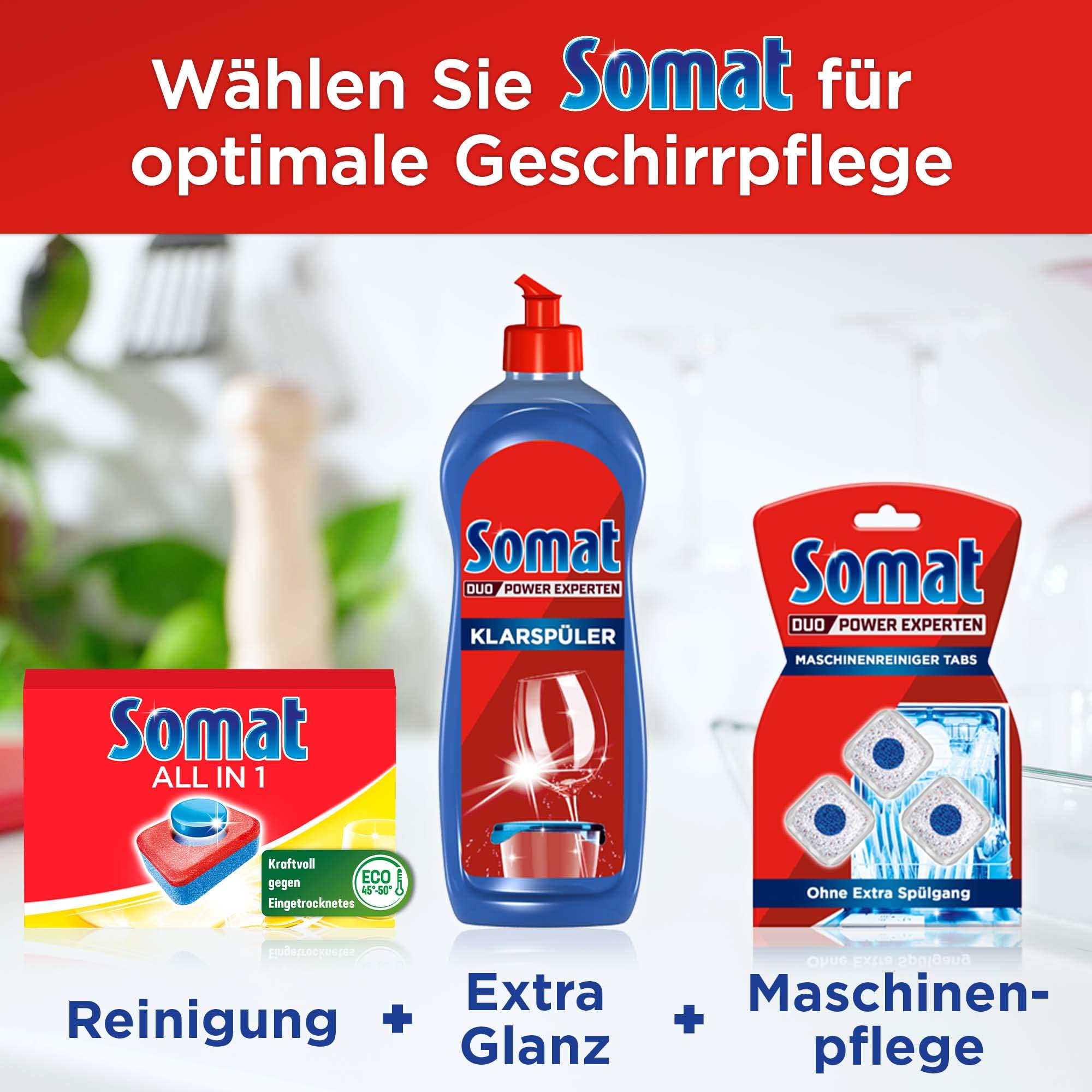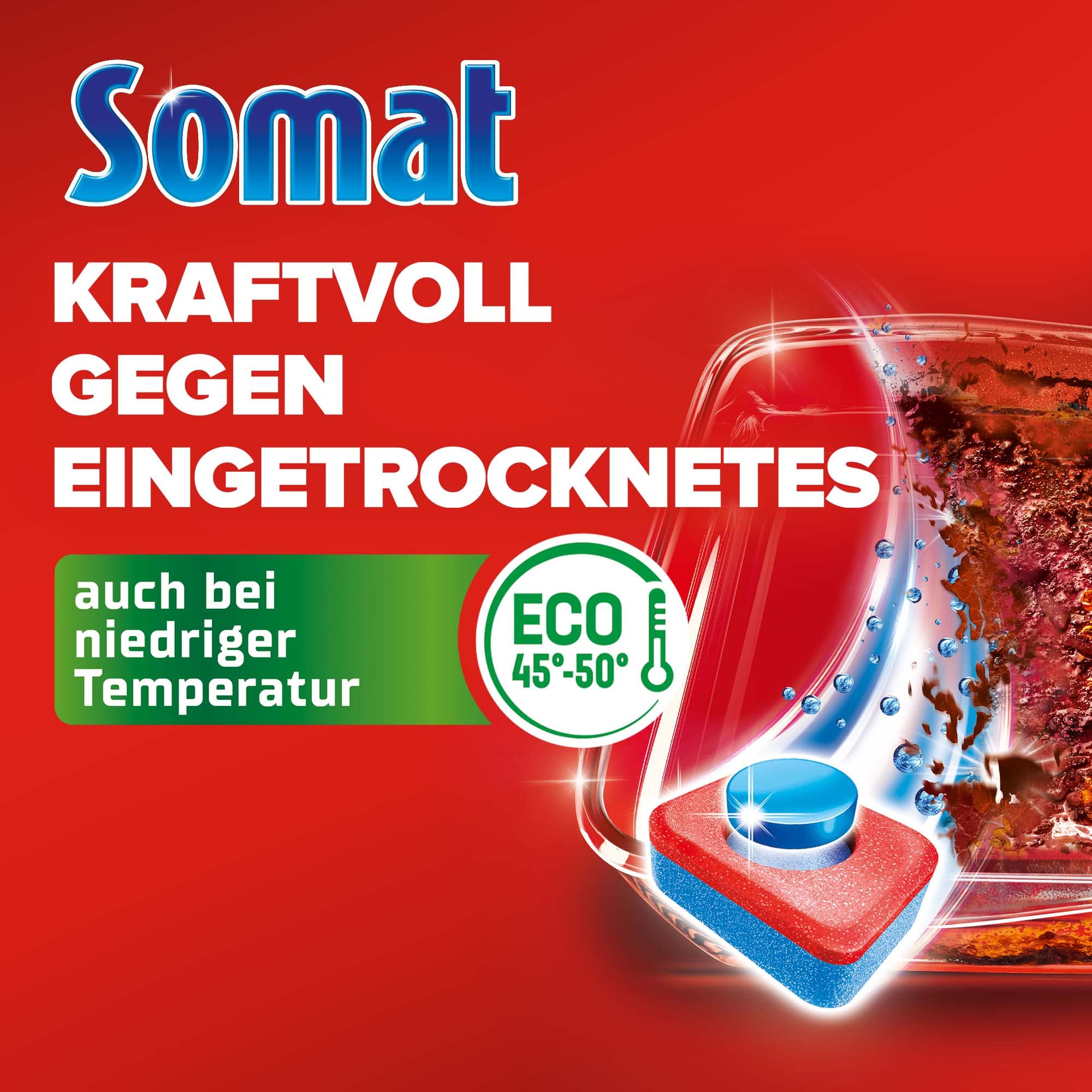 Somat All in 1 – Spül Tabs für strahlende Sauberkeit auch bei niedrigen Temperaturen und im Eco-Programm Erleben Sie eine starke und effektive Reinigungskraft mit den Somat All-in-1 Geschirrspülmittel-Tabs. Mit ihrer kraftvollen und schnell wirkenden All-in-1-Formel wirken die Somat Spültabs aktiv gegen Tee- und Kaffeeflecken und entfernen sogar verkrustete Speisereste. Die Formel ist schnell auflösend und wirkt so schnell gegen Flecken und Speisereste, selbst bei niedrigen Temperaturen. Die All-in-1 Geschirrspültabs eignen sich für alle spülmaschinenfesten Teller, Gläser, Tassen, Flaschen, Töpfe, Pfannen, sowie Silberbesteck. Mit den Somat-Tabs sind Geschirr und Gläser nach jedem Spülgang strahlend sauber, selbst bei niedrigen Temperaturen im Eco-Programm. Somat setzt sich zudem für eine saubere Welt ein: Unser Werk wird mit 100 % erneuerbarem Strom betrieben, und unsere Produktion verursacht keinerlei Abfall auf der Mülldeponie. Die Somat All in 1 Spülmaschinentabs sind speziell für kurze Spülgänge und Eco-Programme bei niedrigen Temperaturen entwickelt. Wechseln Sie den Zyklus und sparen Sie Wasser und bis zu 20 % Energie* mit Somat! Die Produktvorteile im Detail: Tiefenreinigung auch im Eco-Programm & niedrigen Temperaturen Perfekt sauberes Geschirr Strahlender Glanz Geruchsneutralisierer-Formel Schutz vor Glaskorrosion Maschinenpflege-Funktion Anwendung: Folie entlang der Pfeile aufreissen. Tab direkt in die Dosierkammer der Maschine legen. Tab nicht in den Besteckkorb legen und nicht in das Vorratsgefäss für Salz füllen. * Wie können Sie mit Somat Wasser und Energie sparen? Für leicht verschmutztes Geschirr wählen Sie bitte das Niedrigtemperatur-Kurz-Programm. Für normal verschmutztes Geschirr wählen Sie bitte das Niedrigtemperatur-Eco-Programm. Vermeiden Sie Programme wie „Intensiv“, „Extra-Trocken“ oder besondere Zusatzoptionen zur Verkürzung des Spülprogramms, da diese zu höherem Wasser- und/oder Energieverbrauch führen. Wenn Sie zu einem Niedrigtemperatur Eco- oder Kurz-Programm wechseln, können Sie Wasser und bis zu 20 % Energie sparen und erhalten mit Somat gleichzeitig strahlend sauberes Geschirr. Weitere Tipps unter cleanright.eu Die Marke Somat Seit über 50 Jahren steht Somat für innovative Produkte rund um Ihre Geschirrspülmaschine. Seit Einführung des ersten Reinigers für automatische Geschirrspülmaschinen im Jahre 1962 in Deutschland haben wir unsere Produkte ständig weiterentwickelt und neue Standards gesetzt. Deshalb können Sie heute und in Zukunft sicher sein, dass Ihr Geschirr stets strahlend sauber und glänzend wird. Somat, seit über vier Jahrzehnten Sauberkeit mit Glanzgarantie.