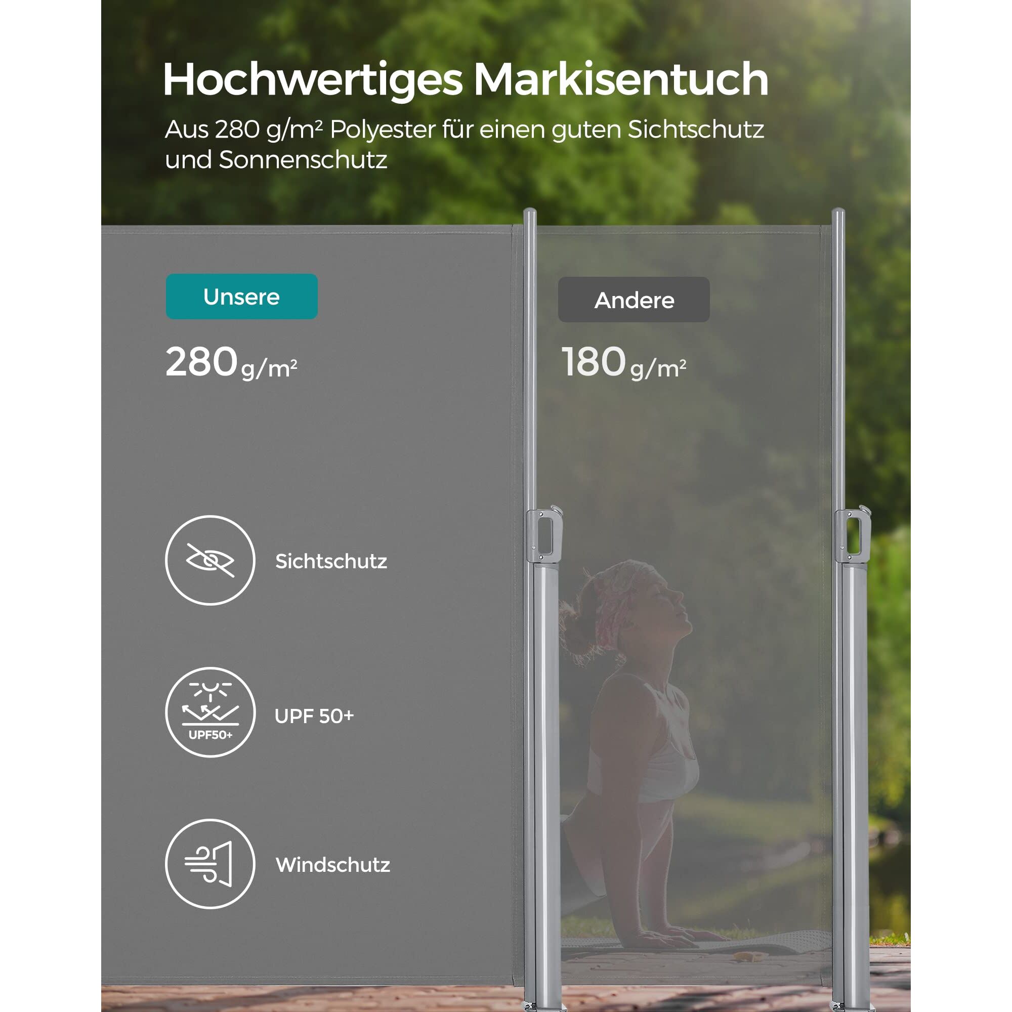 SONGMICS Alu-Seitenmarkise, ausziehbar, 160 x 400 cm, Blickdicht, Sonnenschutz, blickdicht, Seitenrollo, für Balkon, Terrasse, Garten, grau GSA164G03