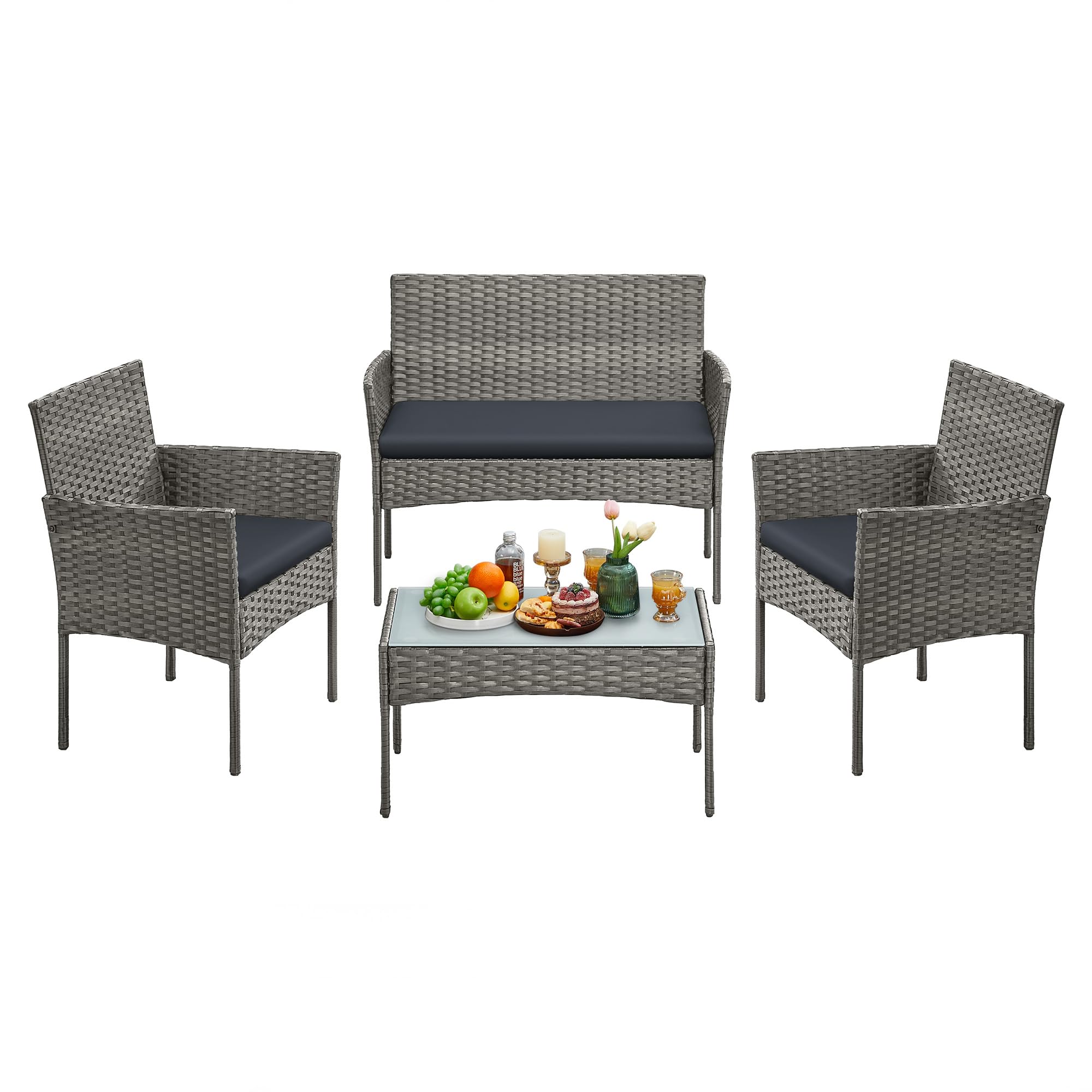 SONGMICS Gartenmöbel-Set, 4-teilig, Balkonmöbel aus PE-Polyrattan, Tisch, 2 Stühle, 2-Sitzer-Bank, Lounge-Möbel Outdoor, Terrassenmöbel, für Terrasse, Balkon, grau GGF004TZ01
