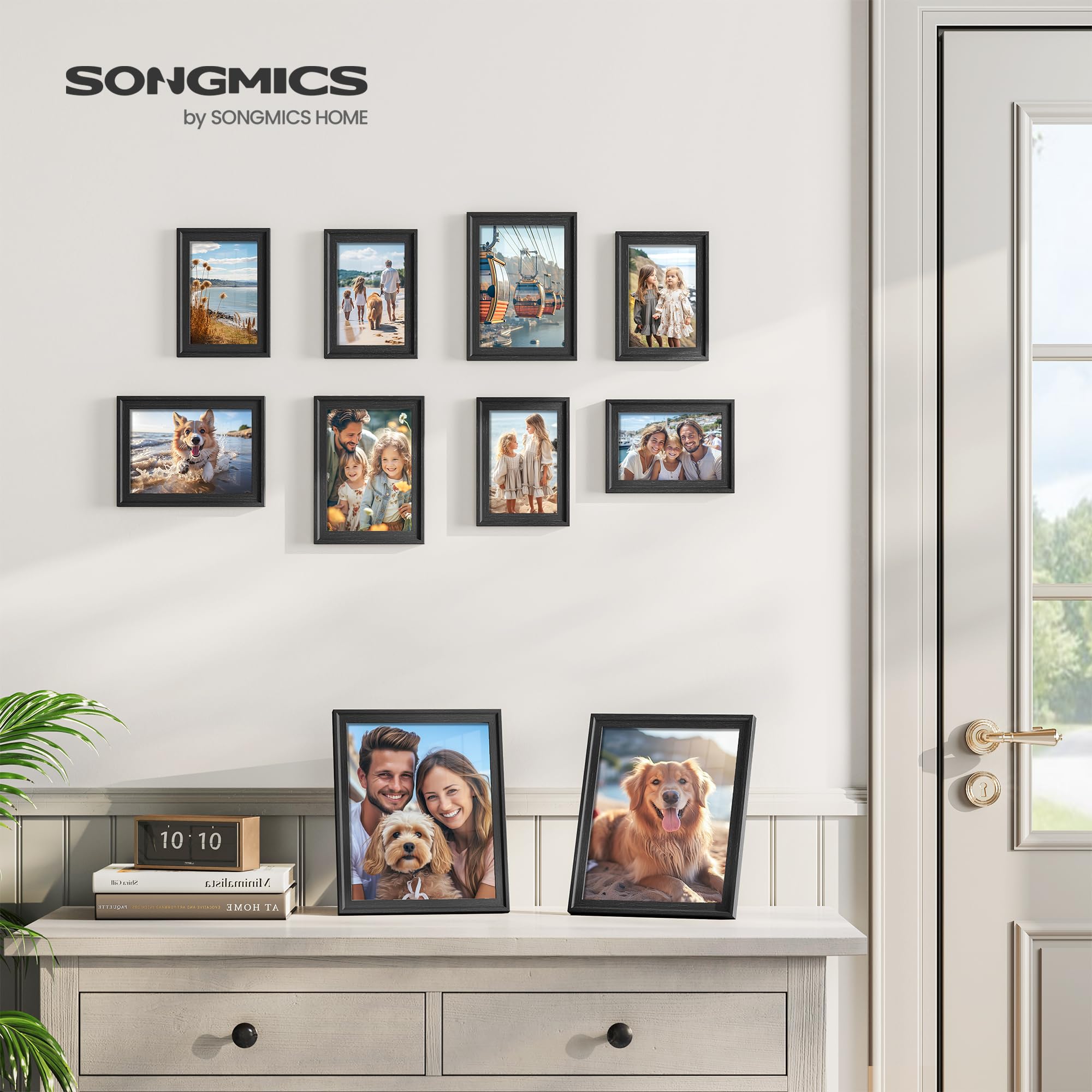 SONGMICS Bilderrahmen 10er Set, 16 Passepartouts, zwei 20 x 25 cm, vier 13 x 18 cm, vier 10 x 15 cm, aufhängen, aufstellen, Glas, 12 spurlose Wandhaken, aschschwarz RPF049B01