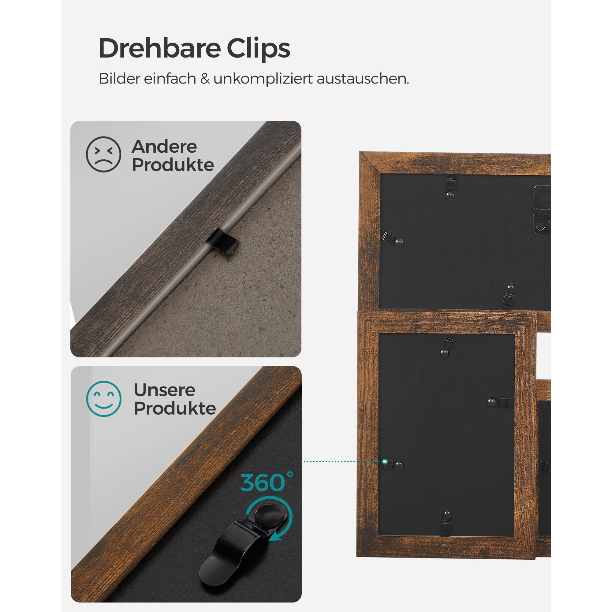 - Die drehbaren Clips auf der Rückseite machen das Austauschen der Fotos mühelos.