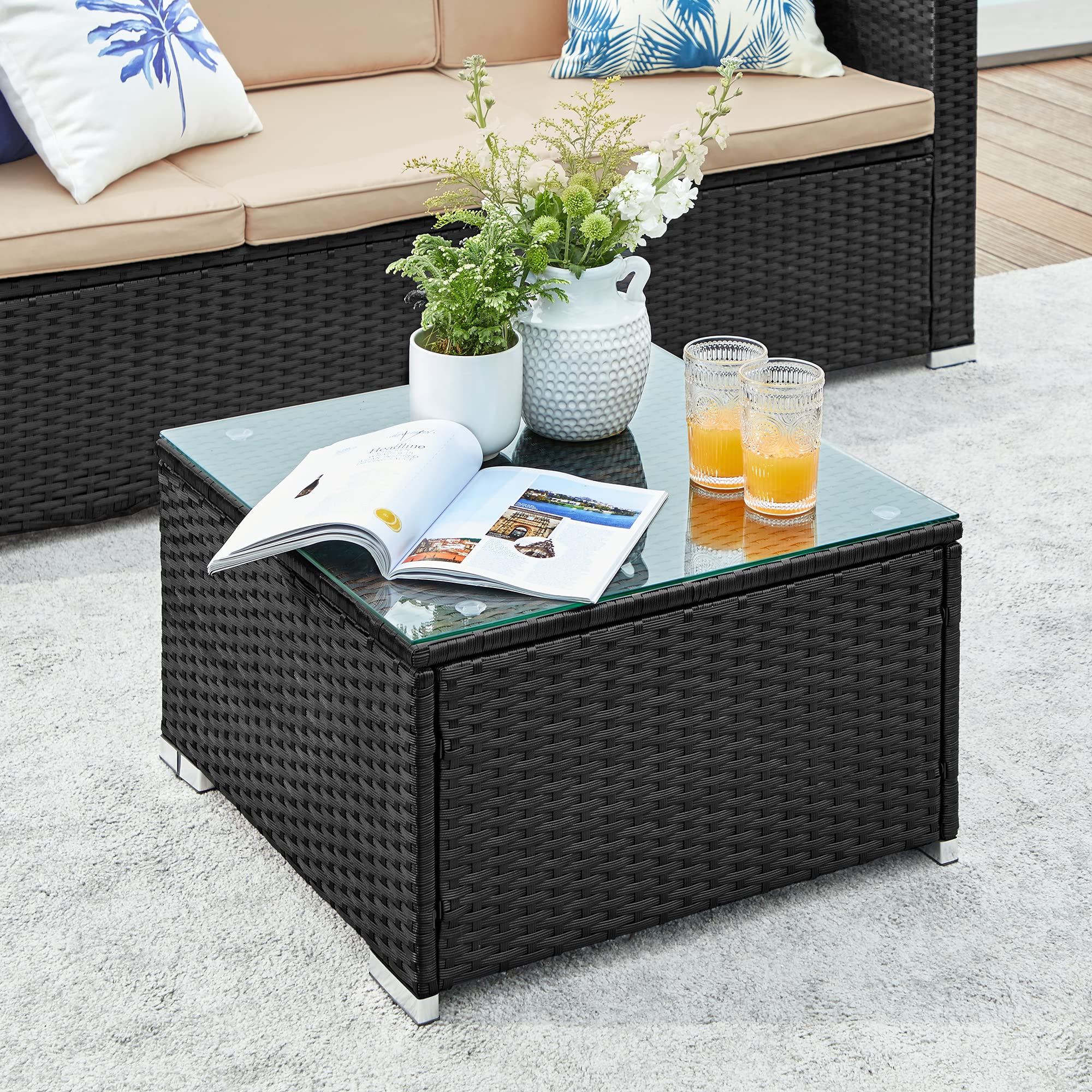- [Beständig] Dank des robusten Stahlrahmens und hochwertigen PE-Rattans garantiert dieses langlebige Gartensofa eine hohe Gebrauchsdauer und auch die Tischplatte aus Hartglas wird Sie über lange Zeit begleiten