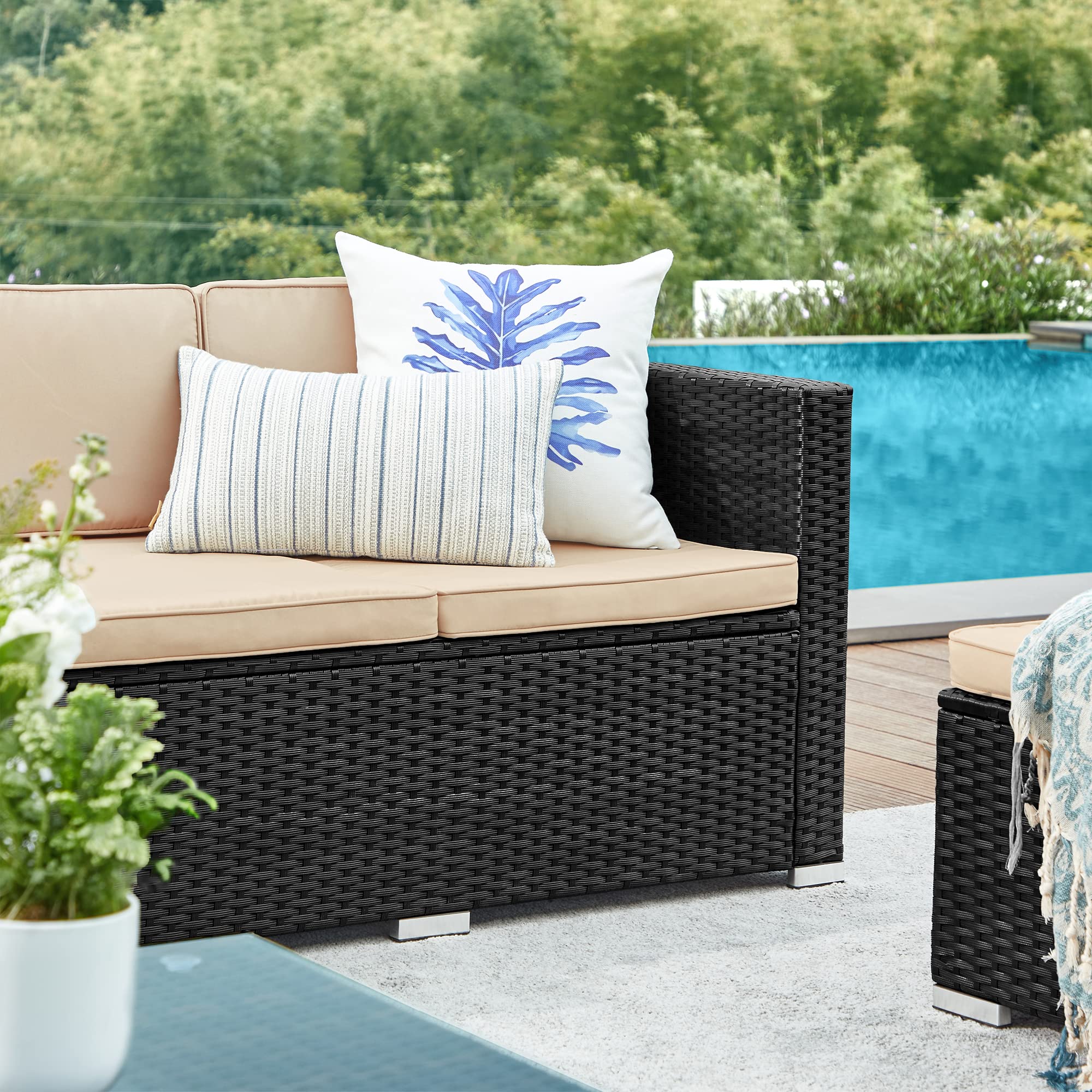 - [Flexibles Design] Das 3-Sitzer Sofa, der Hocker und der Couchtisch – Stellen Sie sie zusammen oder getrennt auf und verwenden Sie sie je nach Bedarf. Gestalten Sie Ihr Zuhause mit diesem Gartenmöbelset ganz individuell!