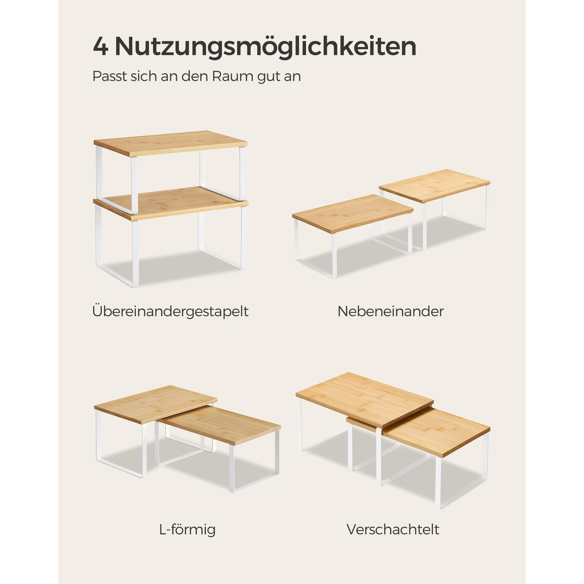 SONGMICS SONGMICS Gewürzregal, 2er-Set, Schrankregal-Organizer, erweiterbarer Küchenregal-Organizer, stapelbarer Gewürzhalter, Metall und Holzwerkstoff, Weiss und Natur KCS02NW [Wo fehlt ein Regal?] Die unordentliche Theke, der Schrank oder die Speisekammer? Bringen Sie diese 2 Regale ein, um Ihren Stauraum zu erweitern; Gewürzflaschen, Konserven – all diese Chaosstifter können gezähmt werden [Style Your Kitchen] Was passiert, wenn Holzwerkstoffe auf robustes Metall treffen? Ein bezauberndes Thekenregal-Set! Sie können es auf der Theke zur Schau stellen und es zu einem praktischen Blickfang machen, der Ihre Küche aufpeppt. [Stabilität geht nicht verloren] Unterstützt durch hochfeste Holzwerkstoffe und starkes Metall können die Thekenregale jeweils bis zu 15 kg tragen; Stellen Sie Ihr Kaffeezubehör oder Ihre Panini-Presse einfach darauf – sie können es aufnehmen. [Regale nach Ihren Wünschen] Möchten Sie sie stapeln, ineinander stecken, trennen oder in L-Form aufstellen, damit sie zu Ihrem Raum passen? Ja zu all dem! Finden Sie einfach Ihren Weg, passen Sie Ihren Stauraum individuell an und maximieren Sie Ihren Platz. [Was Sie erhalten] Ein Set aus 2 stabilen Regalen mit stapelbarem und erweiterbarem Design, einfacher Montage und einer einfachen Möglichkeit, Ihren Arbeitsflächenbereich sowie Ordnung und Stil wiederherzustellen
