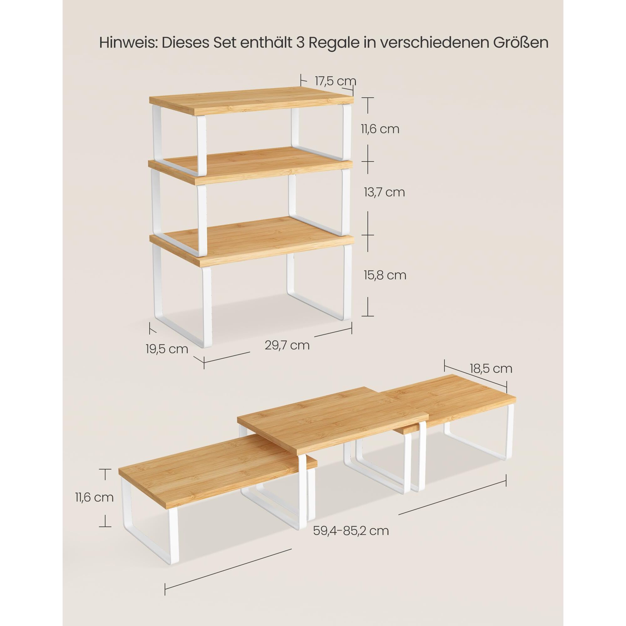 SONGMICS Gewürzregal, 3er Set Küchen-Organizer, Küchenregal, stapelbar, erweiterbar, Metall und Holzwerkstoff, wolkenweiss-naturbeige KCS014YL02
