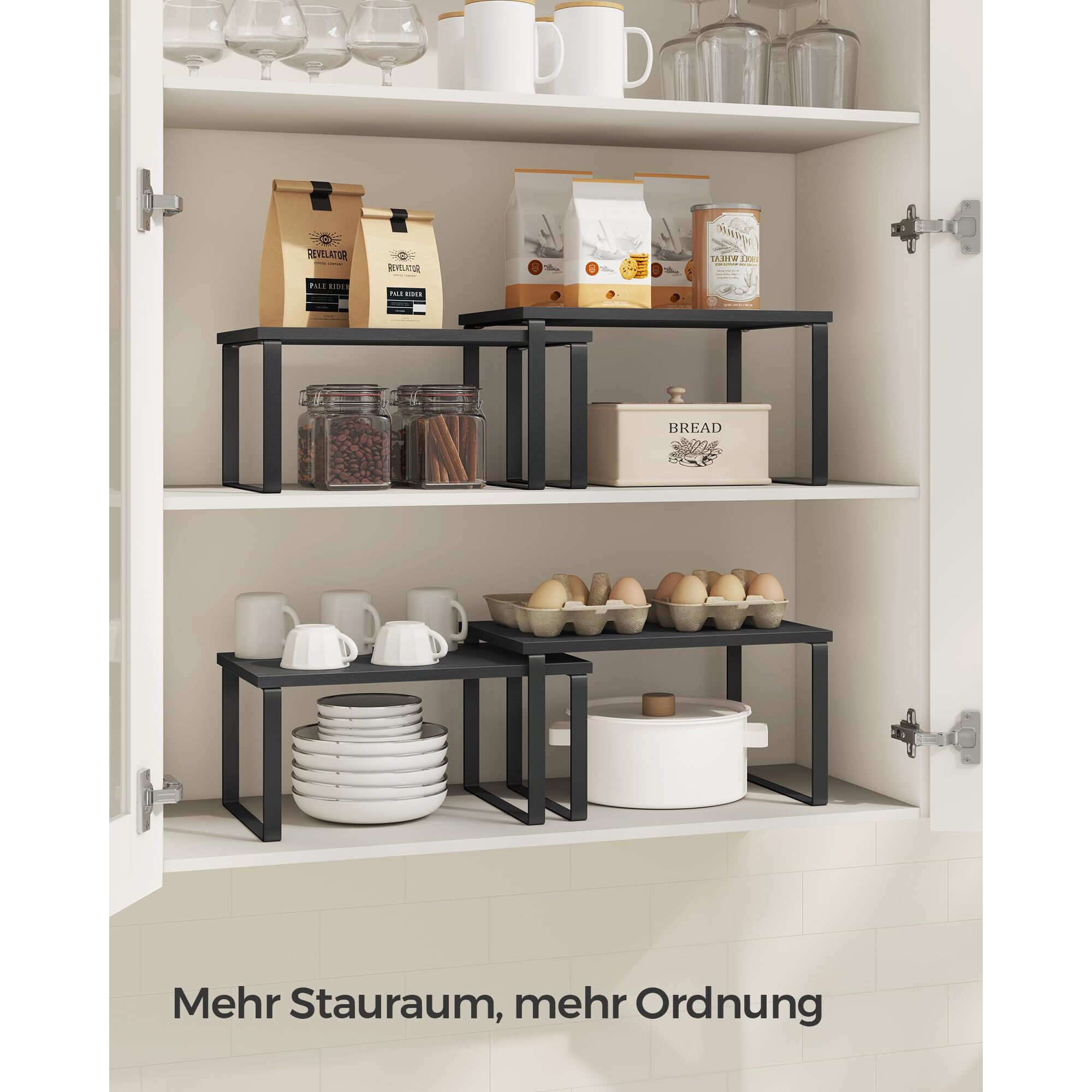 - [Was Sie bekommen] 4 elegante Aufbewahrungsregale, die Sie stapeln, erweitern oder an verschiedenen Orten aufstellen können – eine grossartige Idee, um den Platz in Ihrem Schrank oder auf Ihrer Theke zu maximieren
