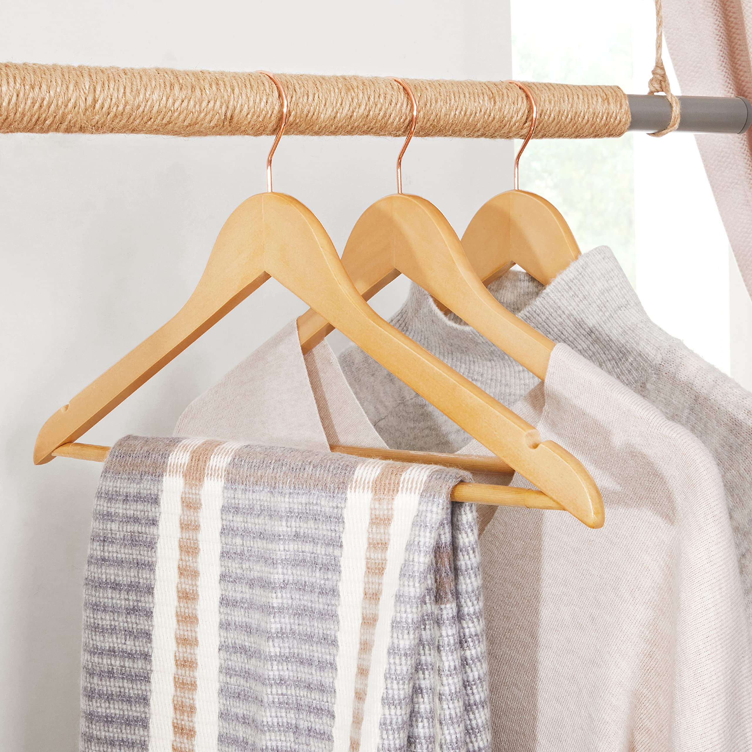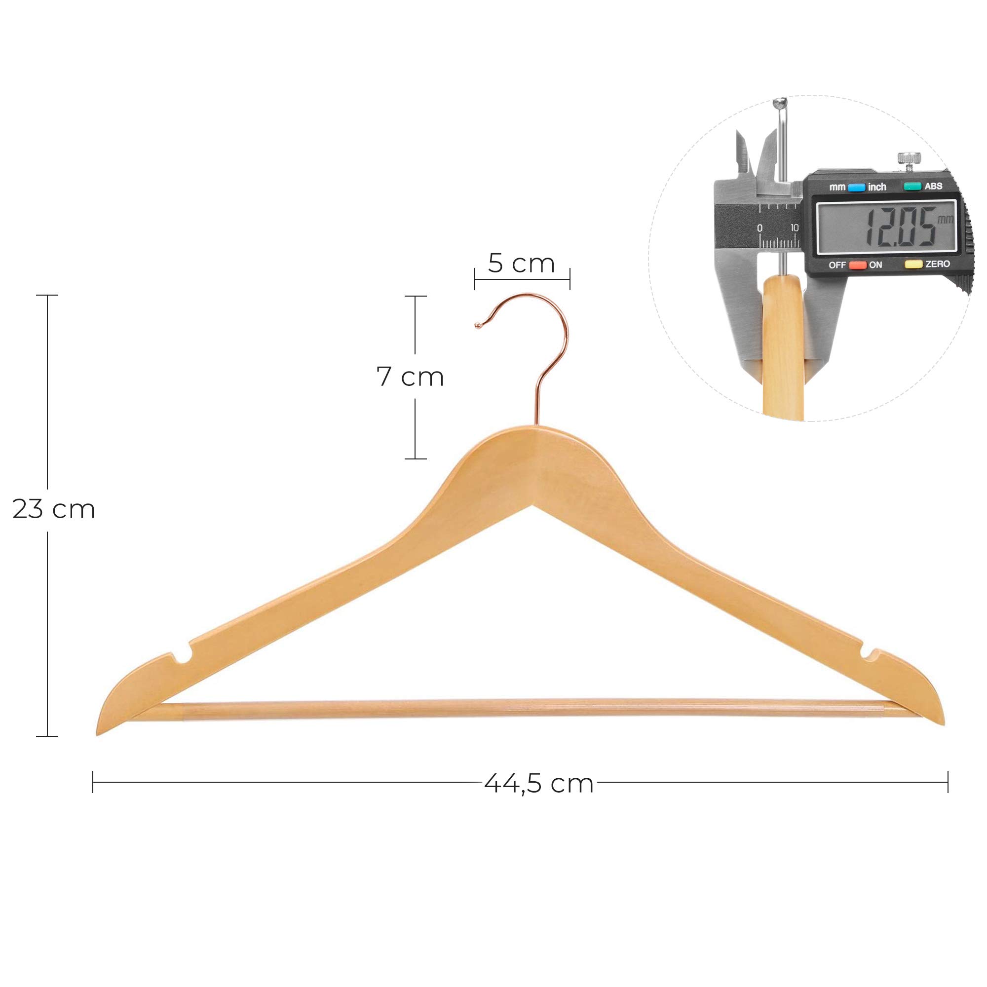 SONGMICS Kleiderbügel Holz, 20er Set, Bügel aus Massivholz, Einkerbungen im Schulterbereich, Rutschfester Hosensteg, um 360° drehbarer Haken, für Anzüge, Hemden, Holzfarben und Roségold CRW001N01