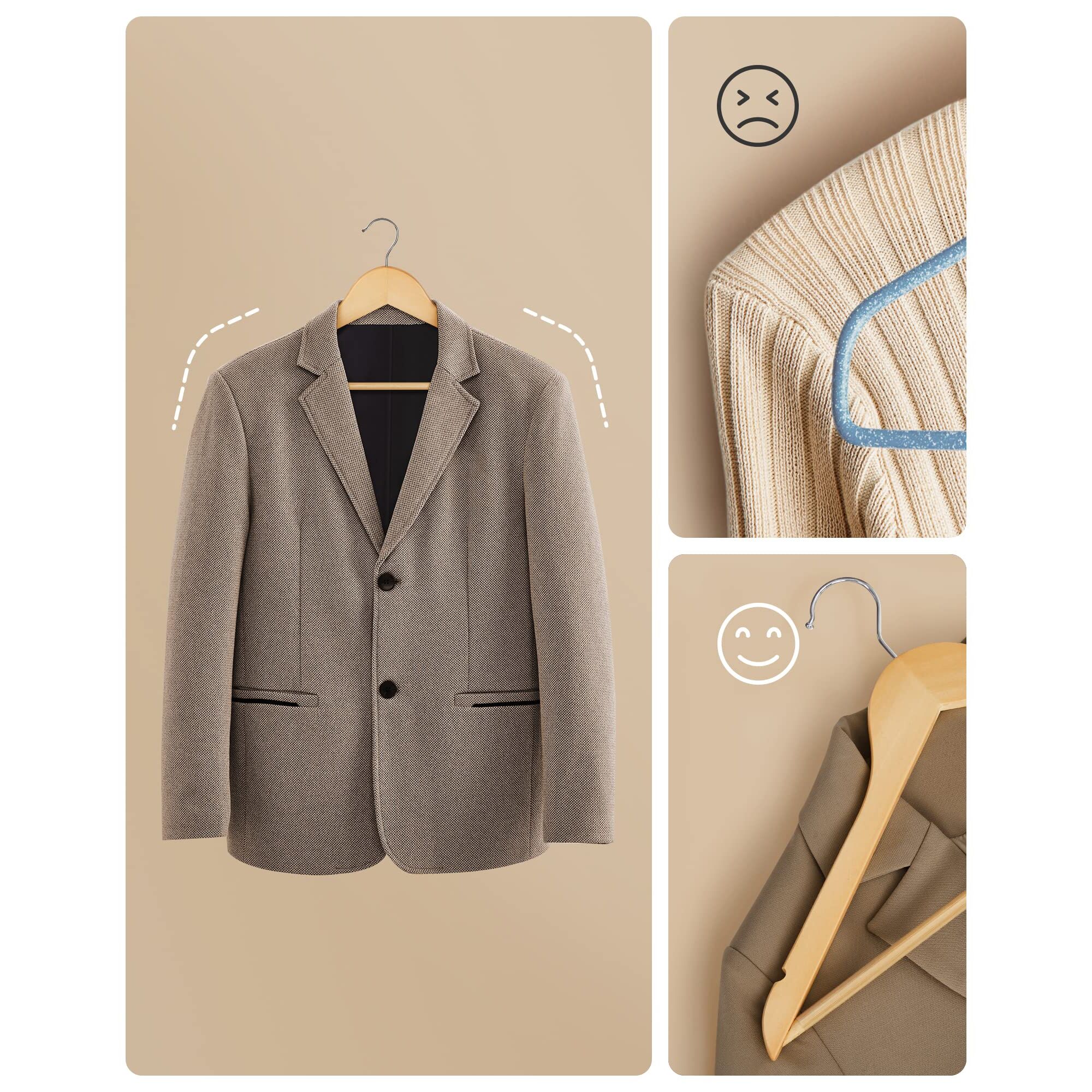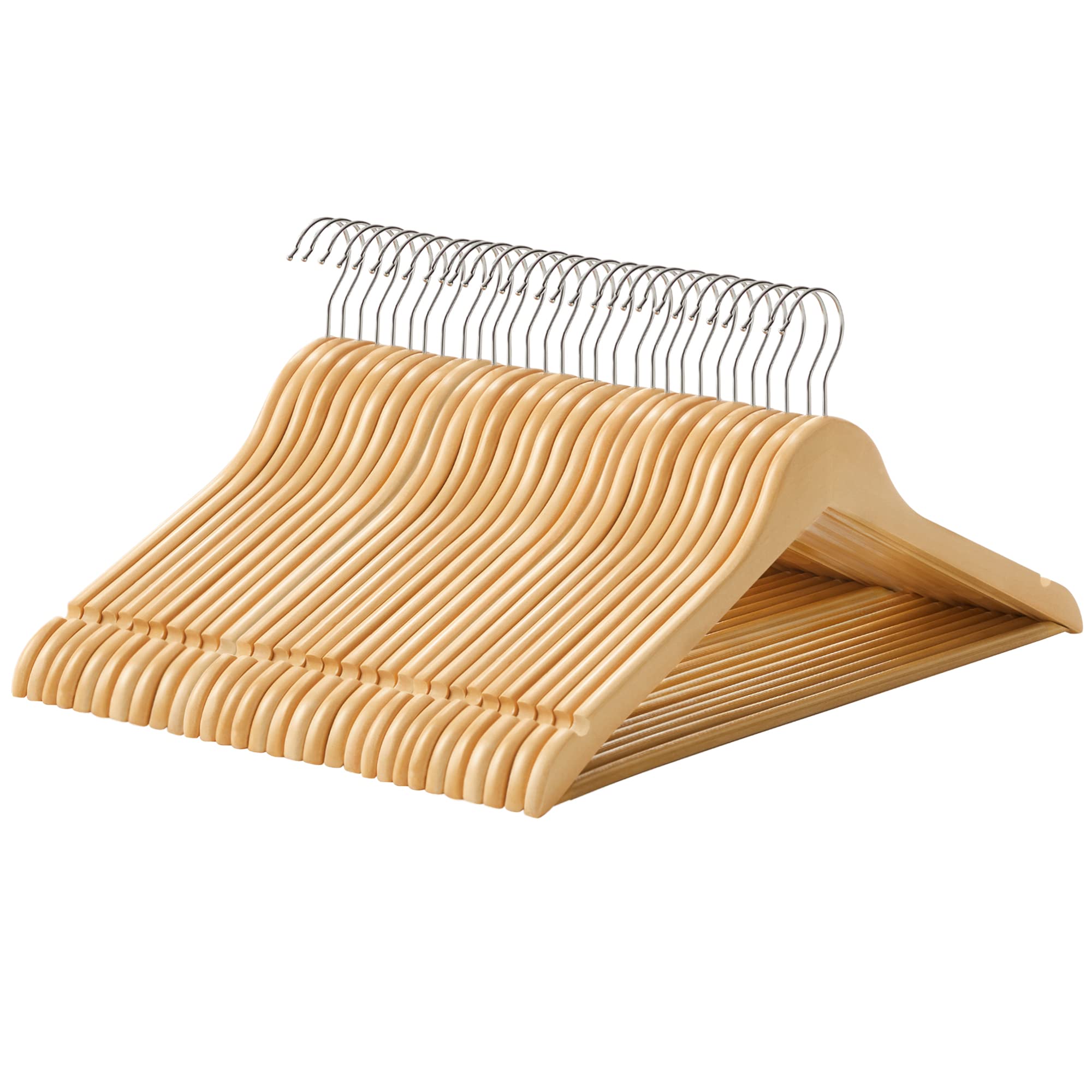 SONGMICS Kleiderbügel Holz, 30er Set, Bügel aus Massivholz, Einkerbungen im Schulterbereich, Rutschfester Hosensteg, um 360° drehbarer Haken, für Anzüge, Hemden, naturfarben-silbern CRW031NL