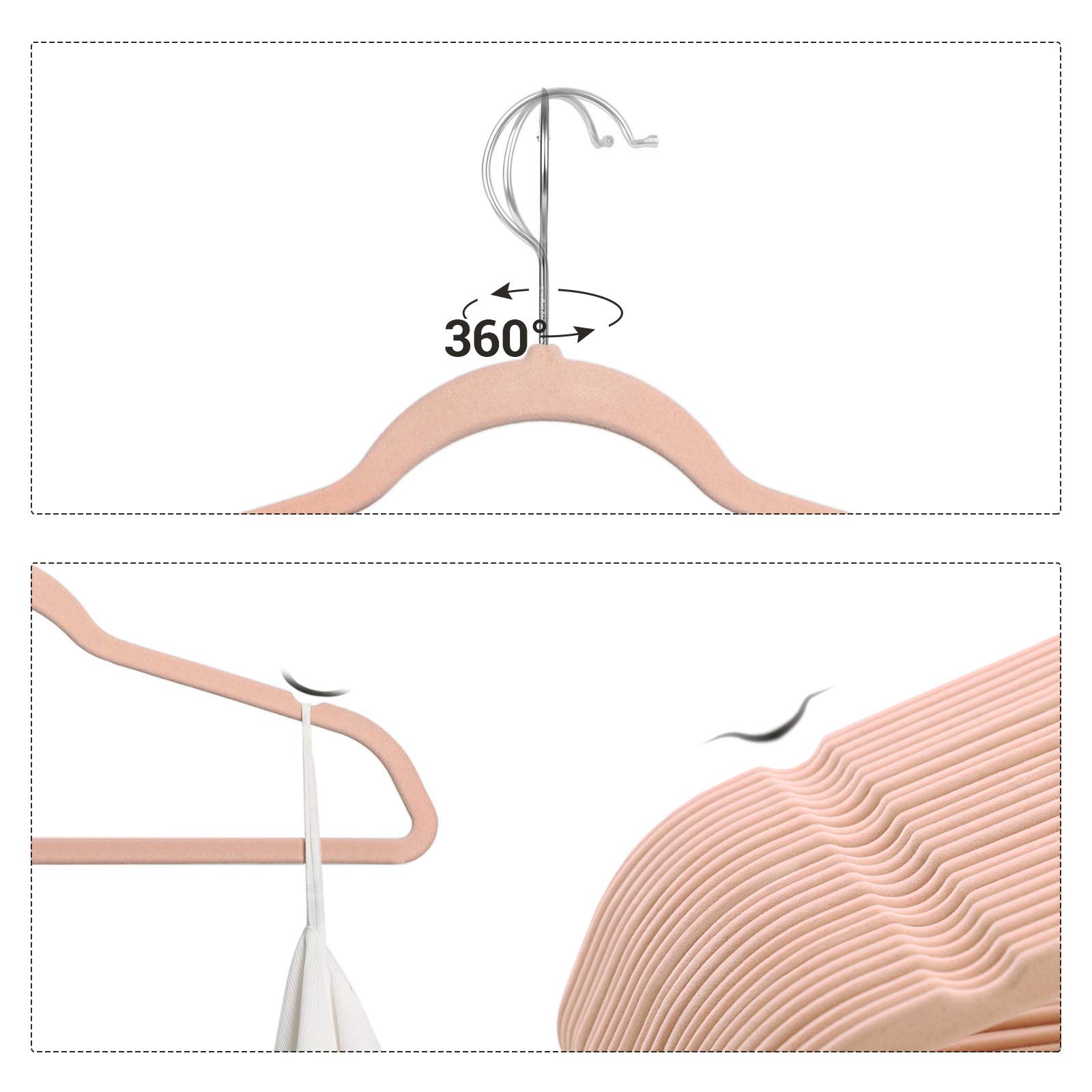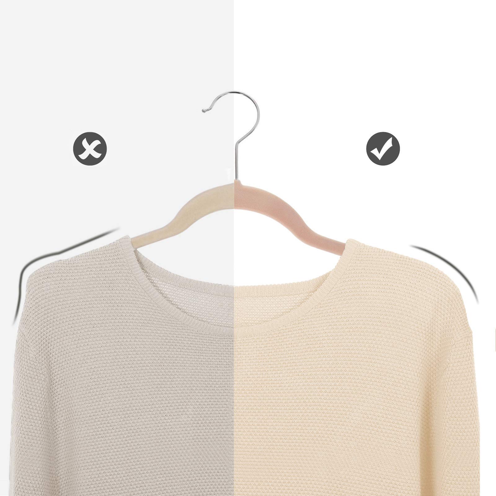 Selbst die zartesten Seidenkleider rutschen nicht von diesen Anti-Rutsch-Samtbügeln herab; Hemden beulen dank der ergonomischen Rundungen der Bügel an den Schultern nicht aus; dank der Einkerbungen im Schulterbereich passen sogar Trägertops auf diese Bügel. Der Haken ist um 360° drehbar, sodass Sie Ihre Kleidung mühelos wenden können, wenn Sie sie zufällig in die entgegensetzte Richtung aufgehängt haben sollten. Kurz gesagt, diese Bügel wurden für viele unterschiedliche Kleidungsstücke entwickelt!